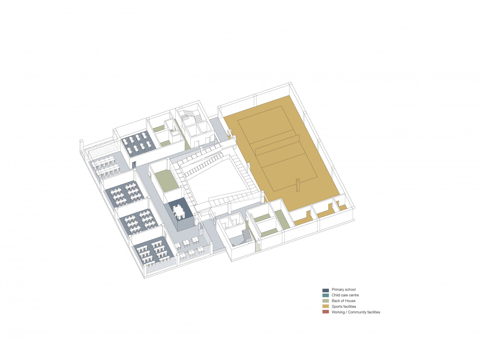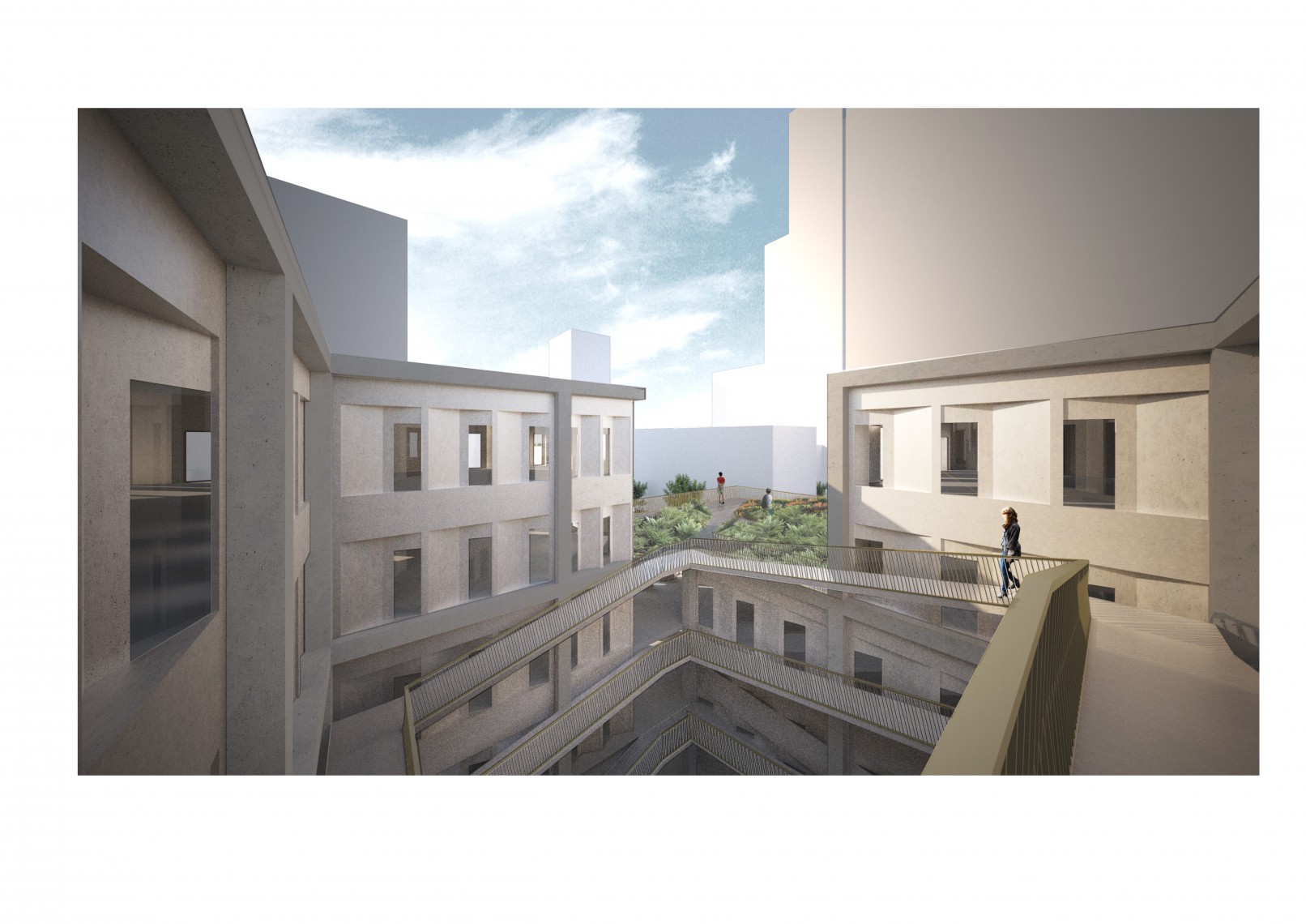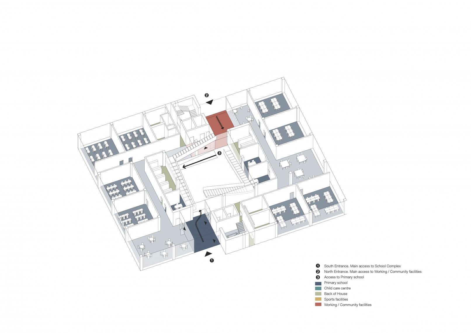 The proposal tries to achieve a design as flexible as possible. The building is split in two equal volumes, with two primary entrances to separate users at pick hours. A central courtyard guarantees daylight to all internal areas and provides an external circulation around the central courtyard connecting every storey.
