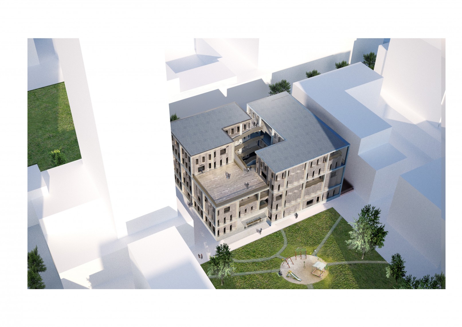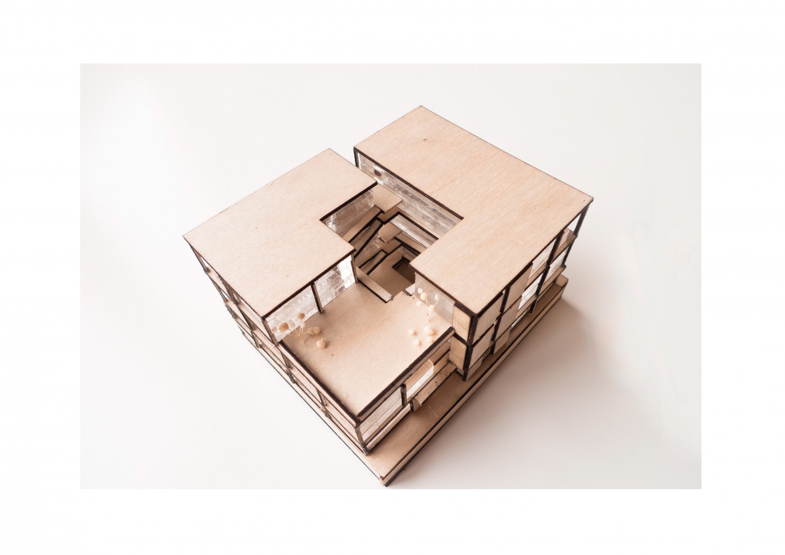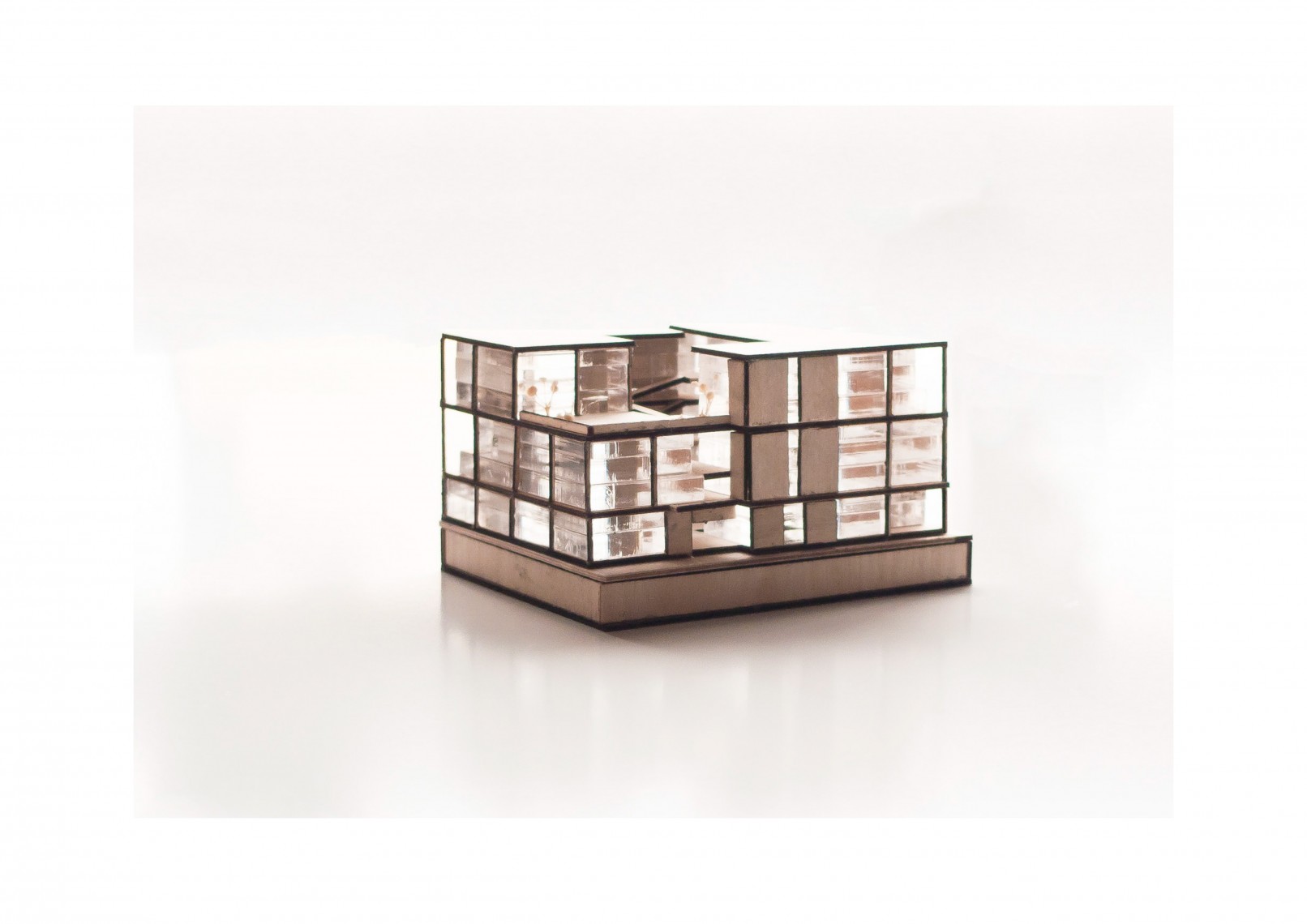 The proposal tries to achieve a design as flexible as possible. The building is split in two equal volumes, with two primary entrances to separate users at pick hours. A central courtyard guarantees daylight to all internal areas and provides an external circulation around the central courtyard connecting every storey.