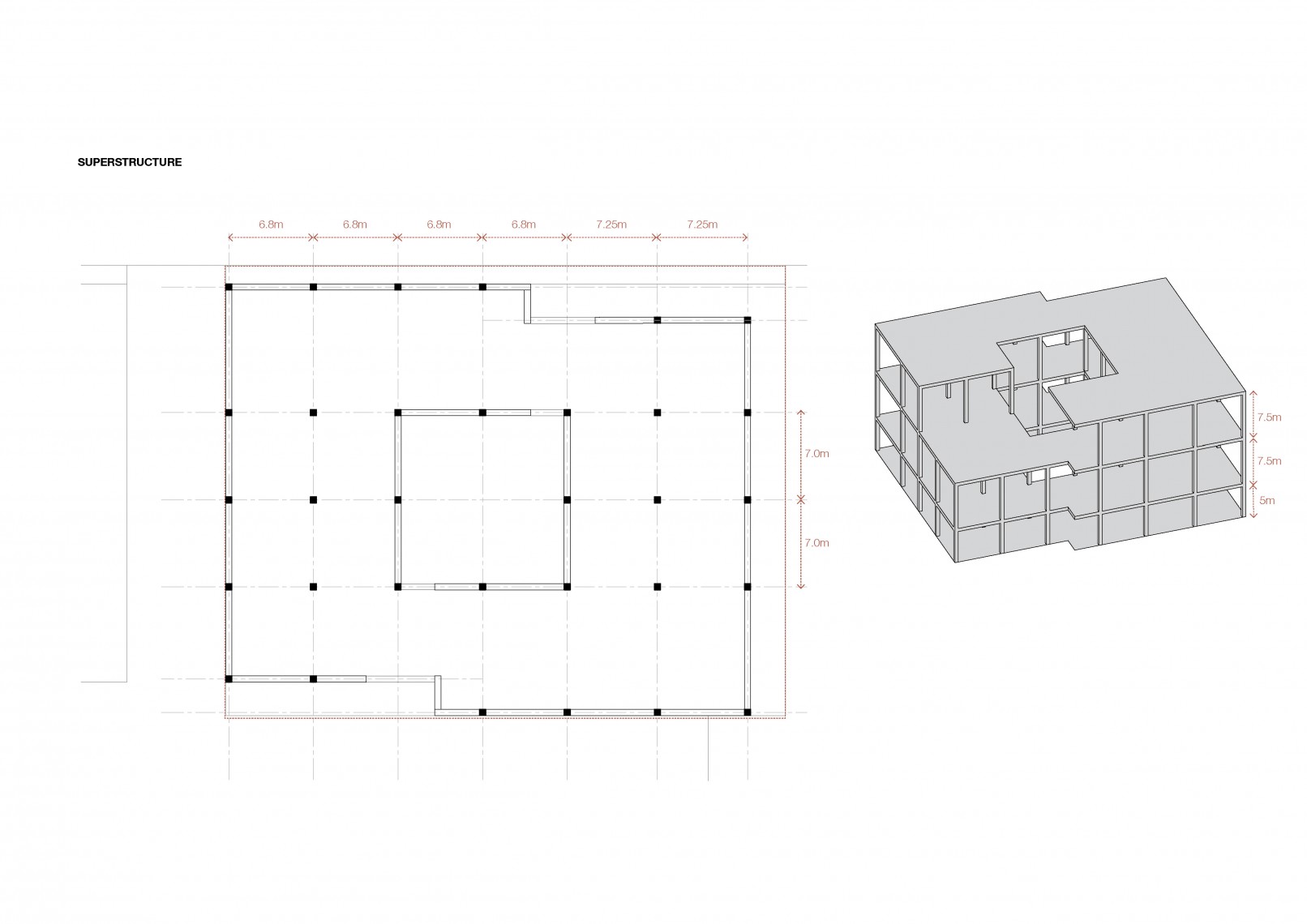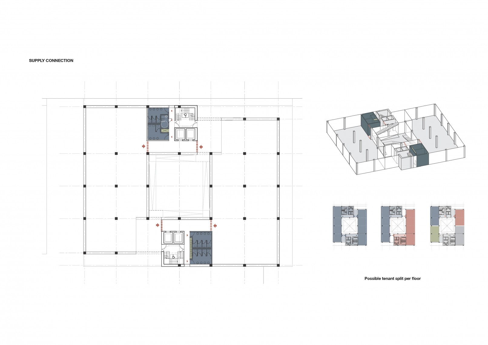 All servicing is resolved in the central axis, core and services are combined in a block next to the courtyard and the rest of the floor plate is organised in two clear pieces each of them sized 450sqm ( 14x32x7.5m (h)). The resulting space can be used in multiple ways and filled with varied programs, given the spatial flexibility and potential section split. The services block connects both volumes giving the possibility to use each level as part of one only program or with two independent uses. The building can host one only program or even 4 different per floor.