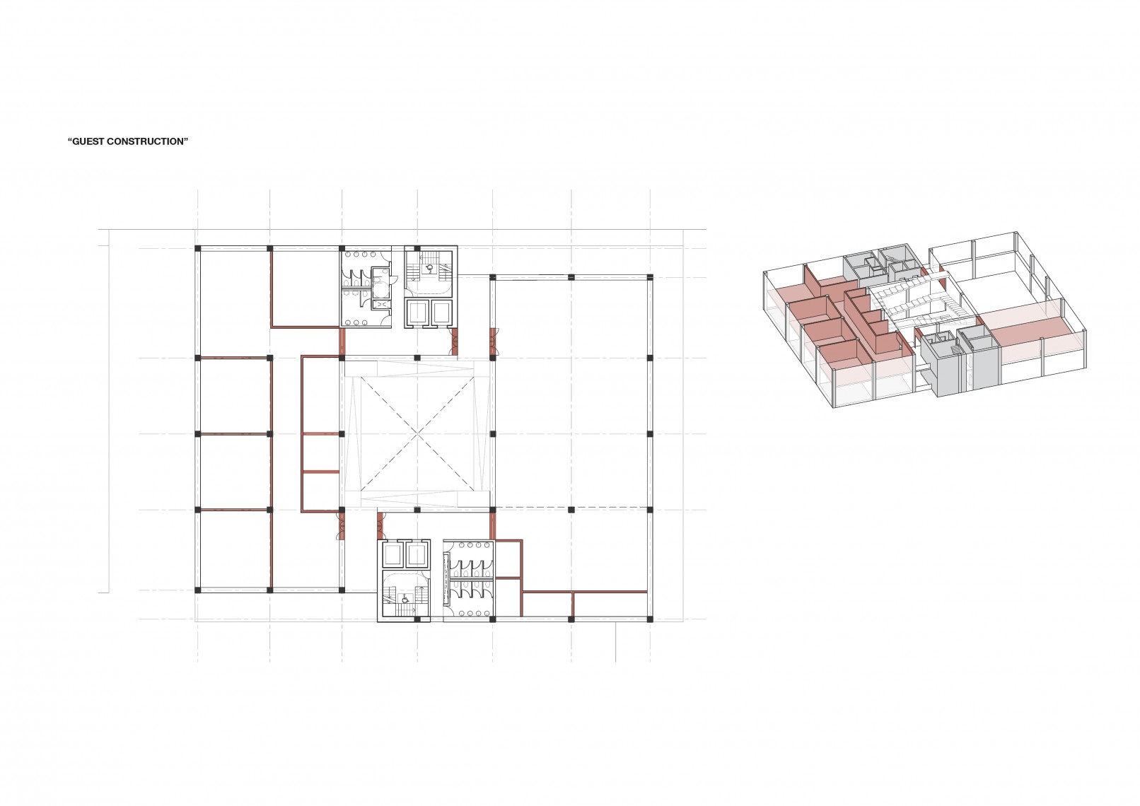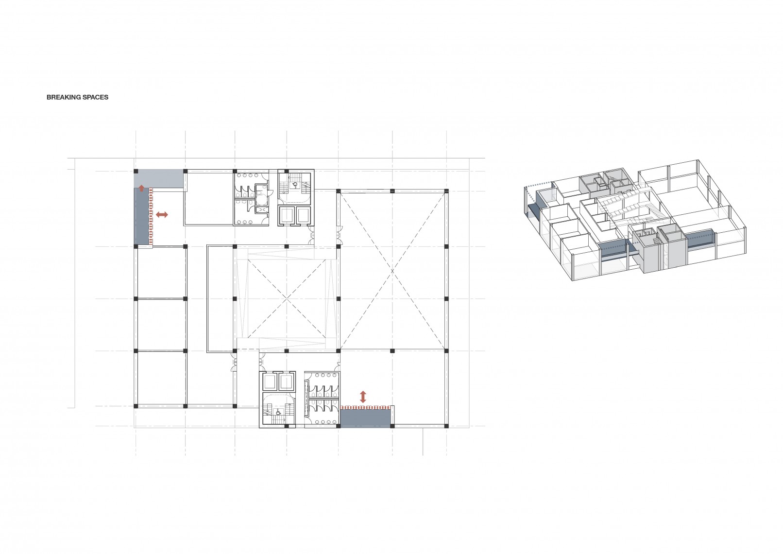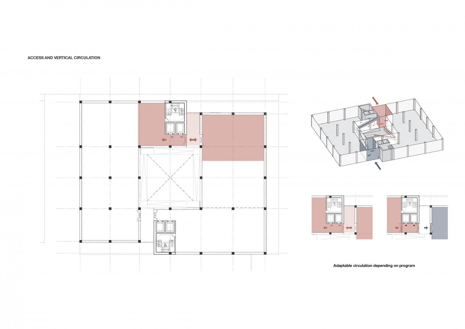 Todos los servicios se resuelven en el eje central, circulación e instalaciones se combinan en un núcleo conectado al patio, liberando el resto de la planta para su uso por parte de los distintos programas. Dos piezas rectangulares y diáfanas de 450m2 ( 14x32x7.5m (h)) alojarán las distintas funciones del edifico. La flexibilidad espacial y amplitud de sección posibilitan el uso del espacio de muy diversas maneras, pudiendo subdividirlo tanto en planta como en sección según los requisitos del programa. Además, el núcleo de servicios conecta ambas piezas de manera que estas puedan funcionar en cada planta como elementos independientes o como parte del mismo programa; el edificio podrá ocuparse enteramente con un único programa o hasta 4 usuarios por nivel.