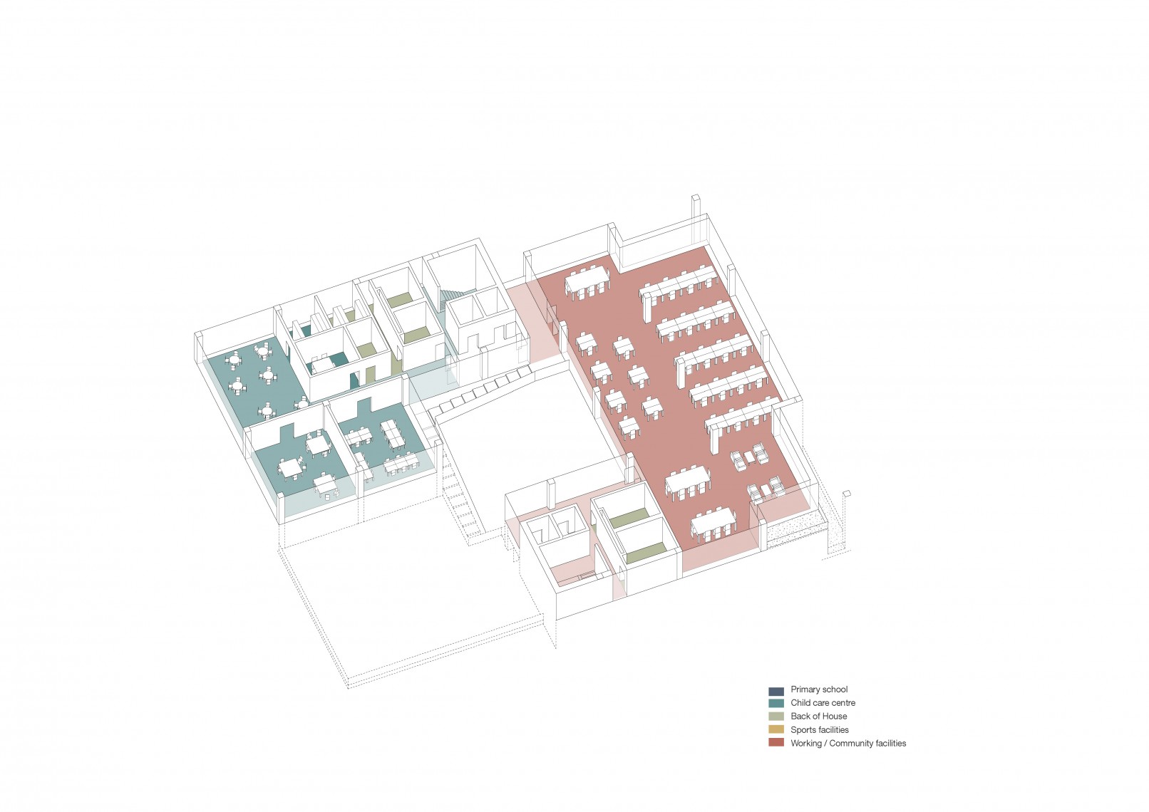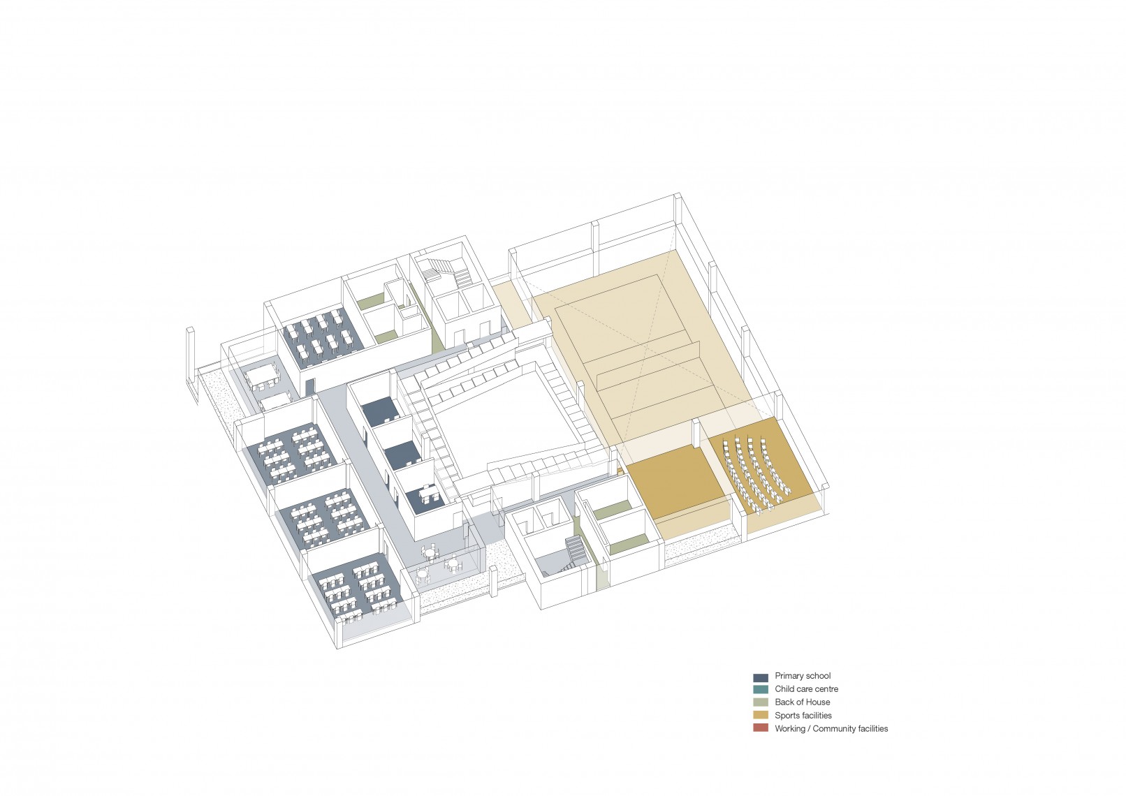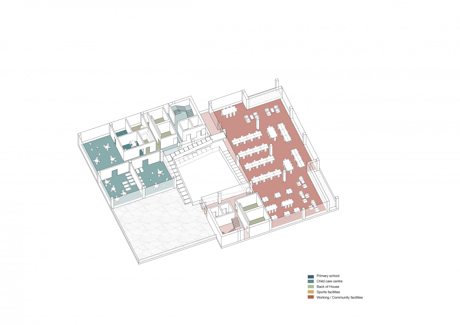 La propuesta se centra en desarrollar un edifico público y multifuncional lo mas flexible y adaptable posible. El volumen se divide en dos piezas simétricas, con dos accesos diferentes para posibilitar la segregación de usuarios según programas en horas punta. Un patio central garantiza la iluminación natural a todas las estancias y da acceso exterior a todos los niveles.