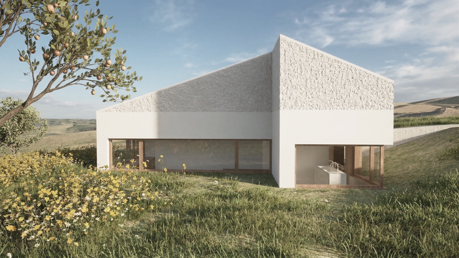 It blends quietly into its rural surroundings, with a textured concrete façade that anchors it into the land through a rich tectonic dialogue. In our office, this project also marked the first use of spray-applied cork, introduced to create a subtle contrast in texture between the frieze and the main façade plane.