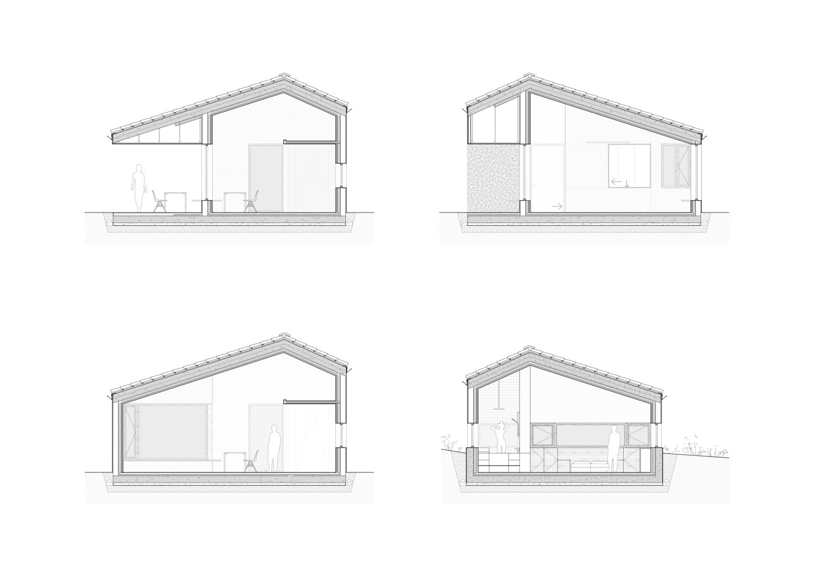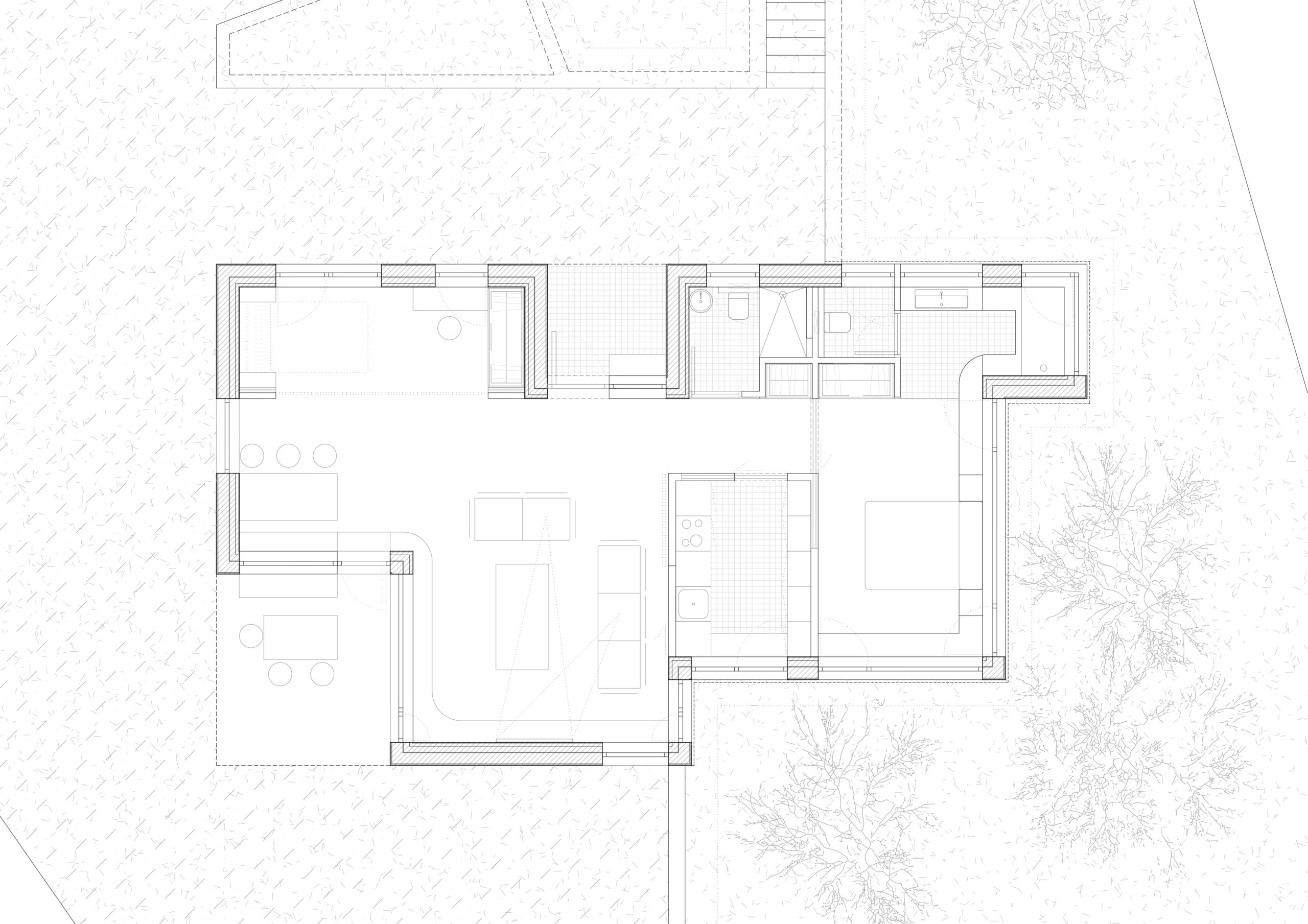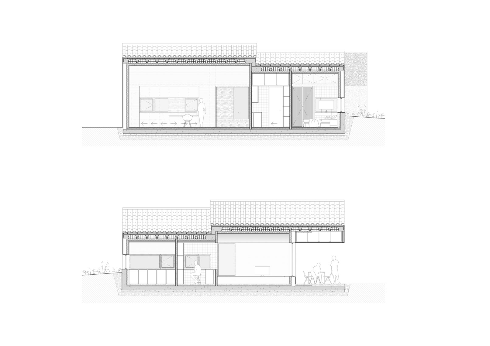 Part of the night area is partially buried into the slope, allowing the garden to sit flush with the interior and gently seep into the house when it’s time to rest.
