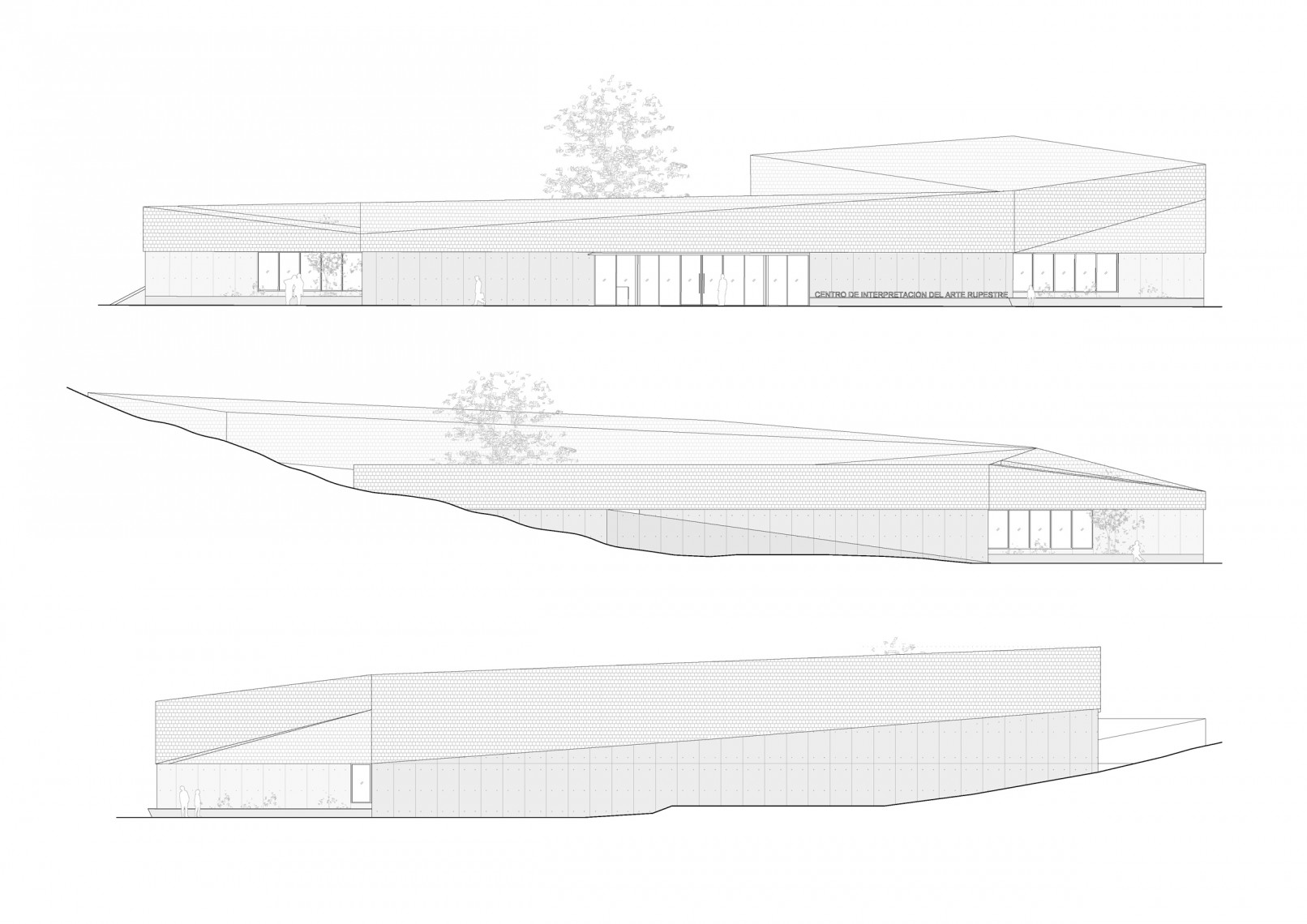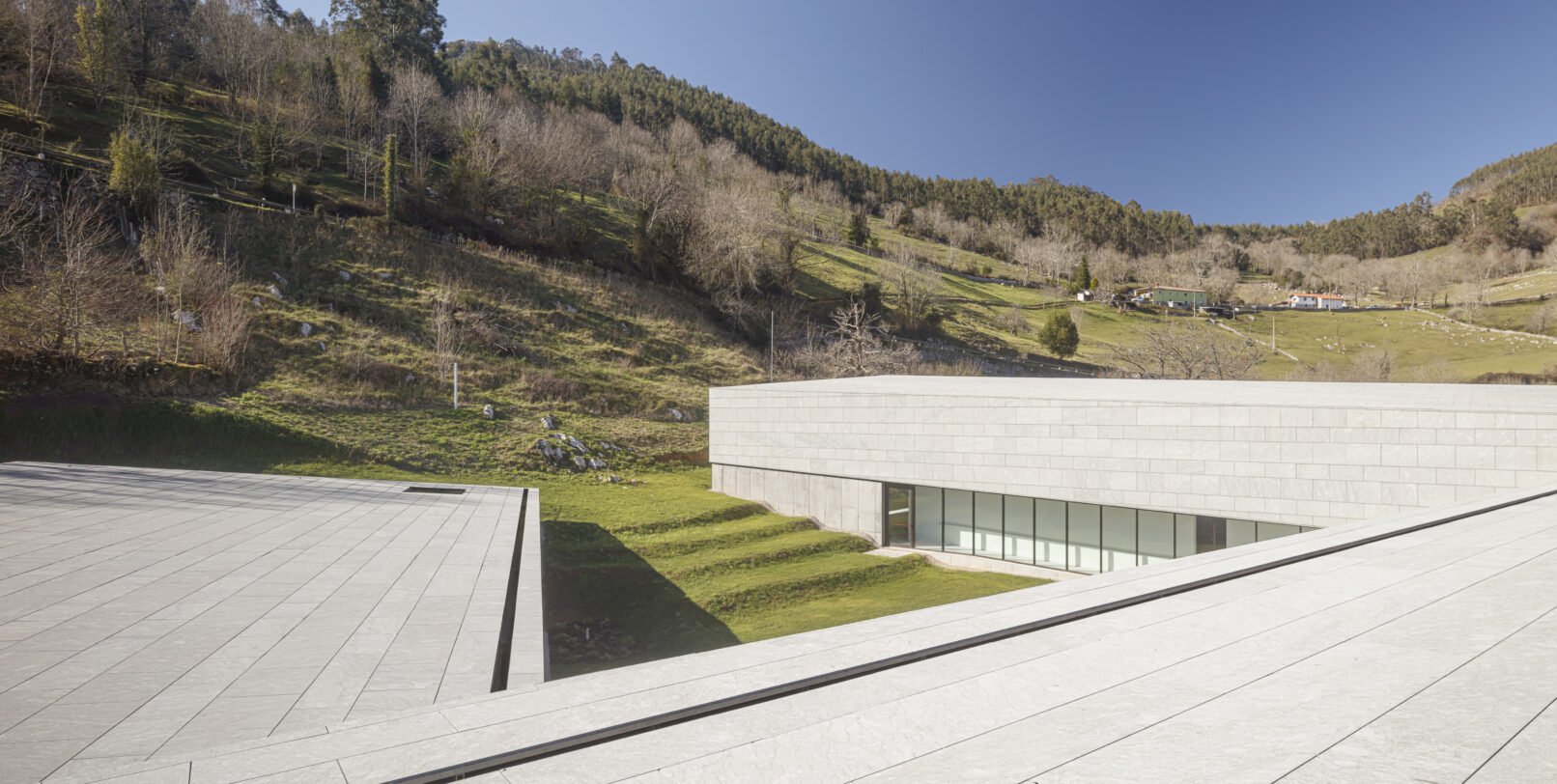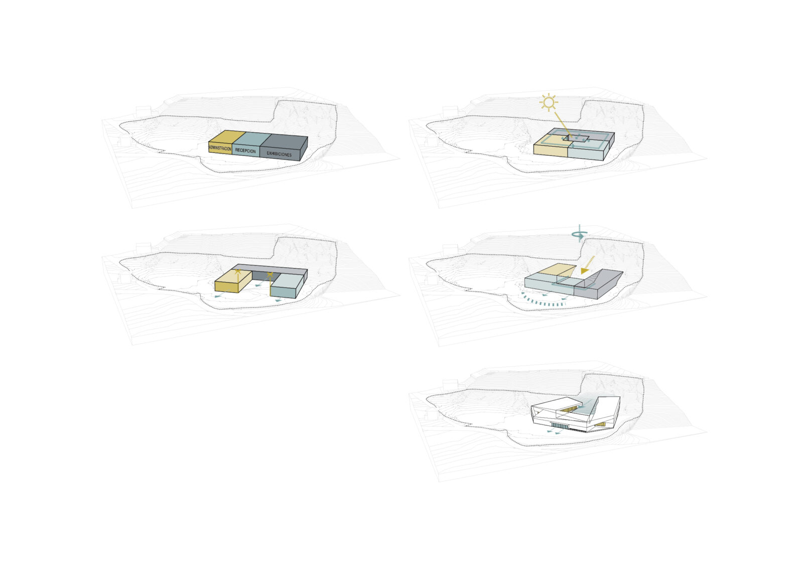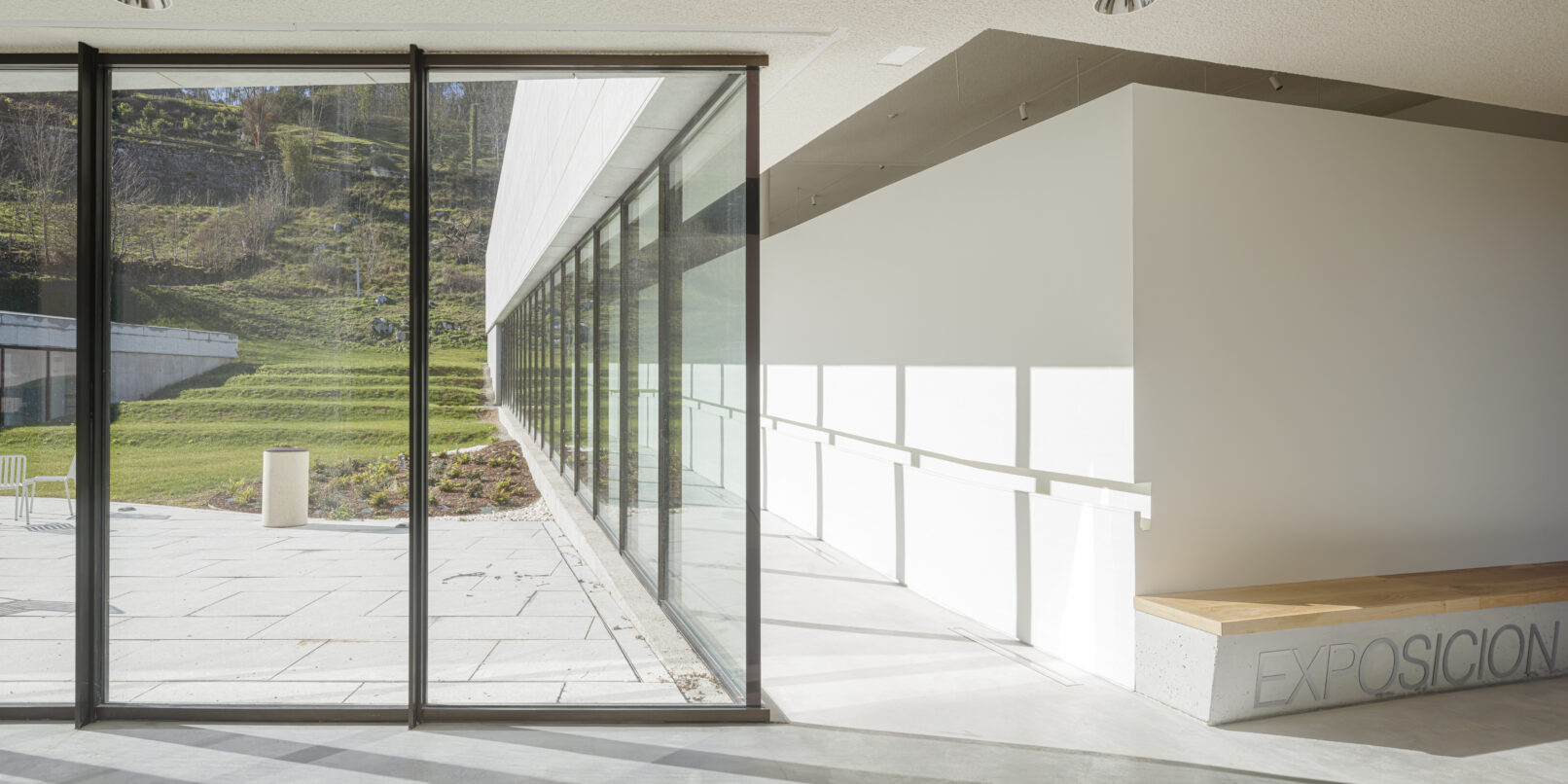 Se agrupan los espacios en tres bloques diferenciados: área de recepción y servicios, zona de exhibiciones y área restringida. Los tres volúmenes se articulan y organizan en torno a un patio central, que distribuye y conecta las diferentes estancias. El volumen resultante, en forma de “C” se enfrenta a la pendiente natural de la parcela, que cierra el edificio creando un “graderío verde”. La montaña pasa así a formar parte del programa, se convierte en protagonista y elemento articulador del edificio, invitando al visitante a salir al exterior y actuando como una extensión al aire libre de las actividades del centro.