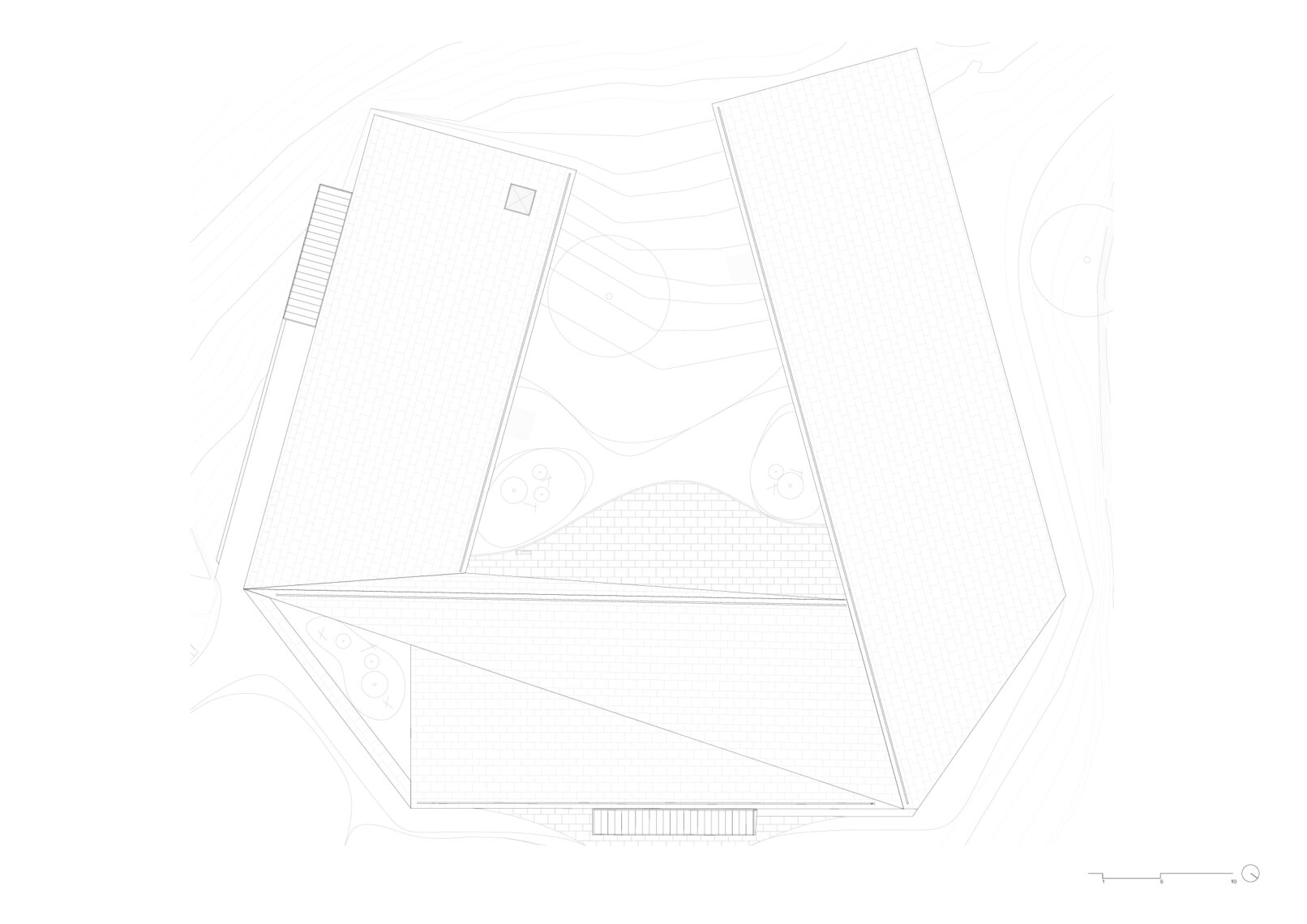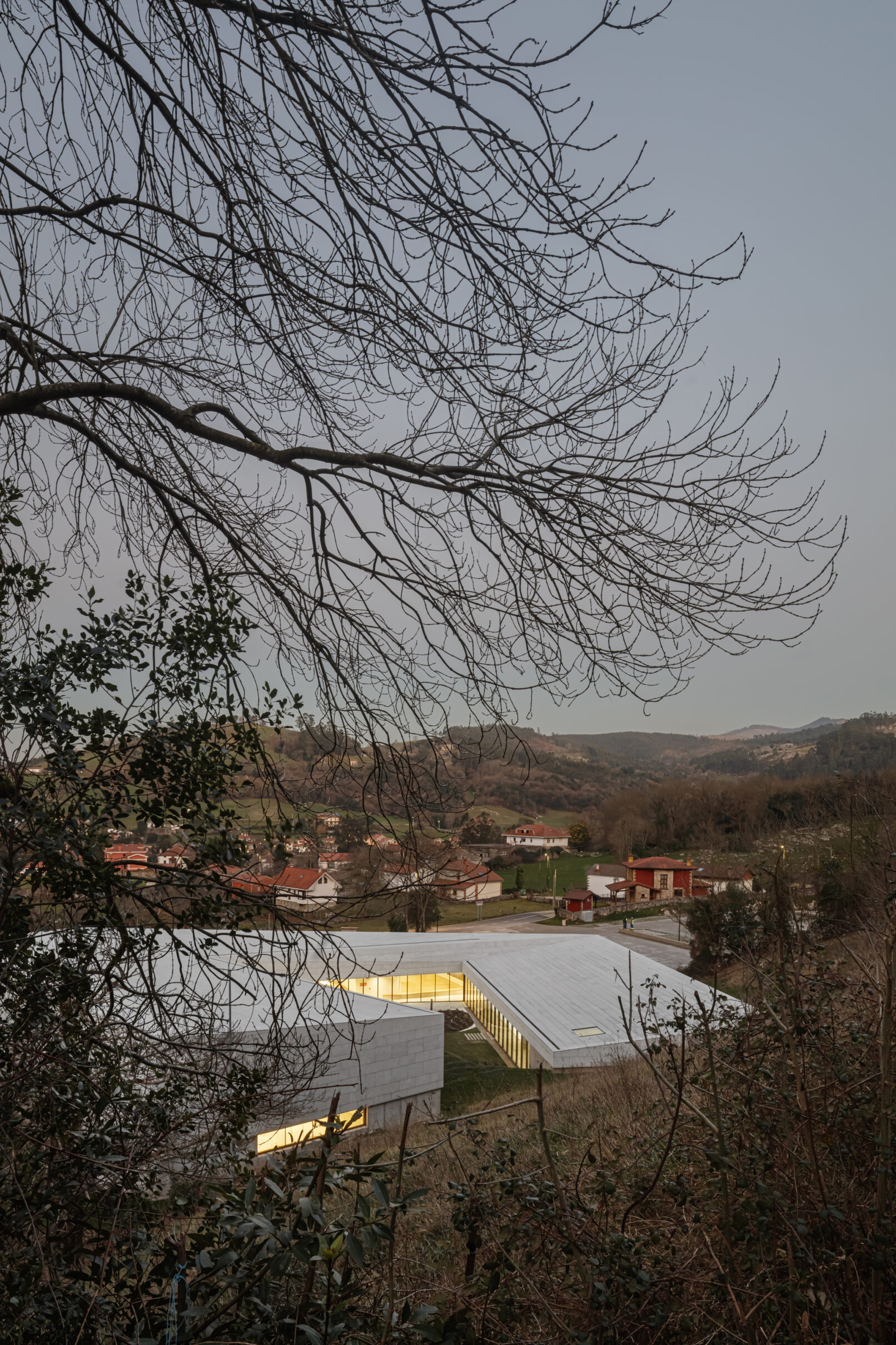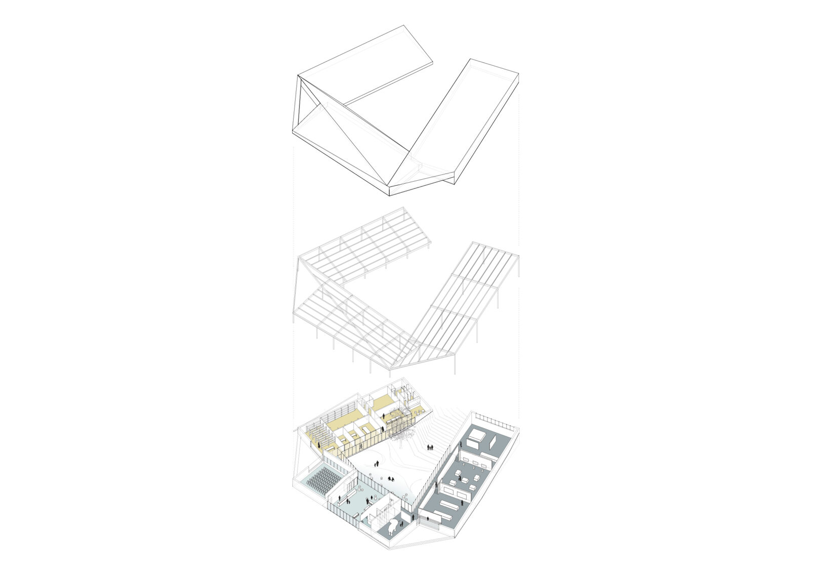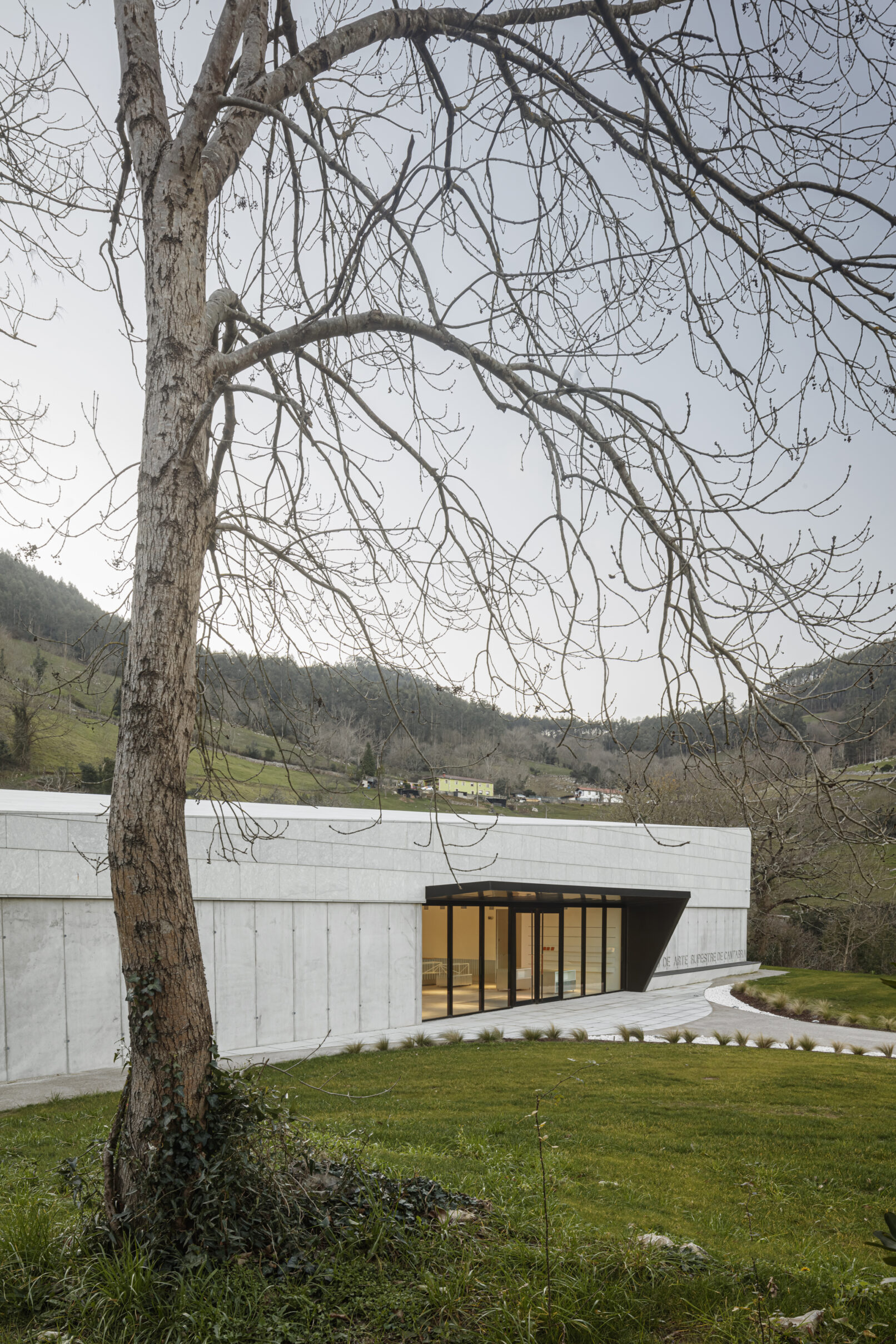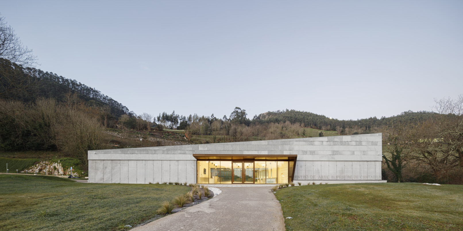 Se agrupan los espacios en tres bloques diferenciados: área de recepción y servicios, zona de exhibiciones y área restringida. Los tres volúmenes se articulan y organizan en torno a un patio central, que distribuye y conecta las diferentes estancias. El volumen resultante, en forma de “C” se enfrenta a la pendiente natural de la parcela, que cierra el edificio creando un “graderío verde”. La montaña pasa así a formar parte del programa, se convierte en protagonista y elemento articulador del edificio, invitando al visitante a salir al exterior y actuando como una extensión al aire libre de las actividades del centro.