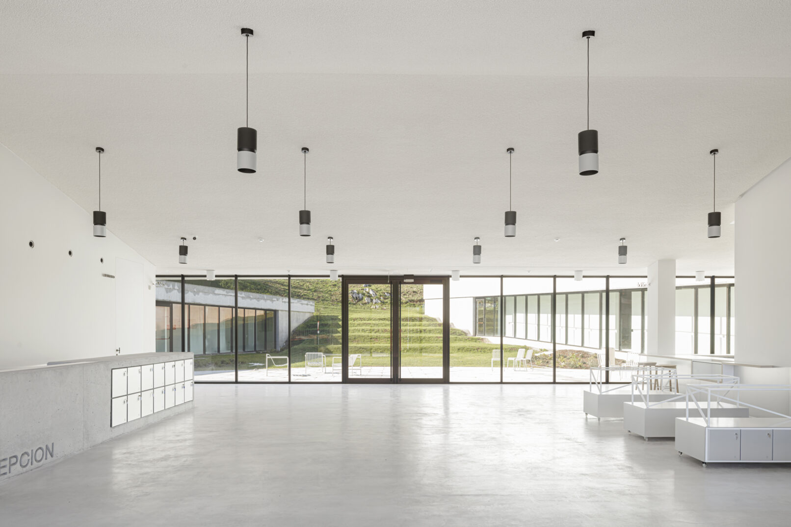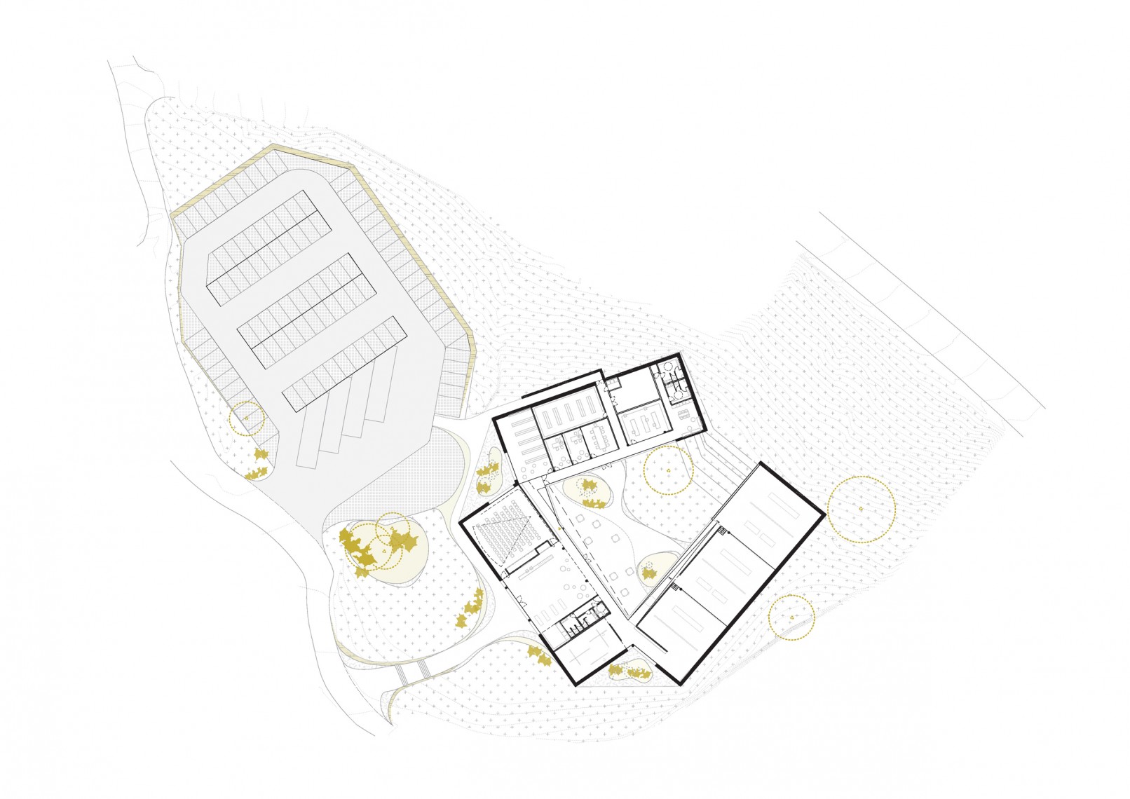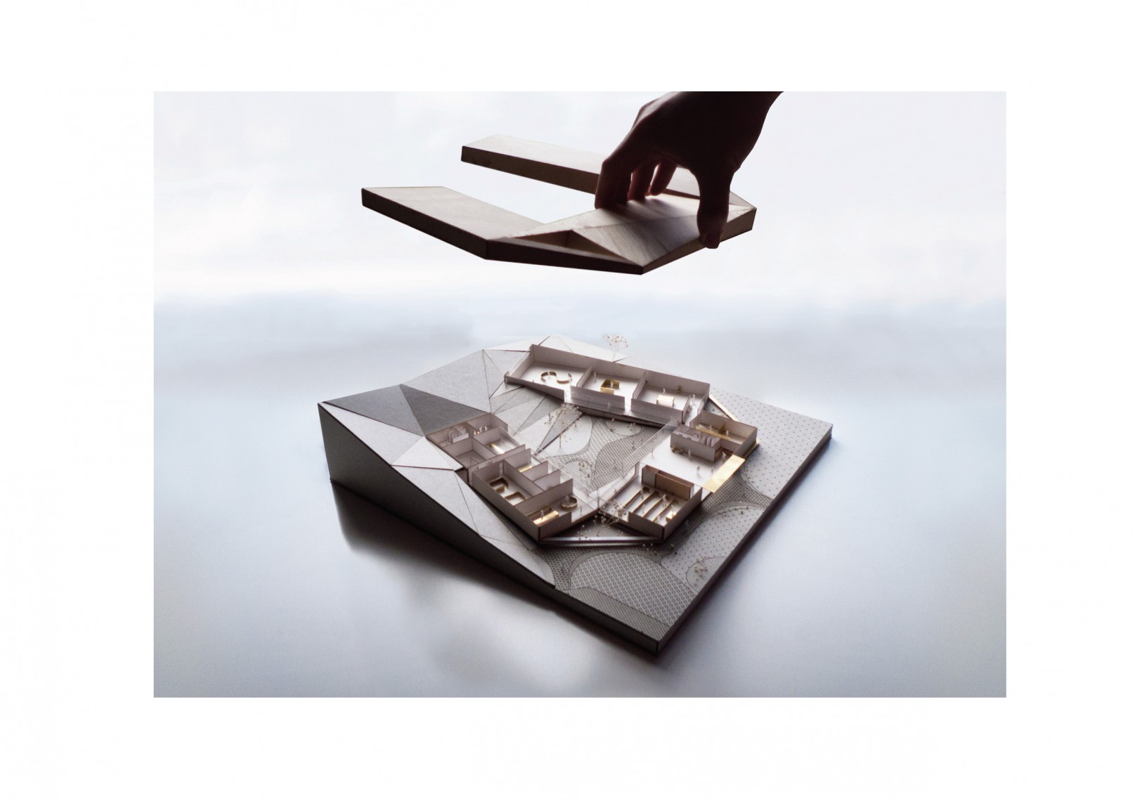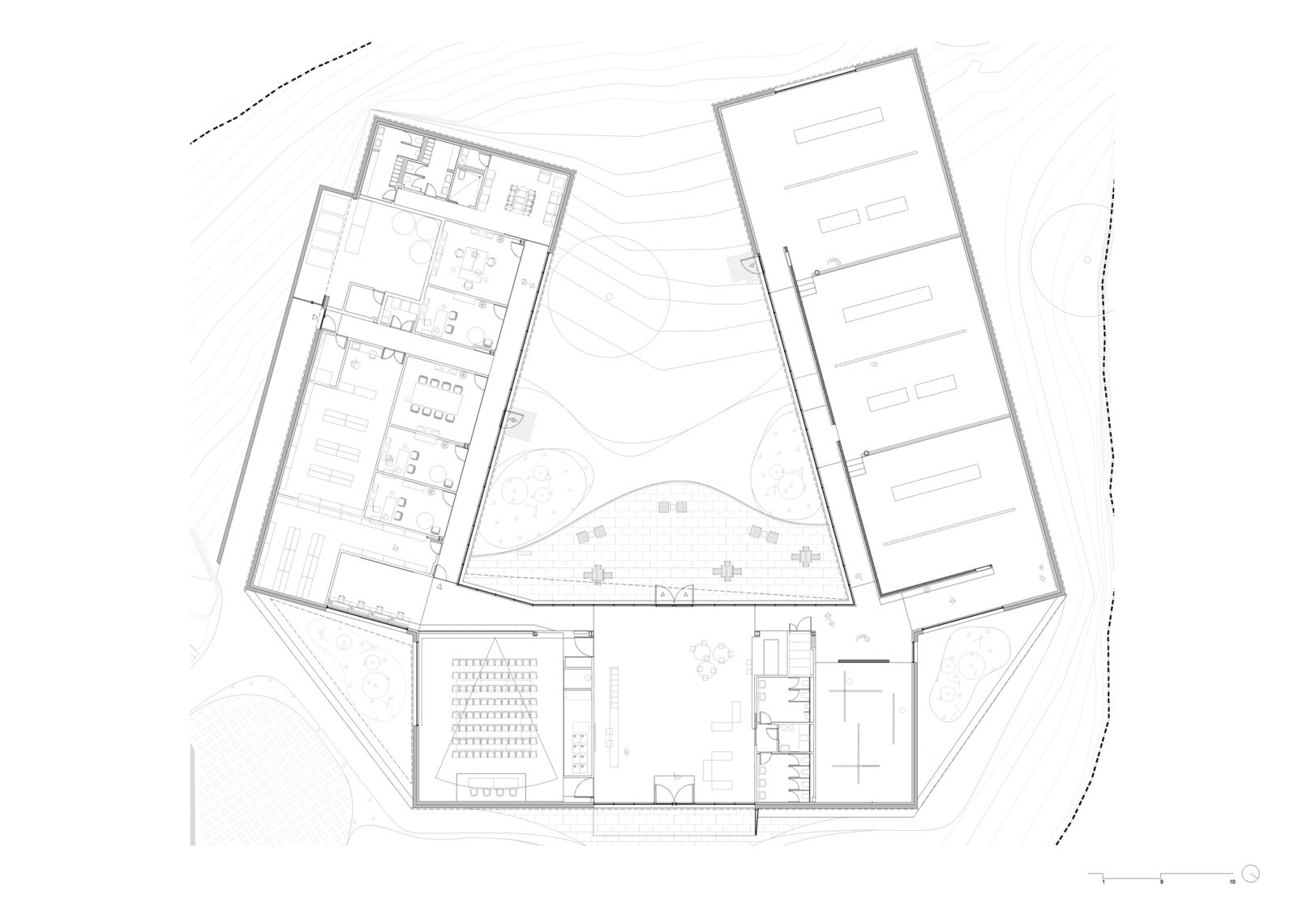 Se agrupan los espacios en tres bloques diferenciados: área de recepción y servicios, zona de exhibiciones y área restringida. Los tres volúmenes se articulan y organizan en torno a un patio central, que distribuye y conecta las diferentes estancias. El volumen resultante, en forma de “C” se enfrenta a la pendiente natural de la parcela, que cierra el edificio creando un “graderío verde”. La montaña pasa así a formar parte del programa, se convierte en protagonista y elemento articulador del edificio, invitando al visitante a salir al exterior y actuando como una extensión al aire libre de las actividades del centro.