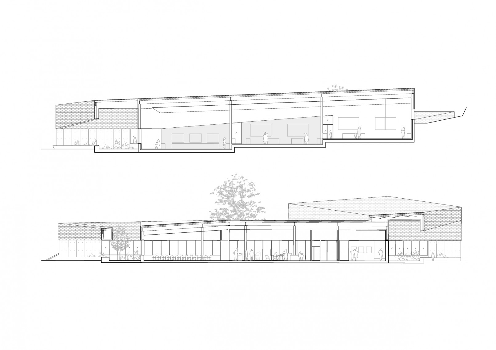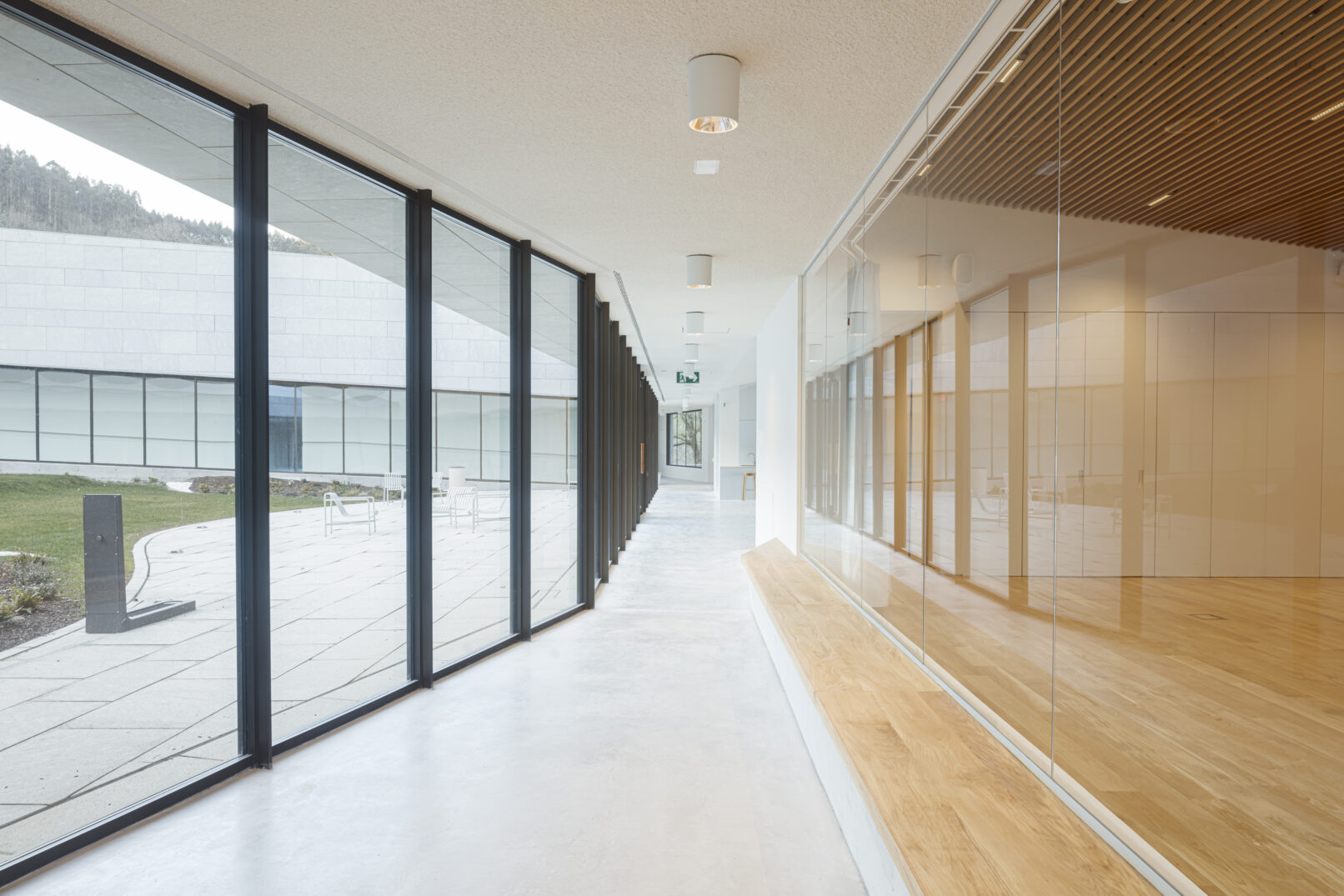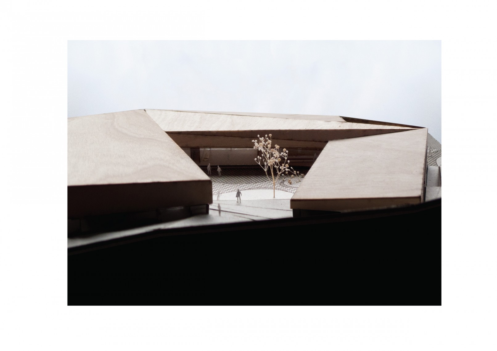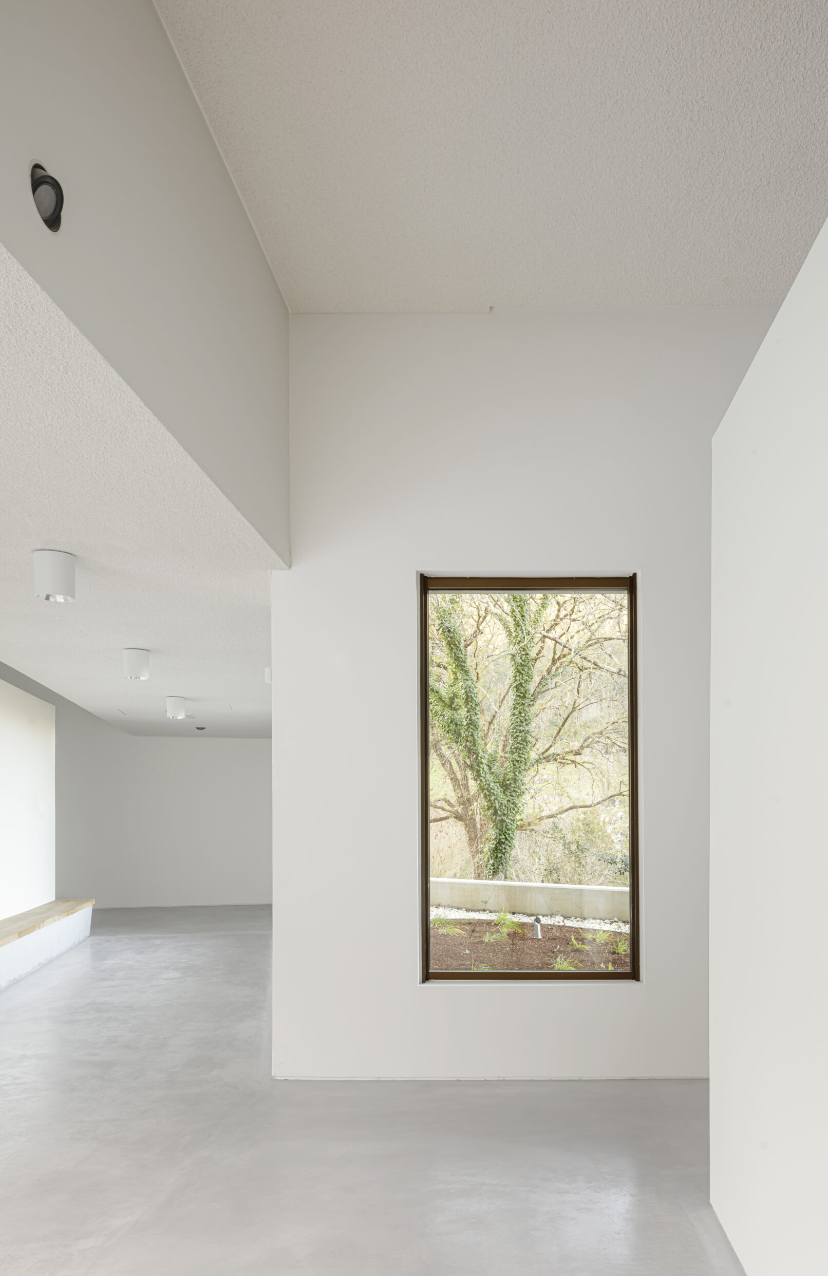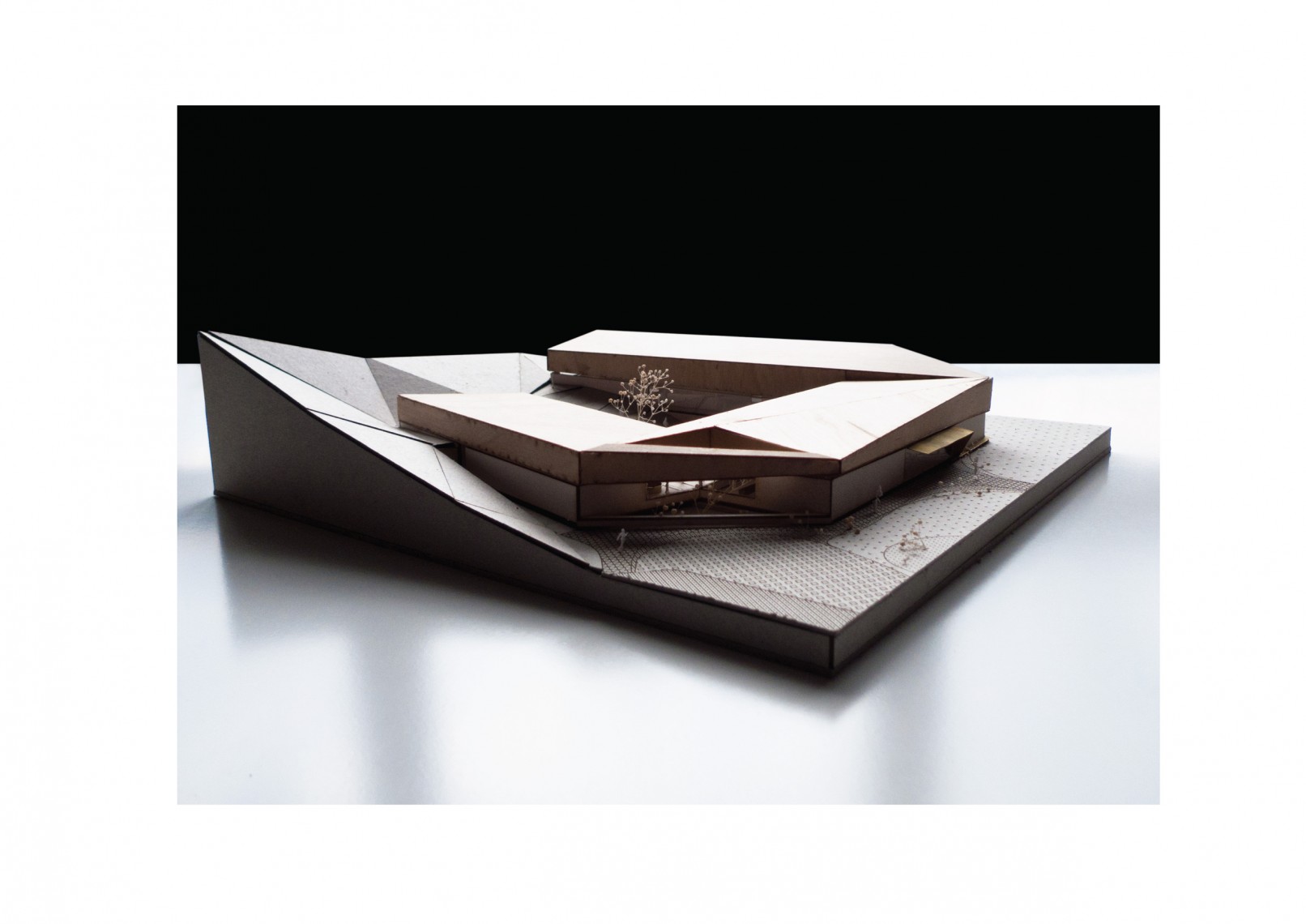 Se agrupan los espacios en tres bloques diferenciados: área de recepción y servicios, zona de exhibiciones y área restringida. Los tres volúmenes se articulan y organizan en torno a un patio central, que distribuye y conecta las diferentes estancias. El volumen resultante, en forma de “C” se enfrenta a la pendiente natural de la parcela, que cierra el edificio creando un “graderío verde”. La montaña pasa así a formar parte del programa, se convierte en protagonista y elemento articulador del edificio, invitando al visitante a salir al exterior y actuando como una extensión al aire libre de las actividades del centro.