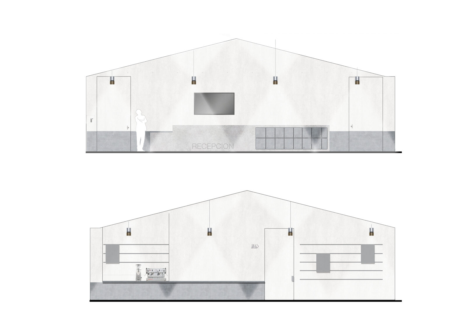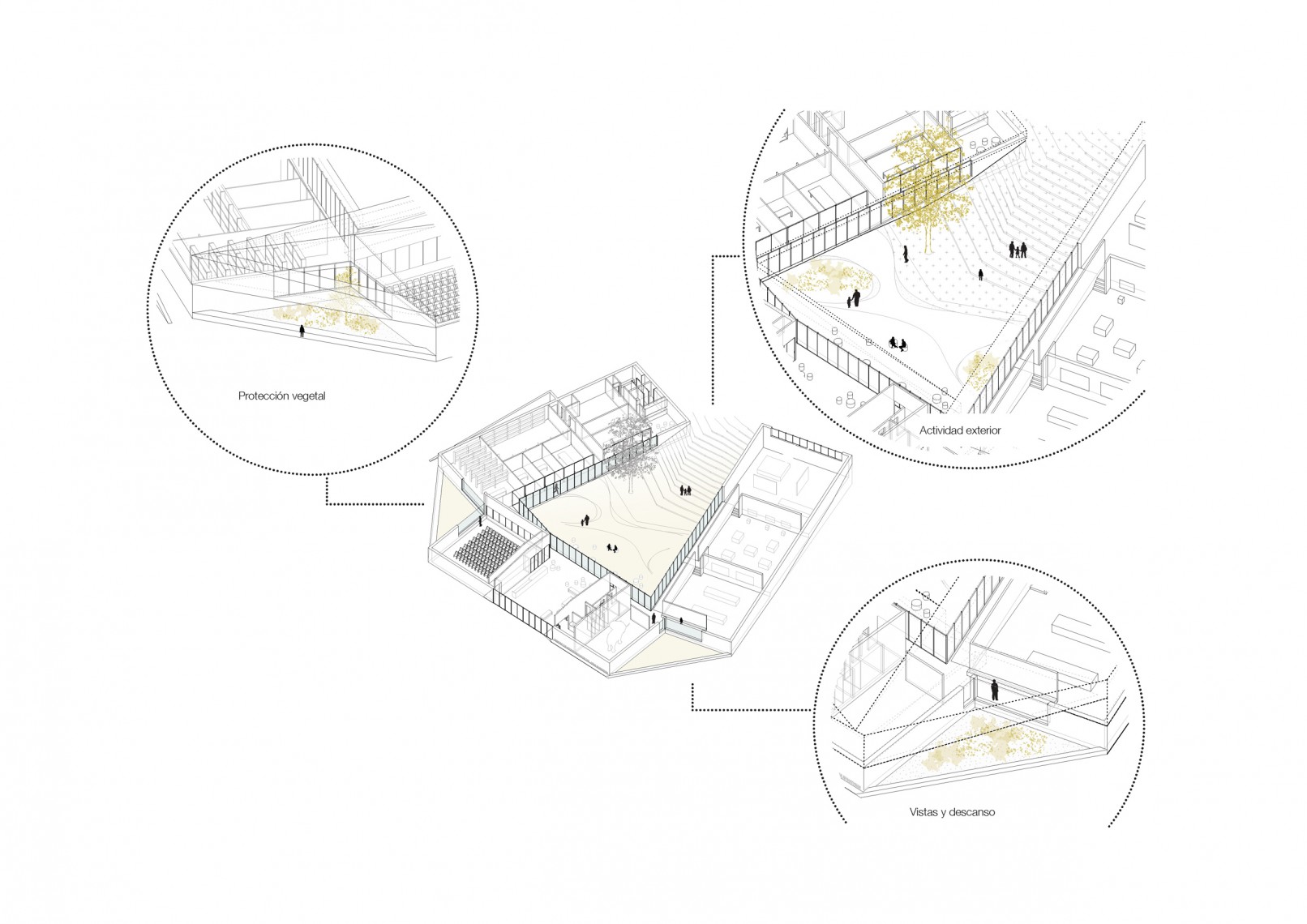 El cuerpo principal de acceso se orienta al viario invitando a los visitantes a entrar y sirve como nexo de conexión de los volúmenes de administración y exhibiciones. El resto de espacios se organizan en torno al patio; una banda de circulación perimetral actúa como filtro entre el exterior y el interior, controlando la iluminación natural en la zona de exposiciones y dando privacidad a las oficinas. Los tres bloques programáticos se conectan entre sí por medio de patios de menor espacio, que actuarán como transición entre usos, controlando iluminación, vistas y protección.