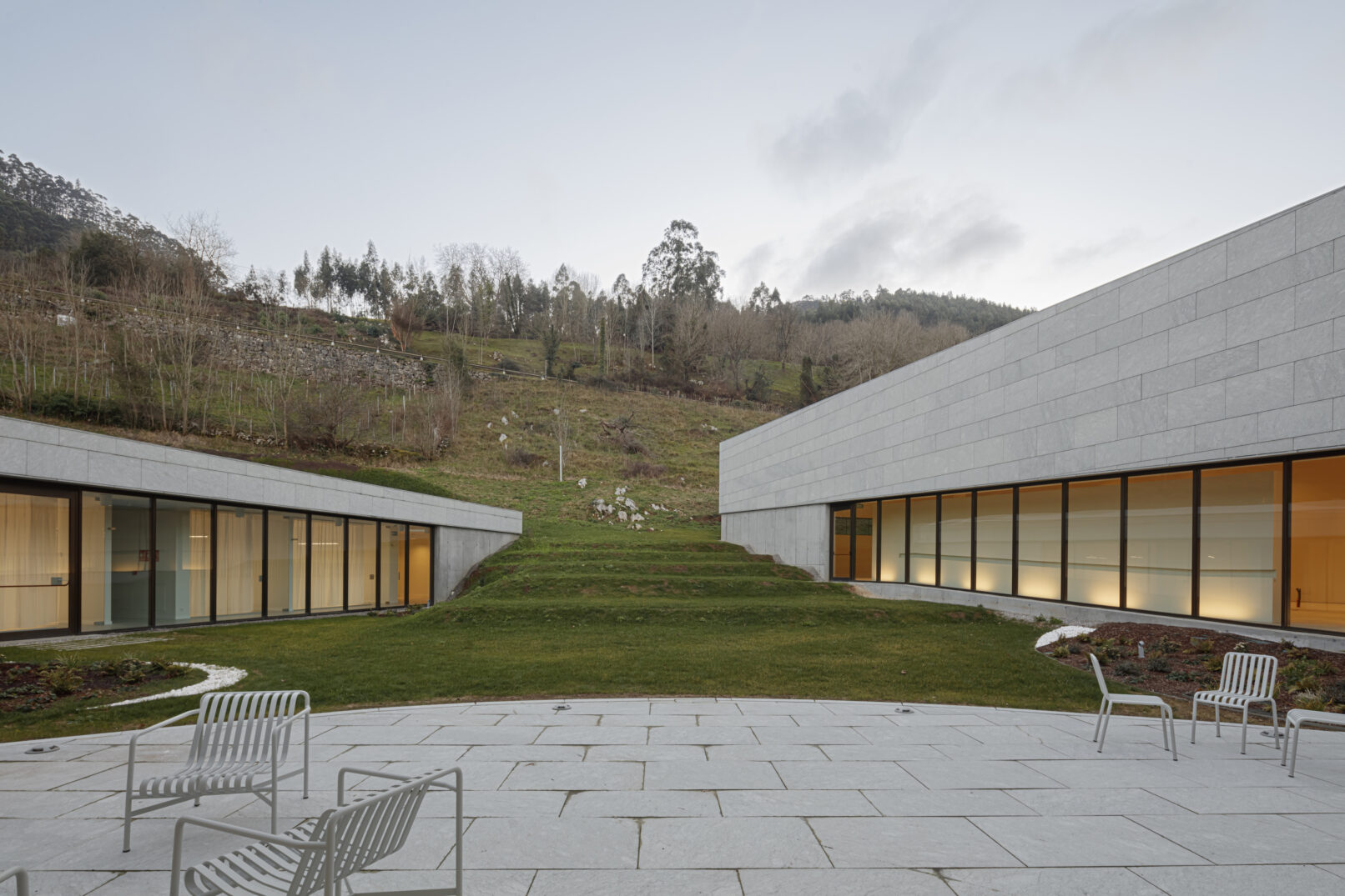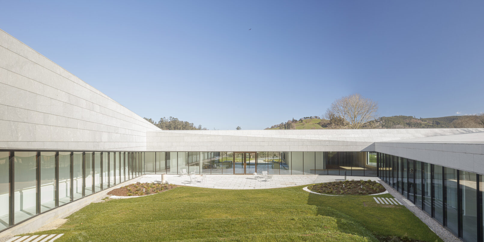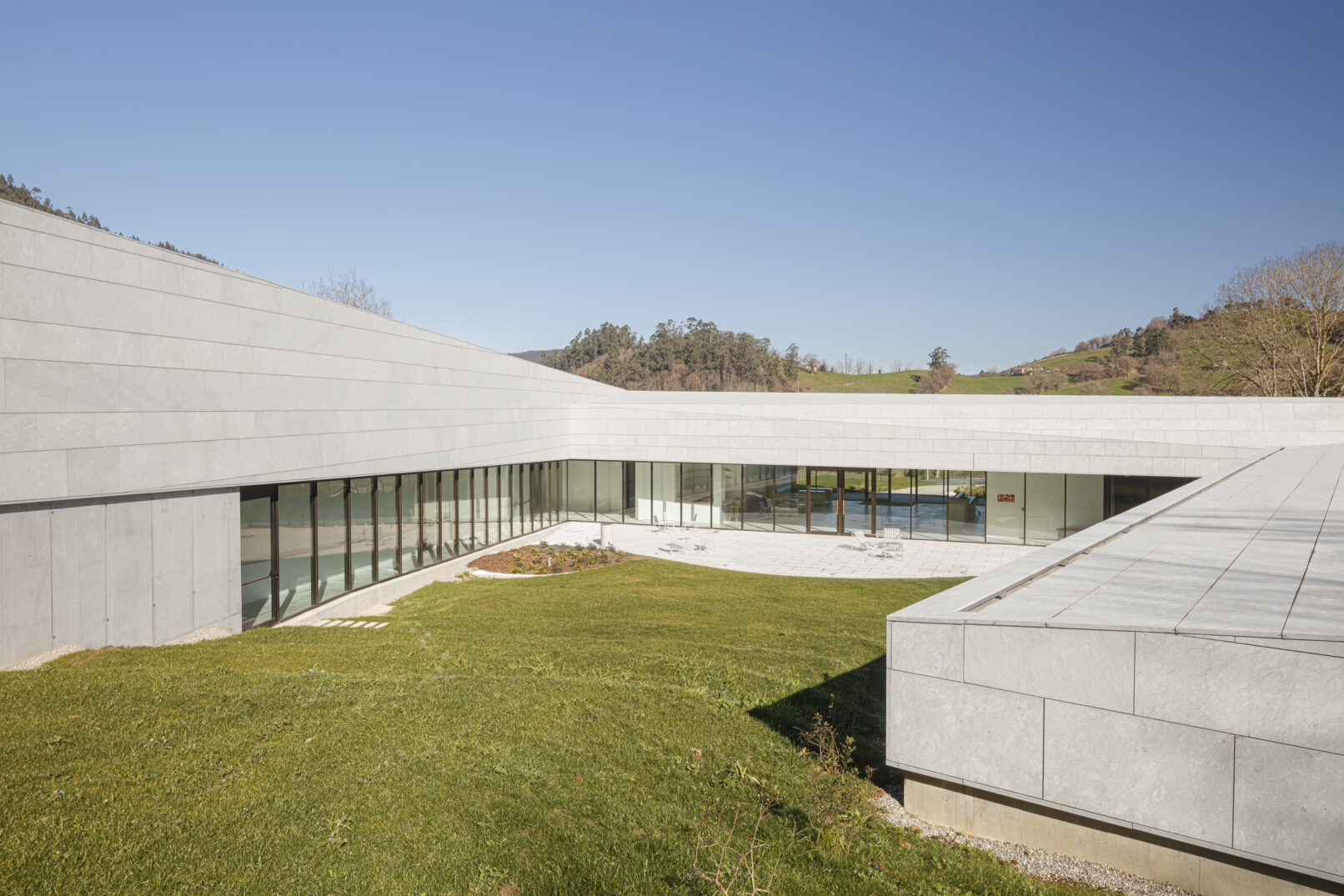 Constructivamente el edificio se divide en dos bloques. La parte baja se soluciona con muros de hormigón en las zonas que contienen el terreno, mientras que las fachadas que dan al patio y zona de acceso son principalmente acristaladas. Sobre esta base se apoya la cubierta de piedra caliza, que cose los tres volúmenes entre sí, se pliega transformándose en parte de la fachada y genera en el alzado un contraste cromático, de escala y textura. El edificio se integra y dialoga con el entorno natural que lo rodea, entablando una relación con la topografía y disgregando sus volúmenes para adaptarse al entorno.
