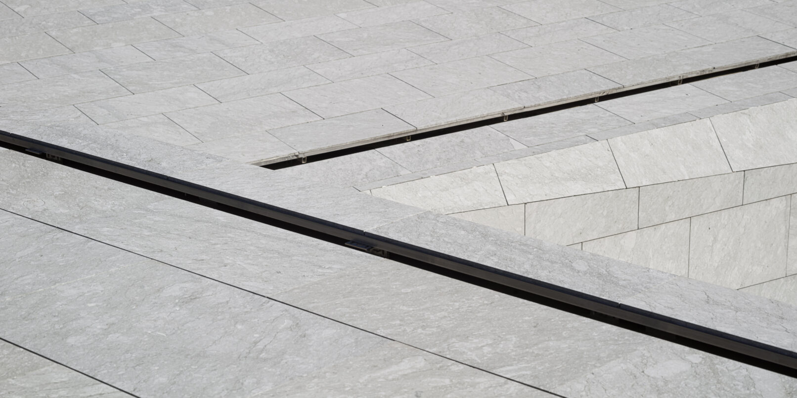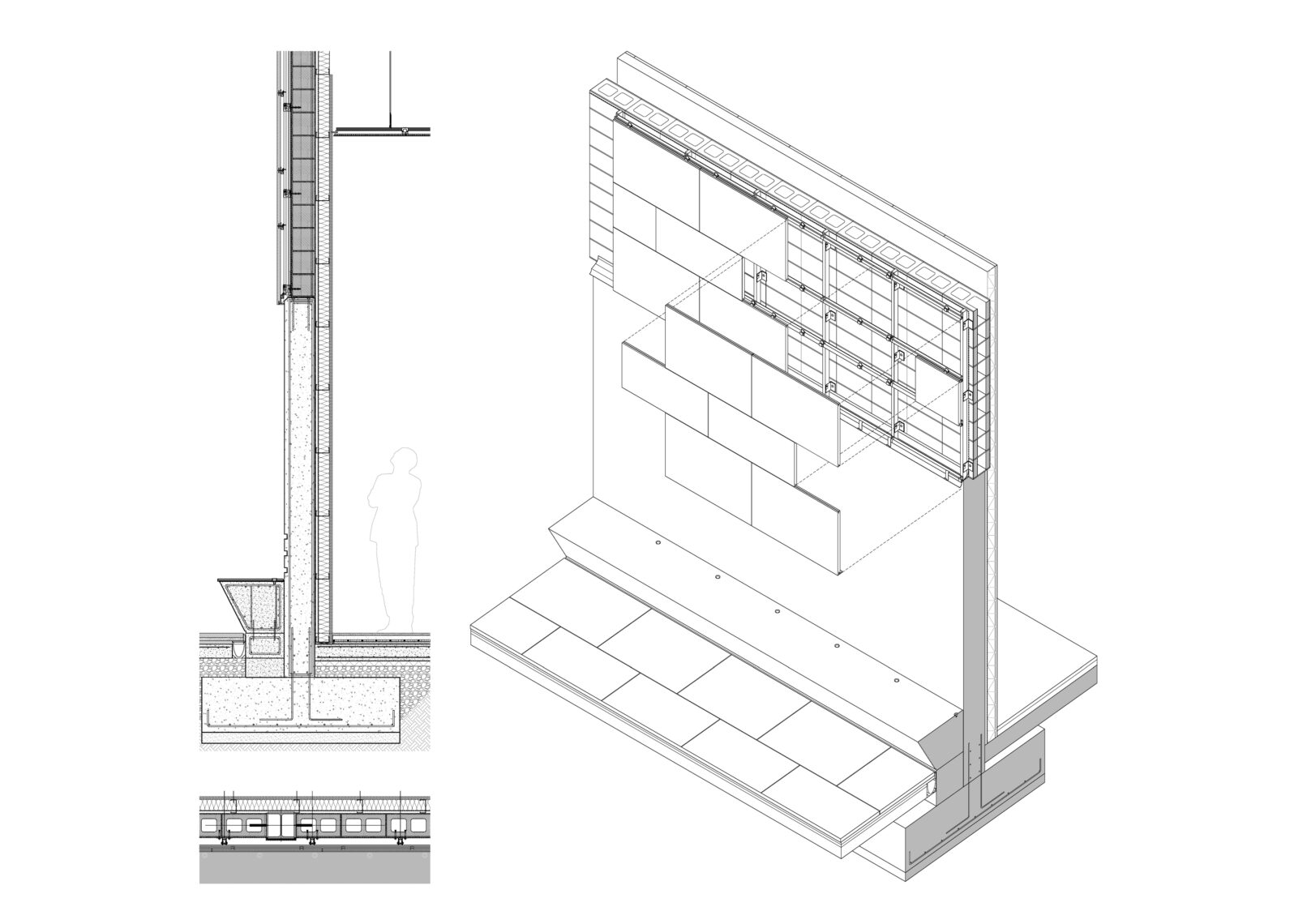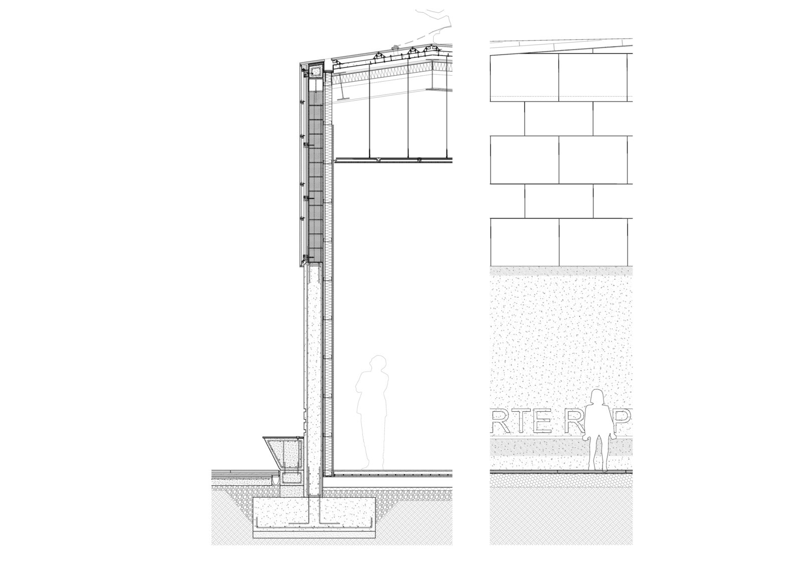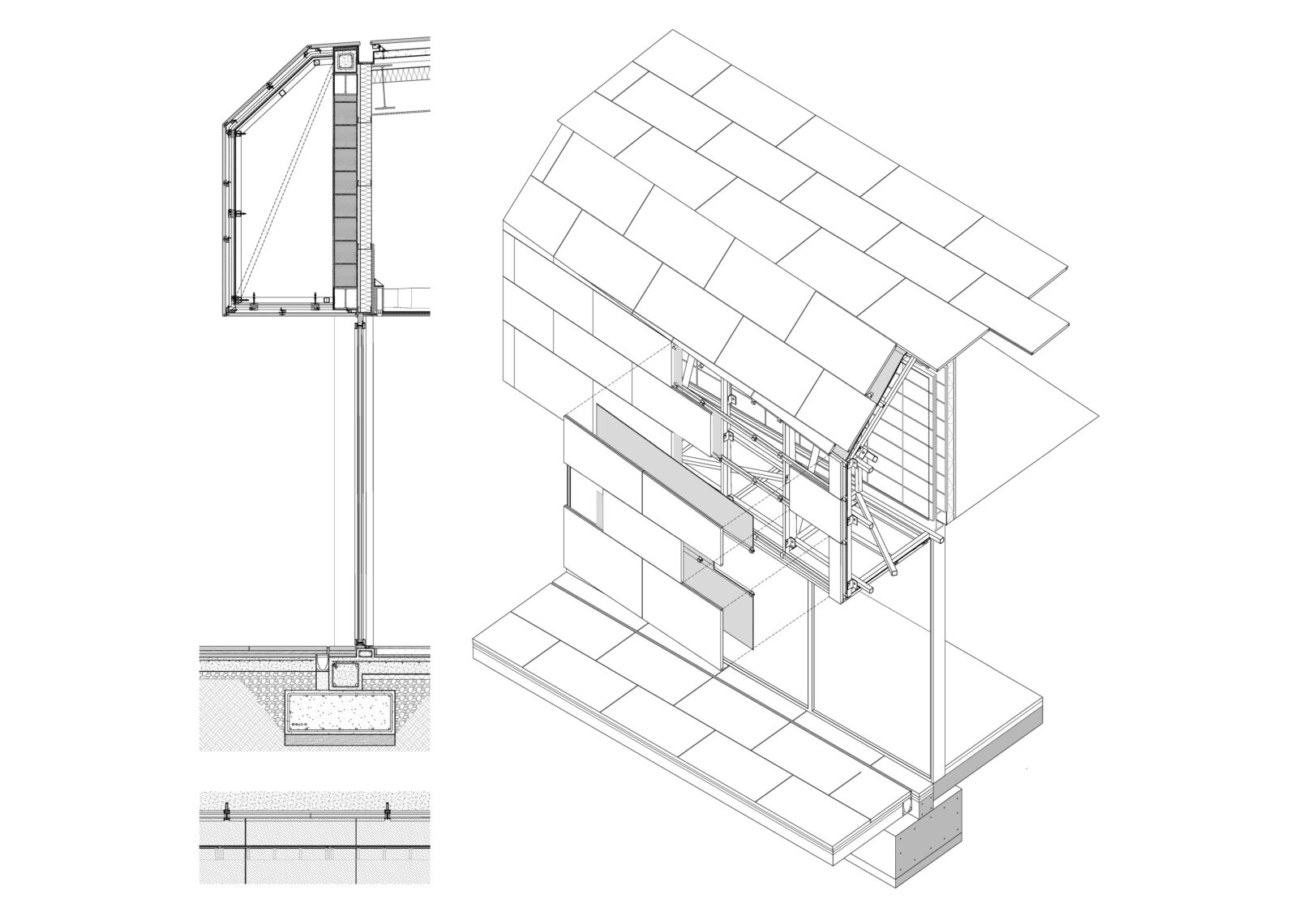 Constructivamente el edificio se divide en dos bloques. La parte baja se soluciona con muros de hormigón en las zonas que contienen el terreno, mientras que las fachadas que dan al patio y zona de acceso son principalmente acristaladas. Sobre esta base se apoya la cubierta de piedra caliza, que cose los tres volúmenes entre sí, se pliega transformándose en parte de la fachada y genera en el alzado un contraste cromático, de escala y textura. El edificio se integra y dialoga con el entorno natural que lo rodea, entablando una relación con la topografía y disgregando sus volúmenes para adaptarse al entorno.