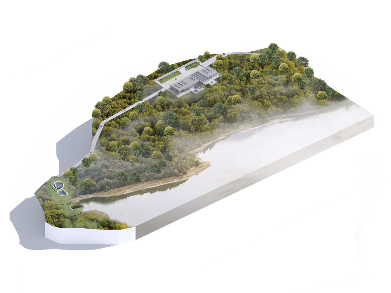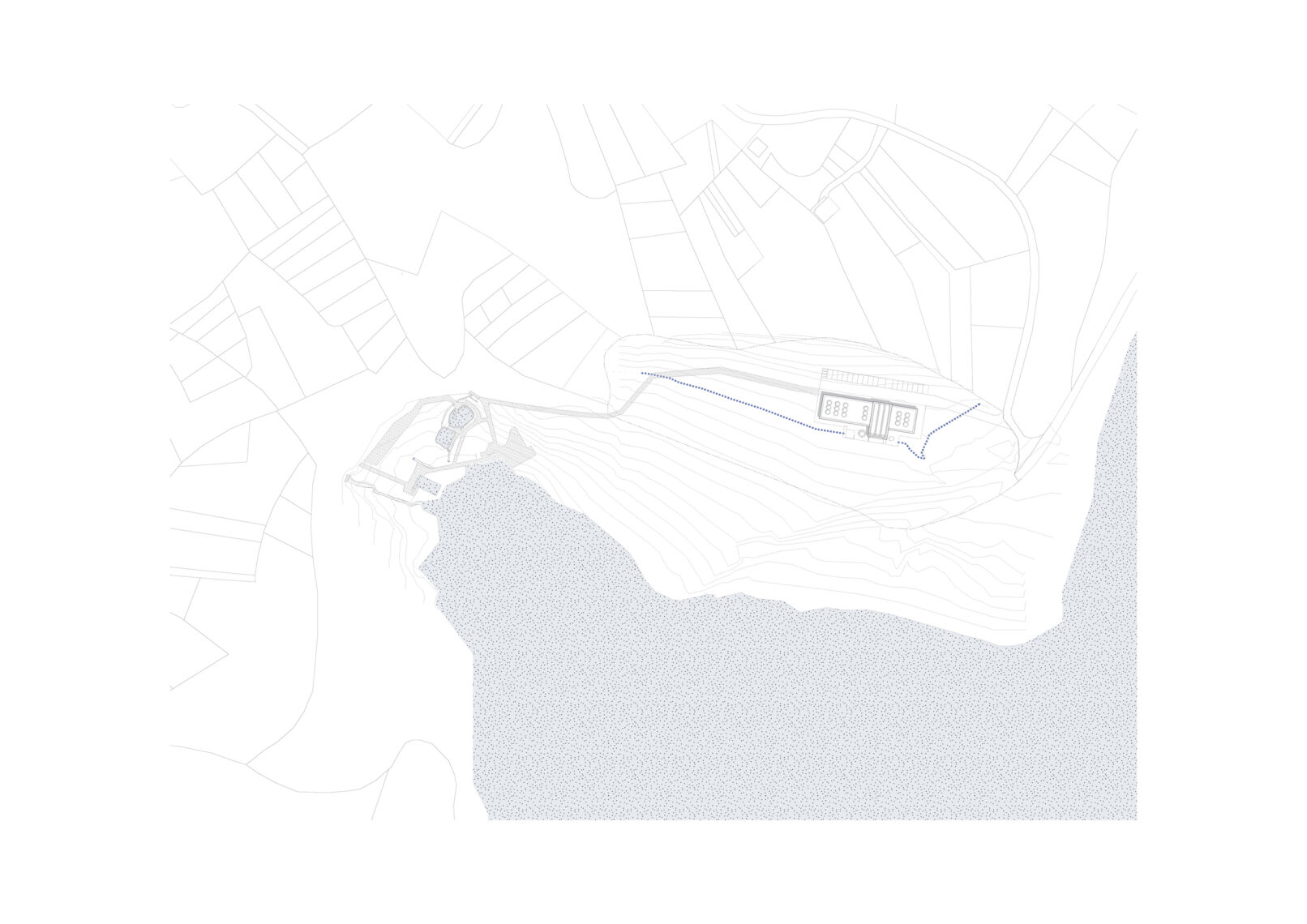 La parcela de proyecto posee gran abundacia de vegetación y tiene la mayor parte de su superficie dentro de una zona potencialmente inundable. Si bien el desnivel del terreno es muy ligero, la pendiente se incrementa en su límite noreste, el más alejado del embalse. Por este motivo, la propuesta se organiza en una pastilla rectangular, de proporción alargada y localizada junto al límite de la zona inundable, lo que permite mantenerse en la zona seca sin necesidad de realizar excesivos movimientos de tierra.