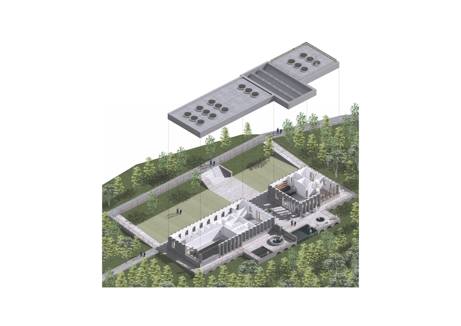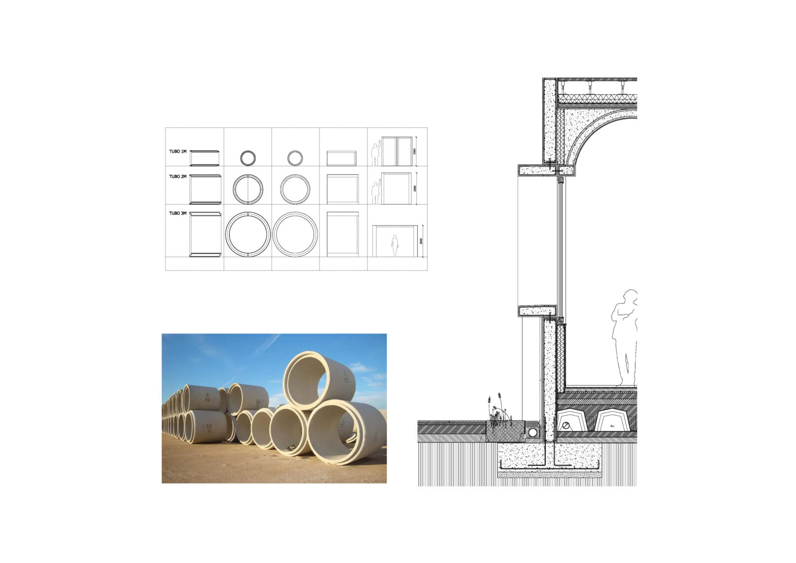 De una construcción tradicional pasamos a un concepto totalmente distinto, la utilización de elementos prefabricados como sistema de encofrado perdido para lograr geometrías circulares y cilíndricas. Para conseguir su viavilidad económica, y constructiva, se plantea la utilización de tubos armados de hormigón prefabricado de grandes dimensiones, para la ejecución de elementos de fachada, forjados y cubierta de presencia habitual en infraestructuras.