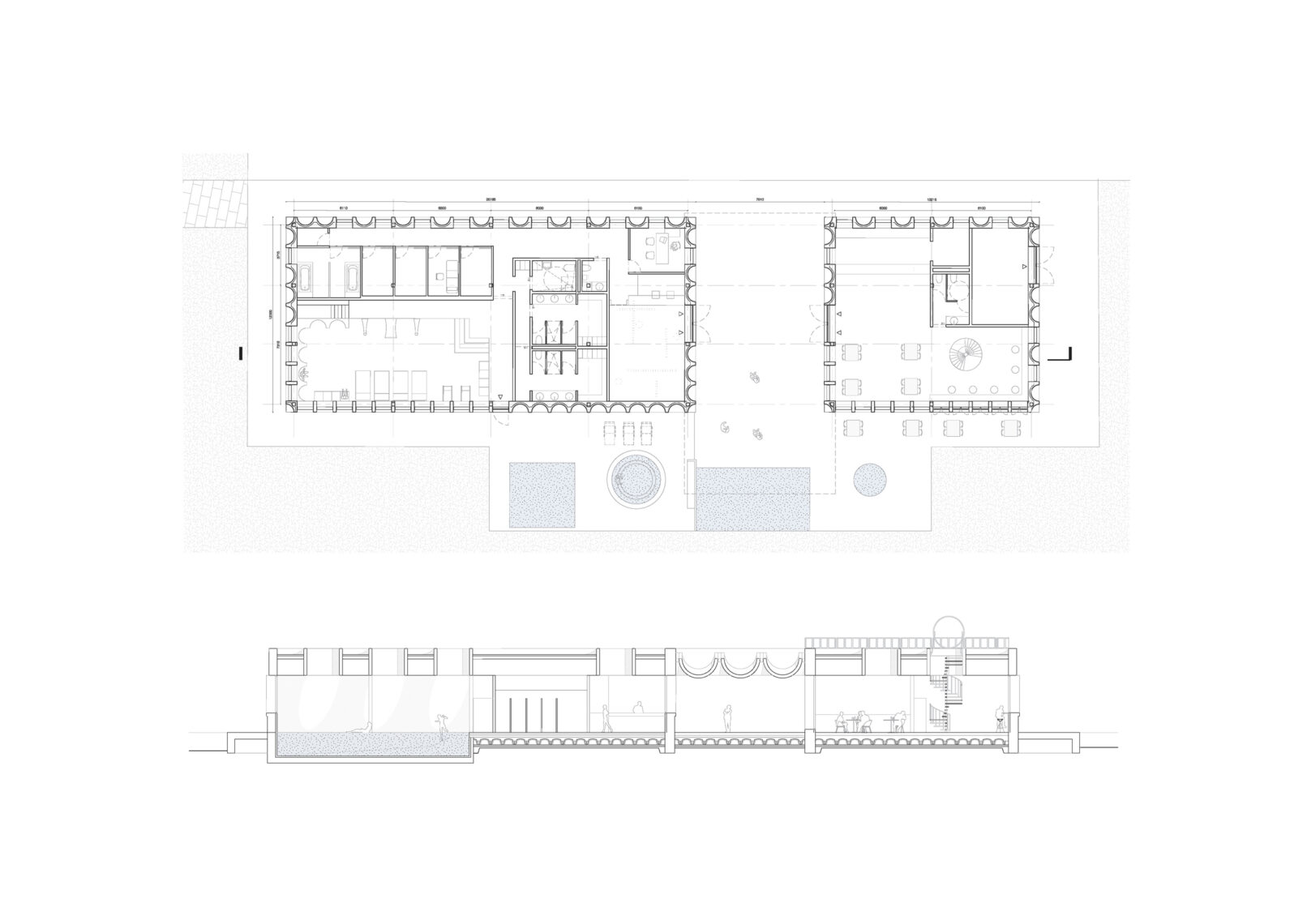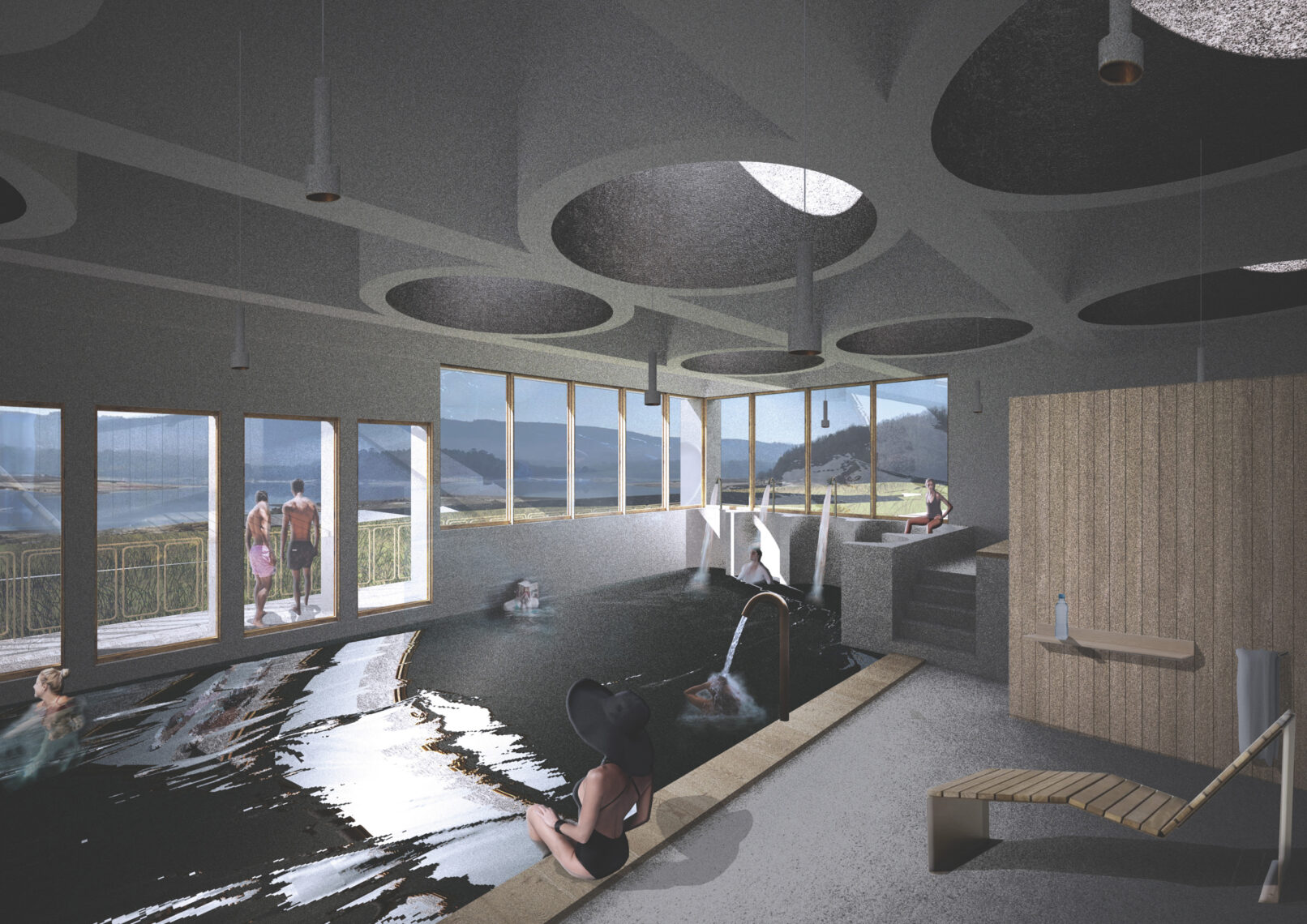El volumen inicial se divide en dos piezas, una con aquellas funciones asociadas al uso termal y otra con los espacios más públicos, como la cafetería. Las dos piezas se separan para crear un espacio intermedio de transición.