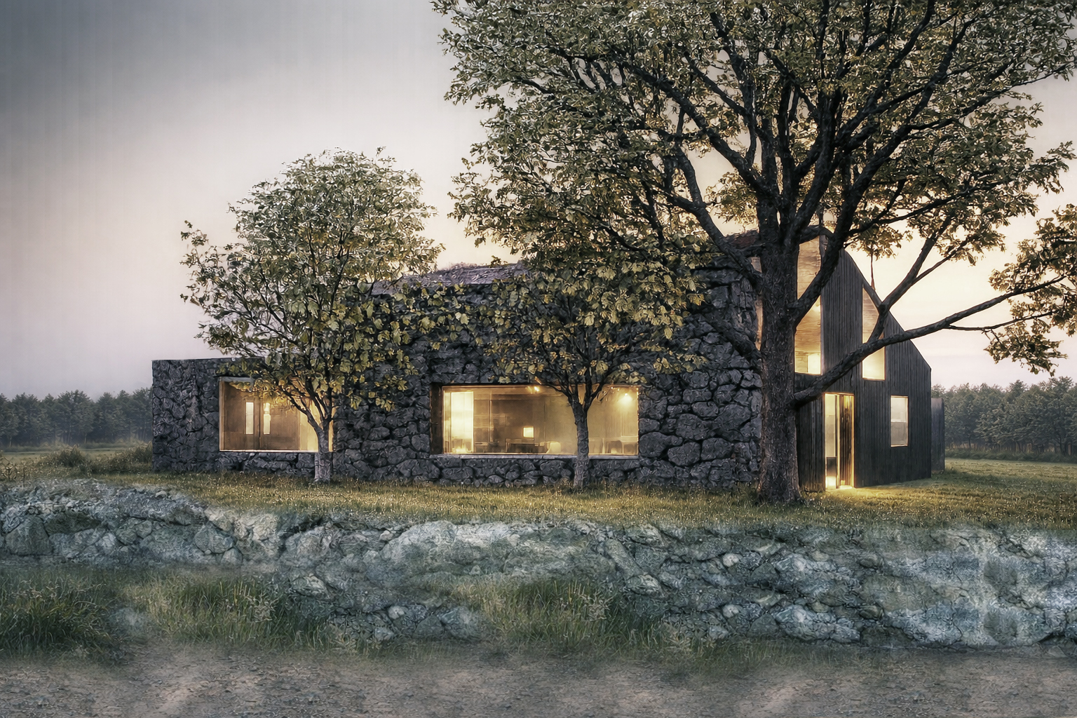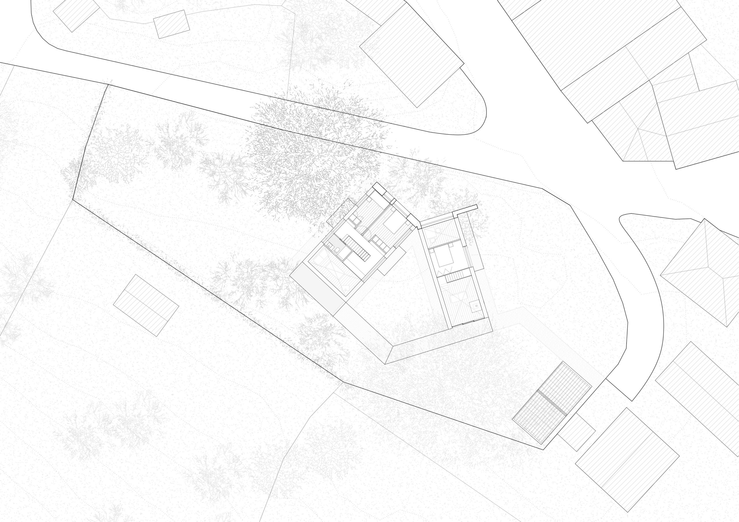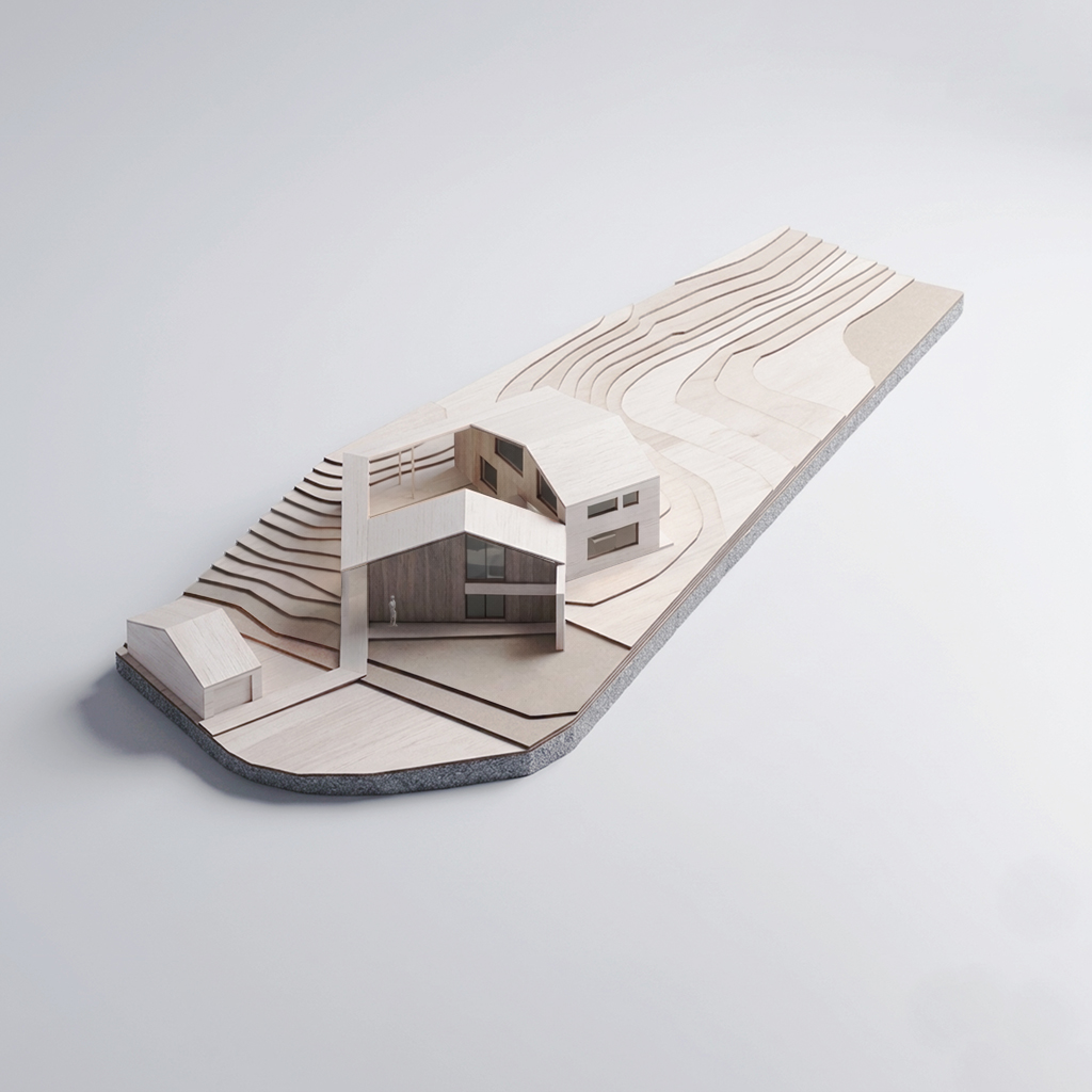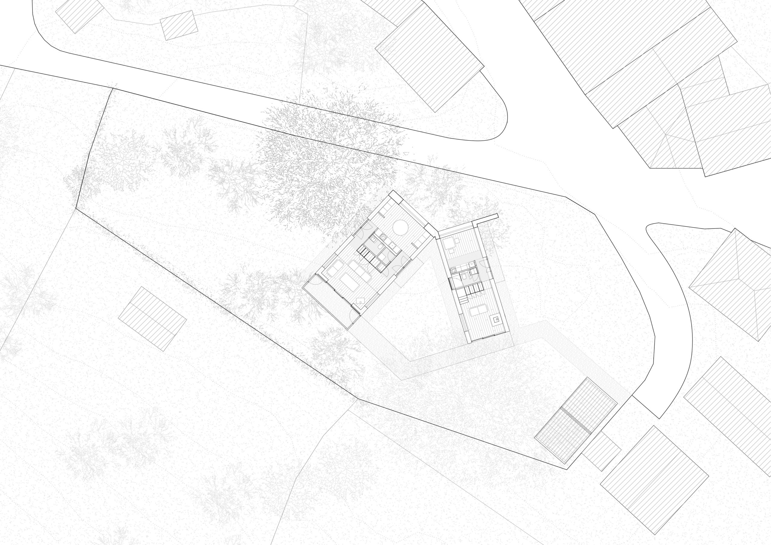 The brief began with a constraint: the plot had been divided into two separate parcels, and planning regulations required the buildings to be attached. Our response was to turn that condition into the central idea of the project. The two houses meet at a hinge, touching at an angle along a single edge, then open towards the landscape to create a shared space between the volumes while also giving each dwelling its own private garden frontage.