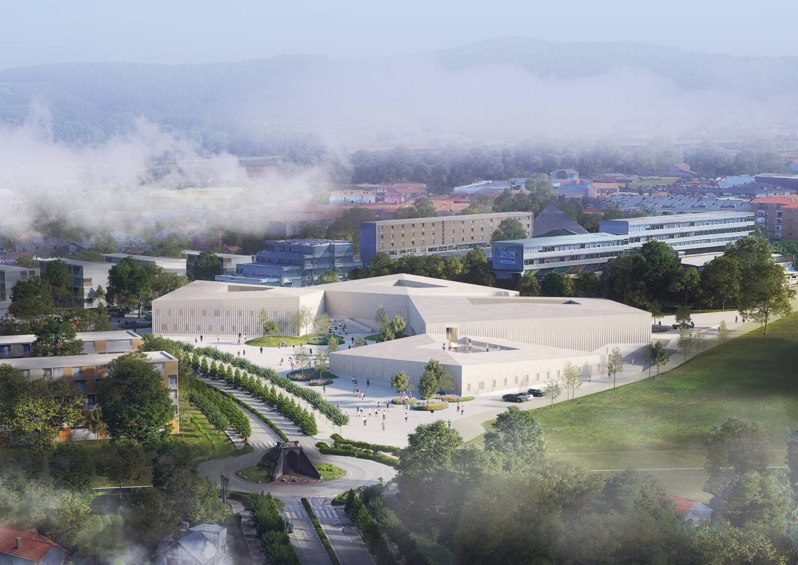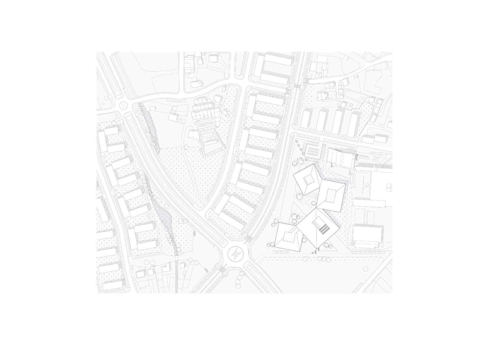 El nuevo centro trata por tanto de desligarse del contexto actual, un vacío urbano con escasas edificaciones, y se centra en su papel dentro del nuevo plan. Se busca crear un conjunto con presencia urbana, capaz de atraer y generar actividad pero con una escala adecuada a su entorno, caracterizado por los desarrollos residenciales de media densidad de las nuevas parcelas previstas, pero también dialogando con el carácter más disperso de las zonas limítrofes que quedan fuera del mismo y sin olvidar los elementos naturales existentes en la zona, conjuntos de masas arbóreas y la silueta del monte Dobra, referente del barrio y la ciudad.
