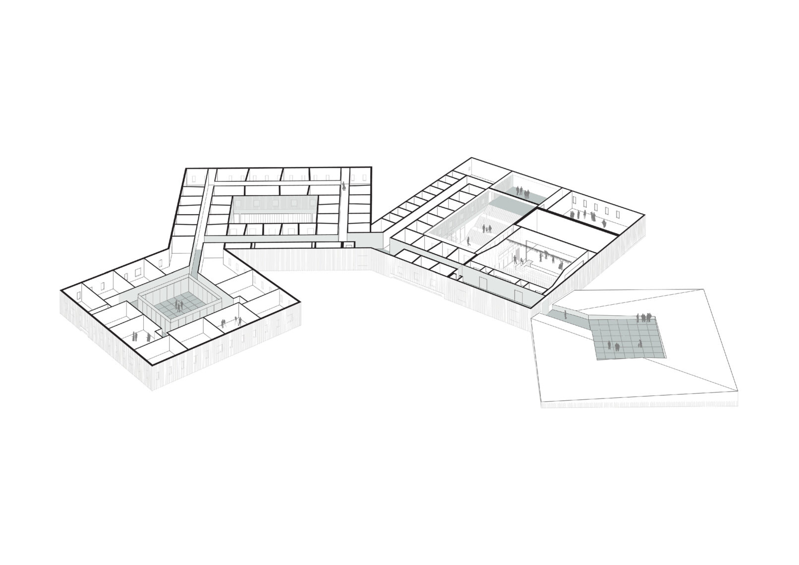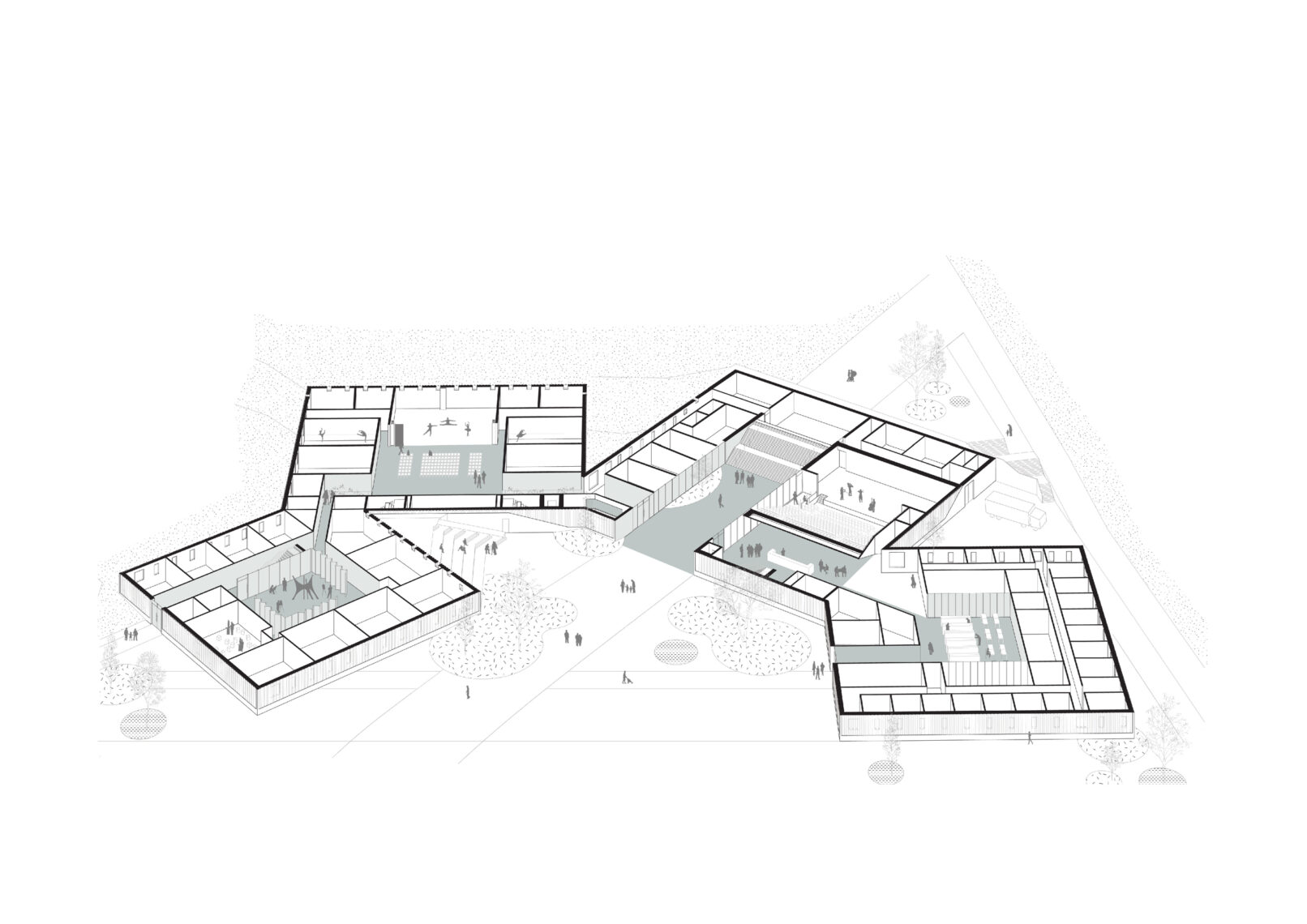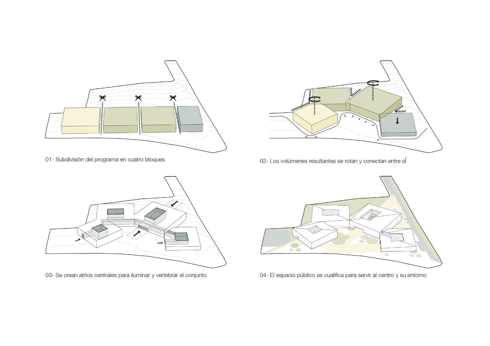 Los distintos volúmenes se dimensionan y articulan buscando el funcionamiento óptimo del conjunto, pero también el aprovechamiento de la parcela y la relación del edificio y espacio público, con su entorno.