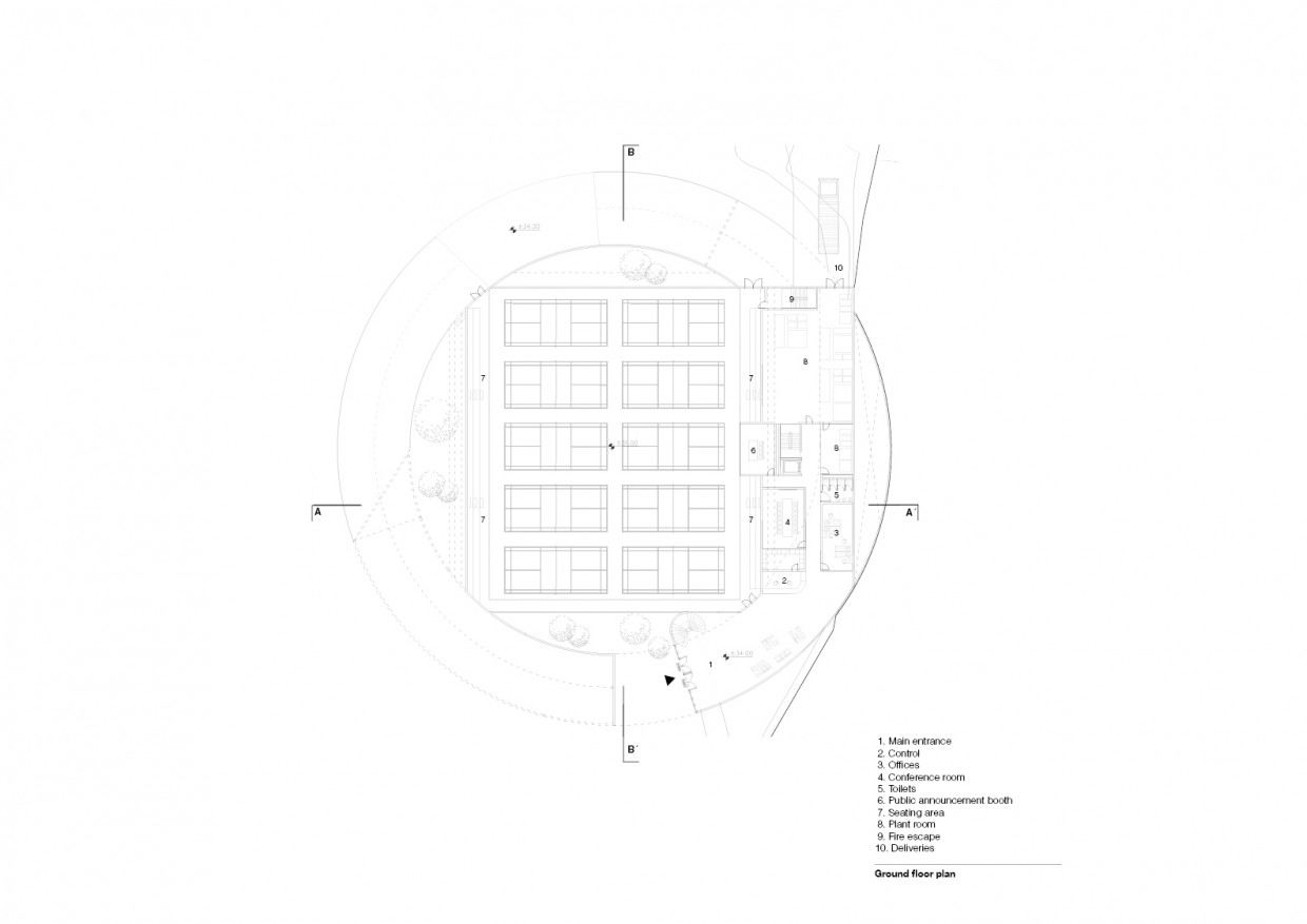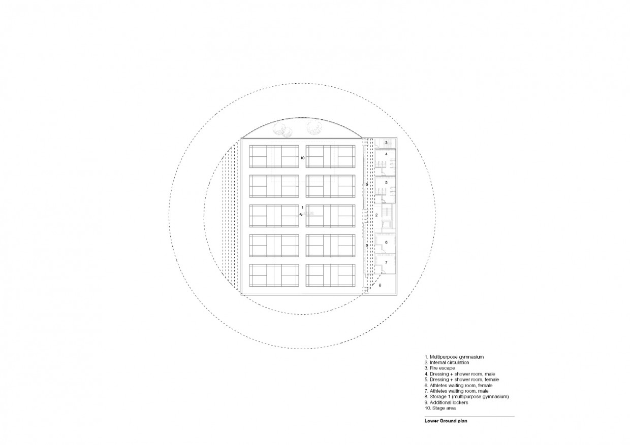The exterior ramp is treated as a public route joining both sides of the road while giving access to the sports hall at different levels and hosting all the services required by the facility. The resulting path around the building remains always public and accessible along a variable section creating an interstitial space where both users of the pavilion, spectators and citizens interact.