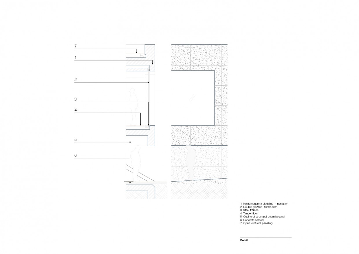 To provide an adequate environment when using the multipurpose gym the main volume is treated to control natural light, by having enough daylight but not direct illumination. To achieve this the building uses the interstitial space left between the external ramp and the rectangular interior courts area to introduce roof lights along its perimeter.
