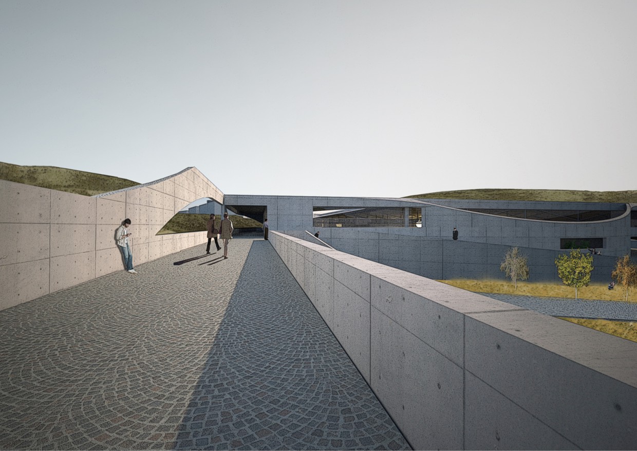 To create this link a pedestrian walkway is proposed, bridging the levels difference between both sites as well as within the boundary line. The space generated by this sloped footbridge is covered to allocate the sports hall, partially buried in the terrain to accommodate the required program with a minimum volumetric impact.