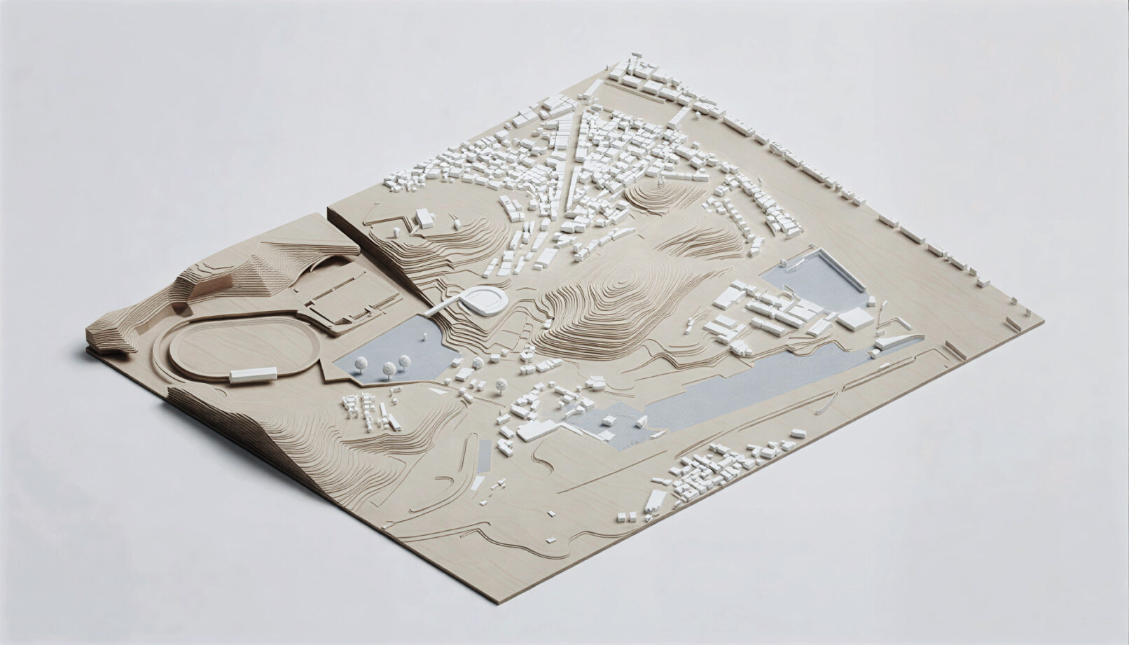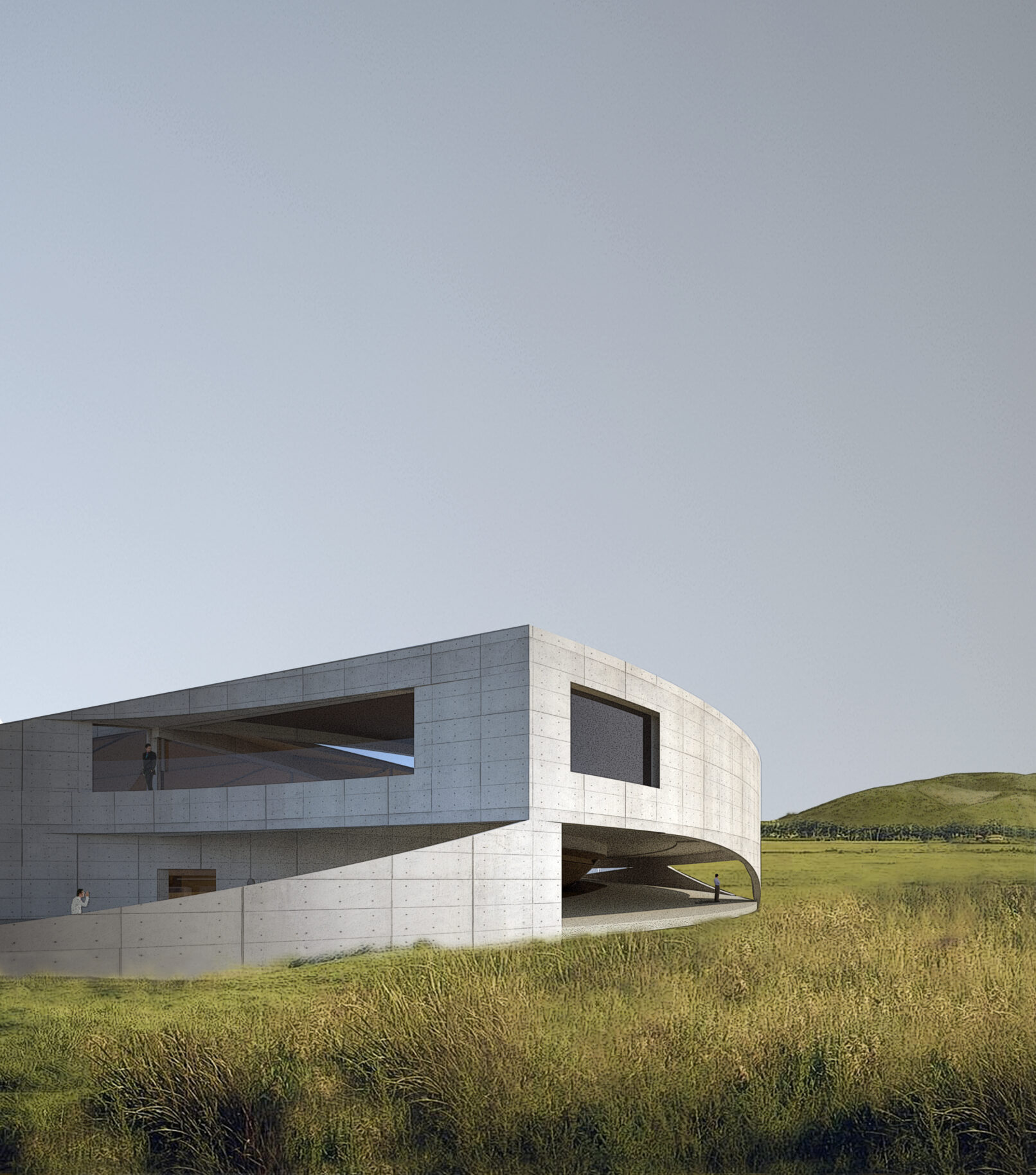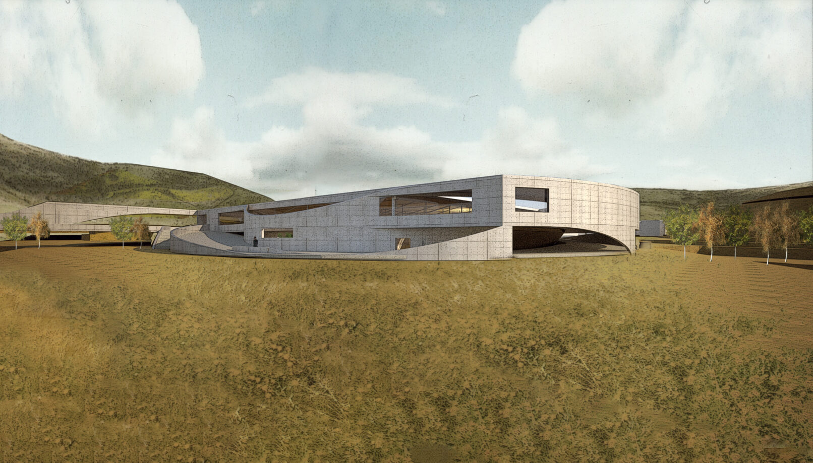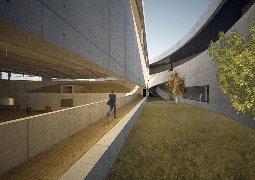 The new building uses the natural topography of the site to create a connection to the neighbouring sports complex now detached and isolated due to the existing road.