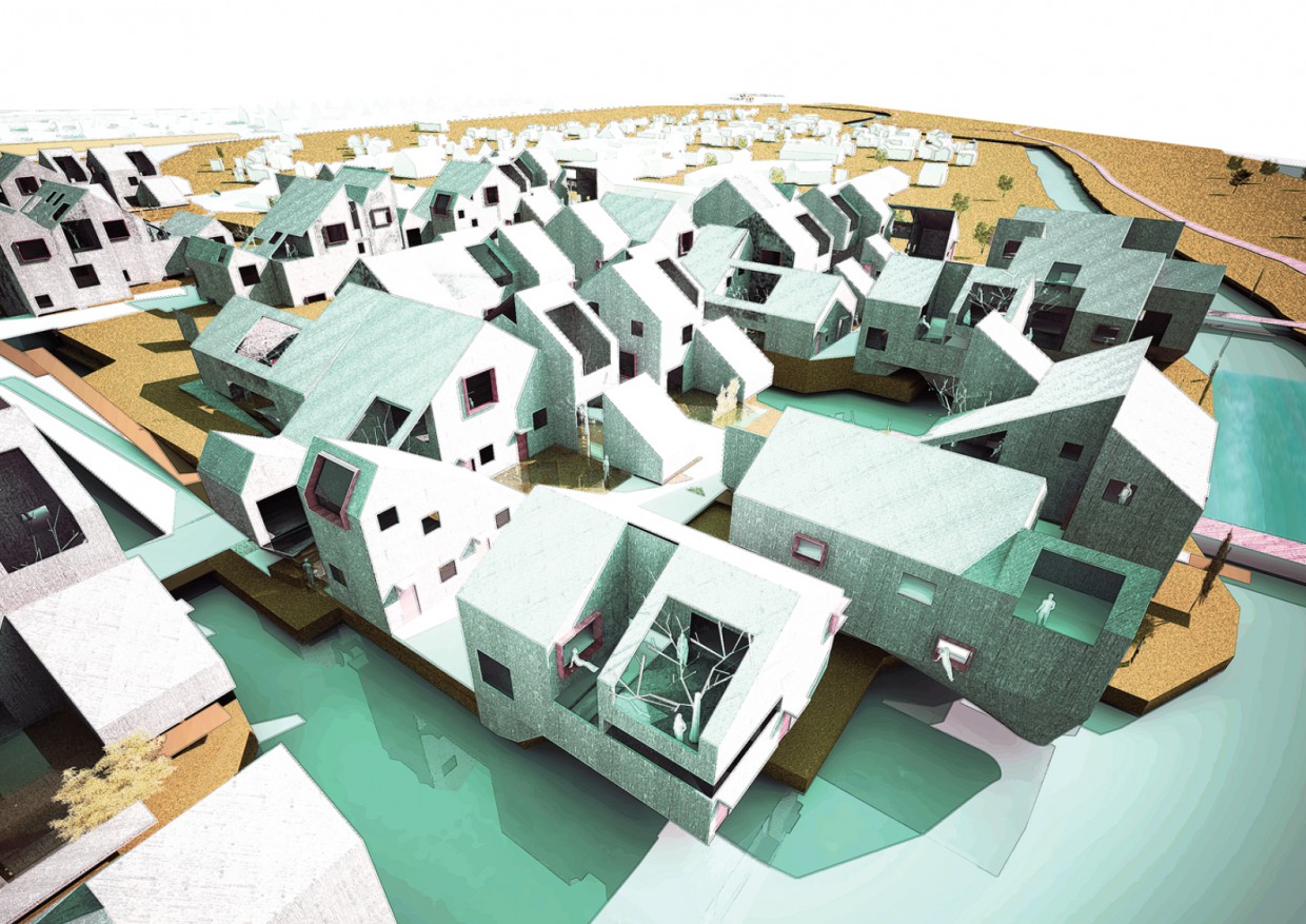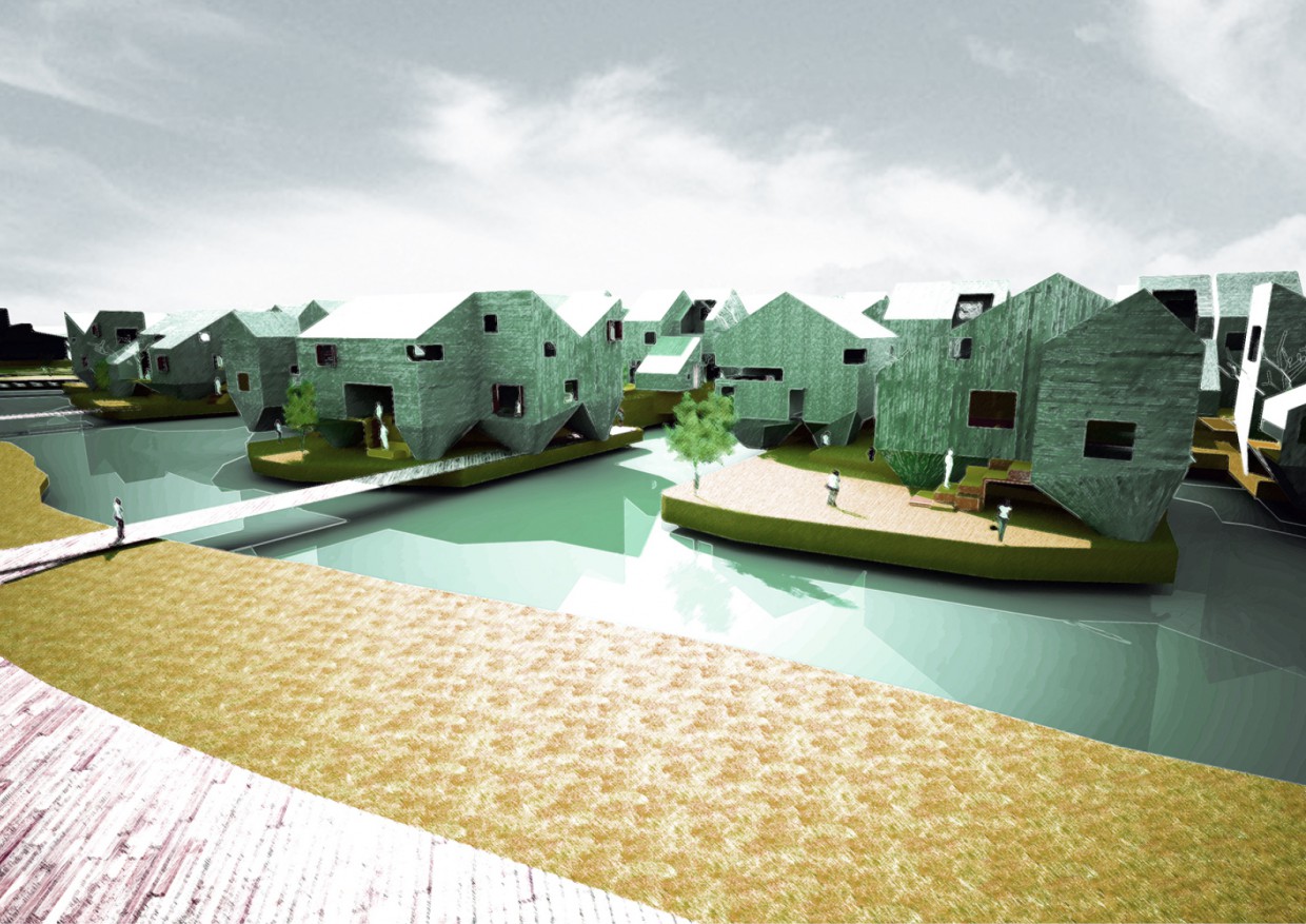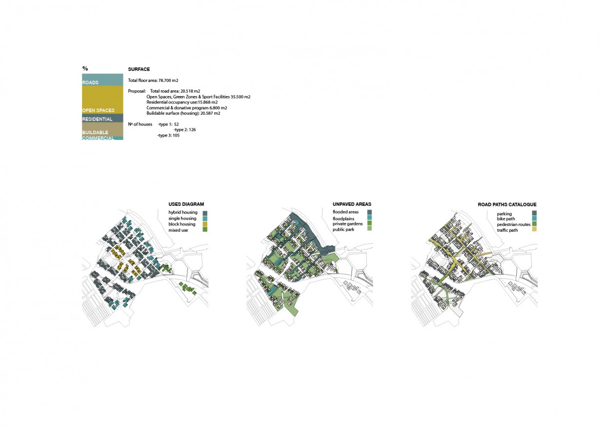 The proposal developed is a response to the special characteristics of the plot, adjacent to the sea and crossed by a stream with a serious risk of flooding part of the year. By modifying the original basin, new streams are created determining future constructions by eroding them. As a consequence wetland areas would appear in the urban development coexisting with wildlife and controlling the risk of overflow. New ways to live with water are proposed.