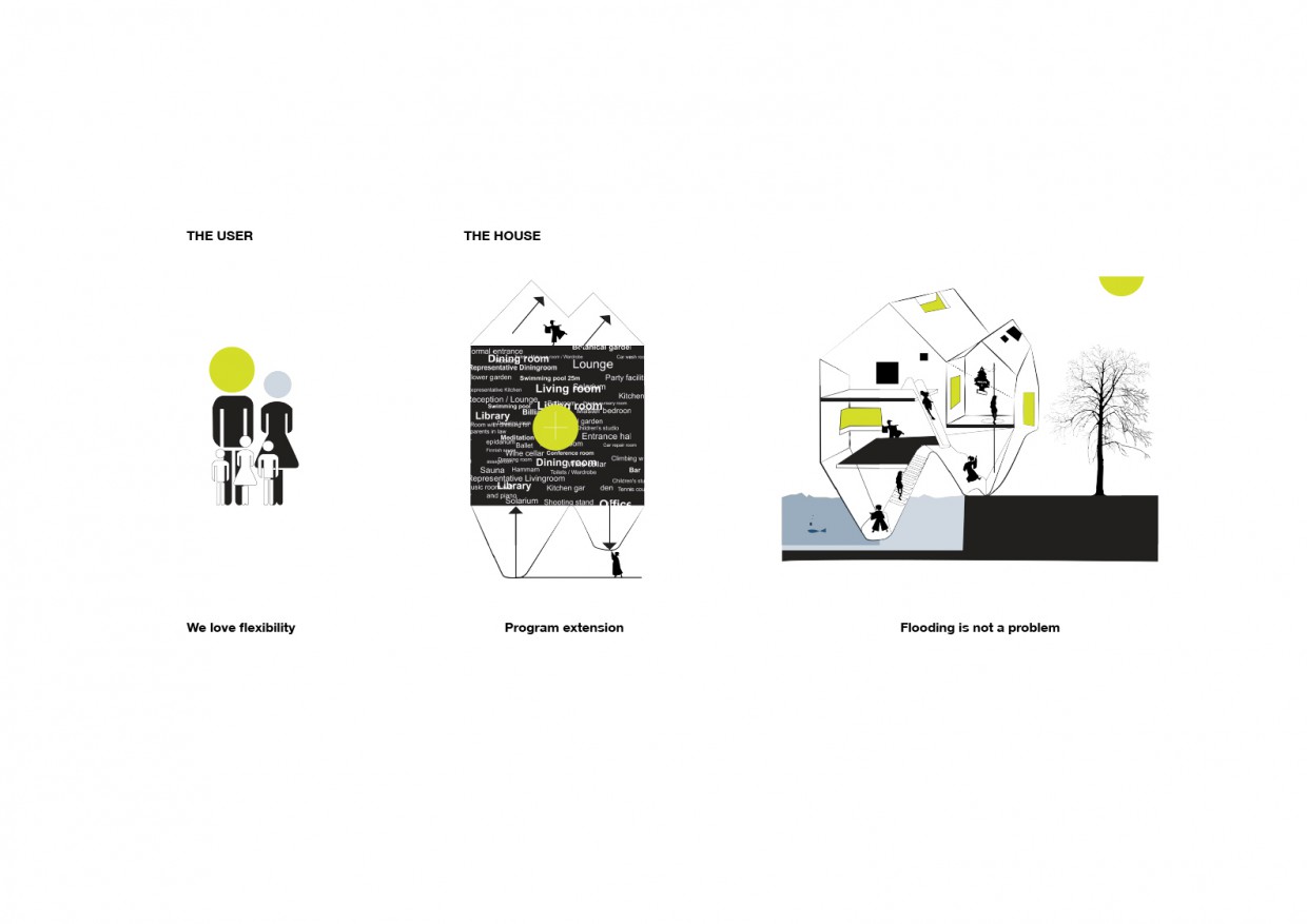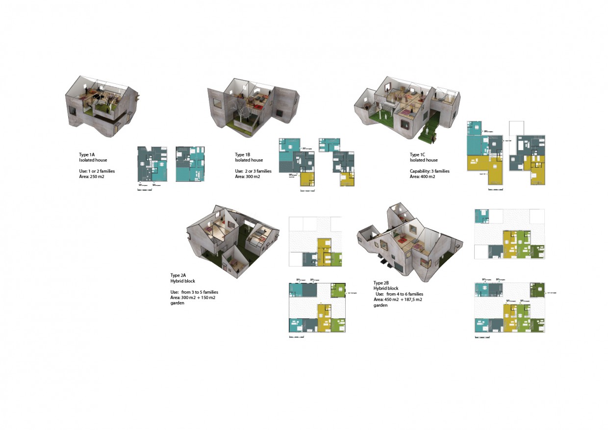 This aspect is transferred to the typologies. The housing volume is literally resting on the ground by extremities filled with program functions, able to connect the public space while providing shelter outside the home. The use of the outside space is extended, in an area characterized by an extreme climate, with small pavilions directly related to the garden. Creating more vivid interiors and a unique appearance at the urban level