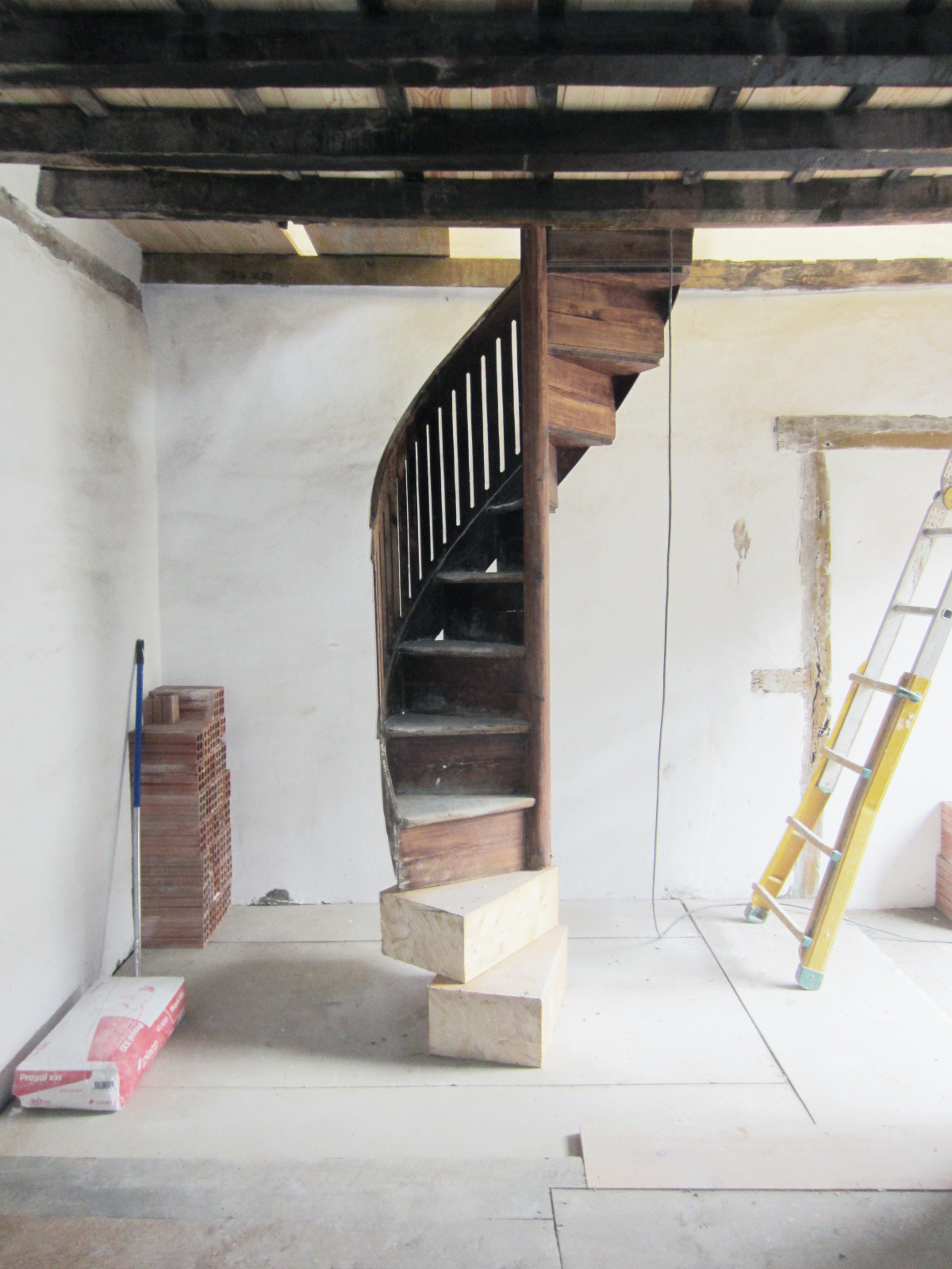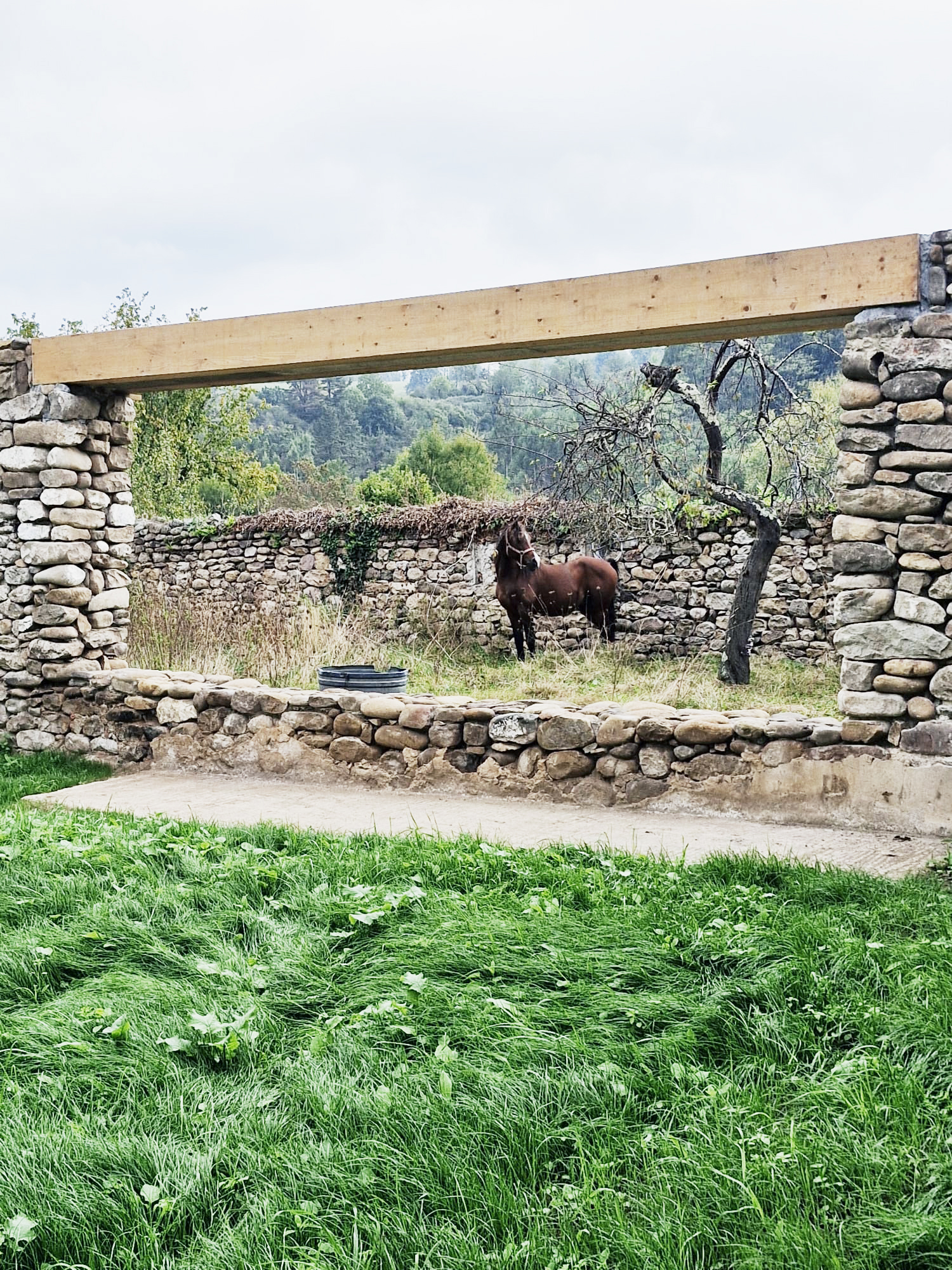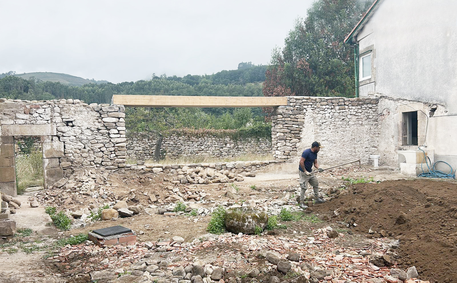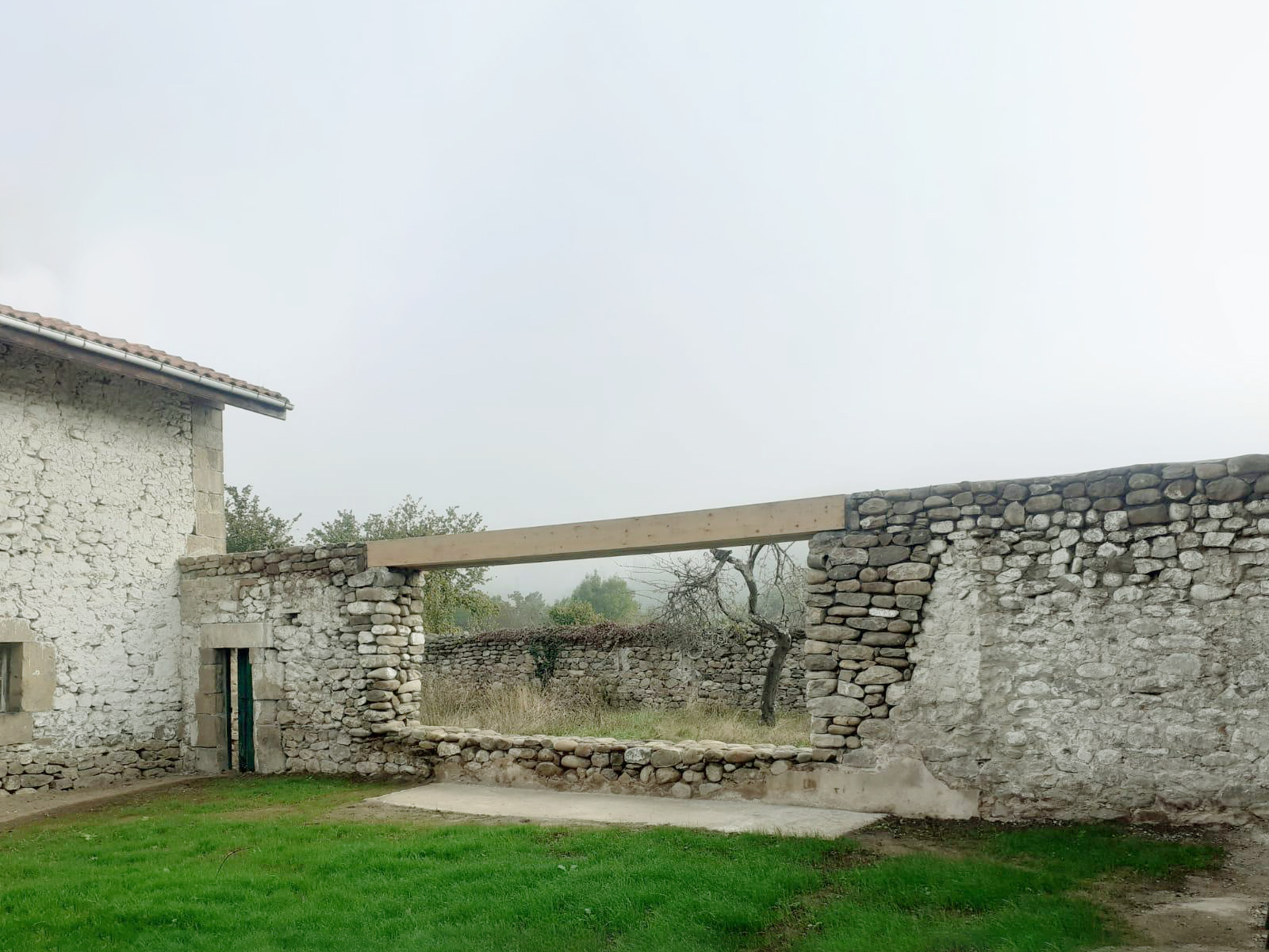 We’re working on the rehabilitation of a unique rural complex organized around a large central courtyard. Instead of tearing down an old load-bearing stone wall that once divided this courtyard from the rear garden, we’re choosing to inhabit it — opening a generous passage through it, supported by a large glulam beam, and transforming it into a thick, inhabited threshold. A continuous bench and a long table will anchor this gesture, turning it into a space of transition and gathering — a new heart between garden and patio.
