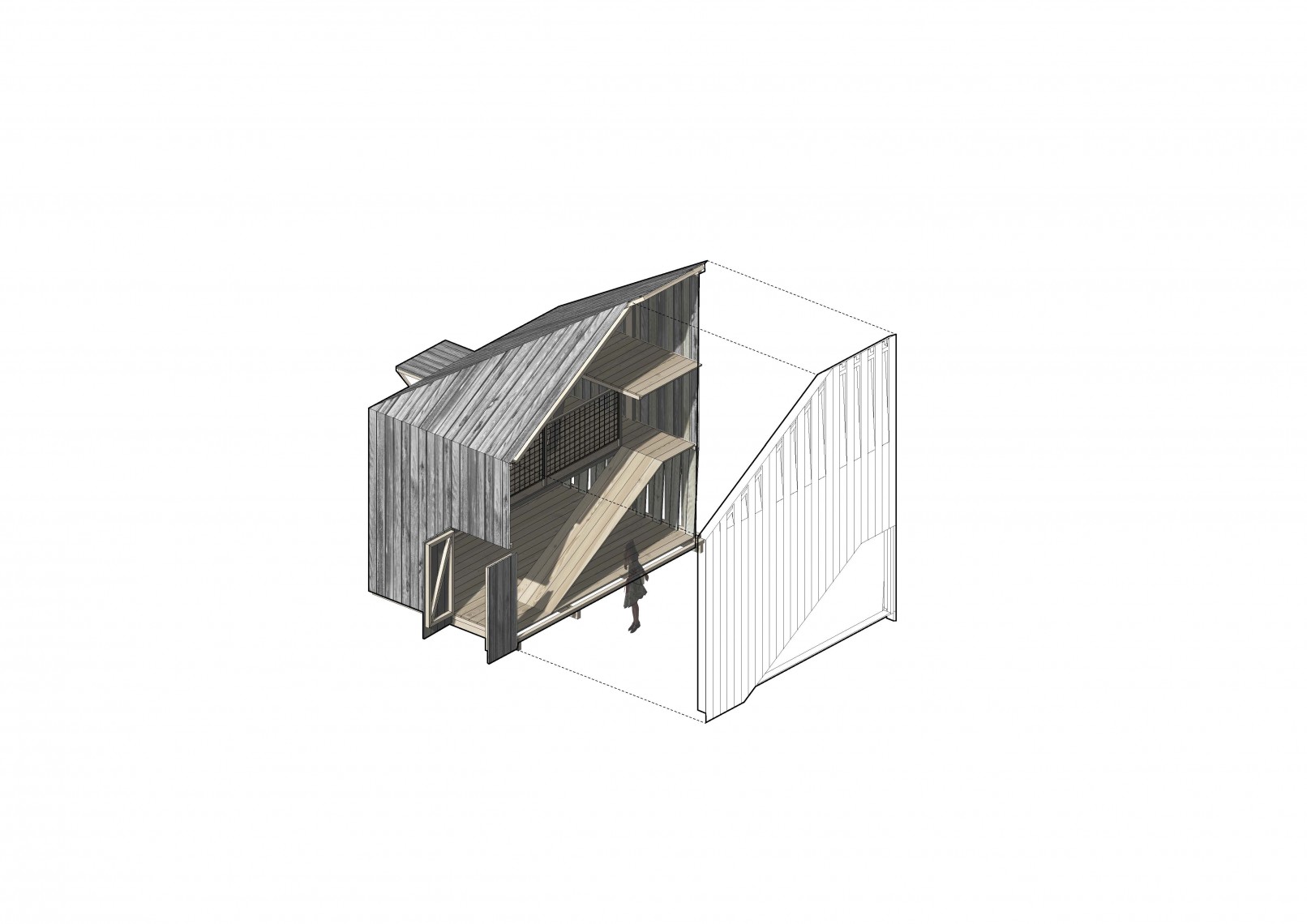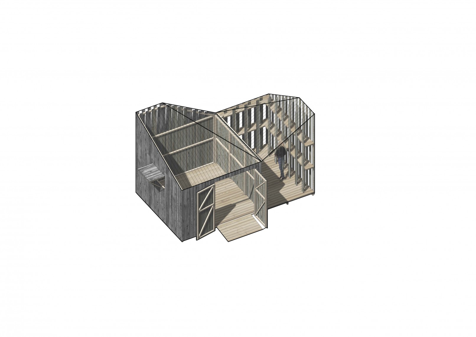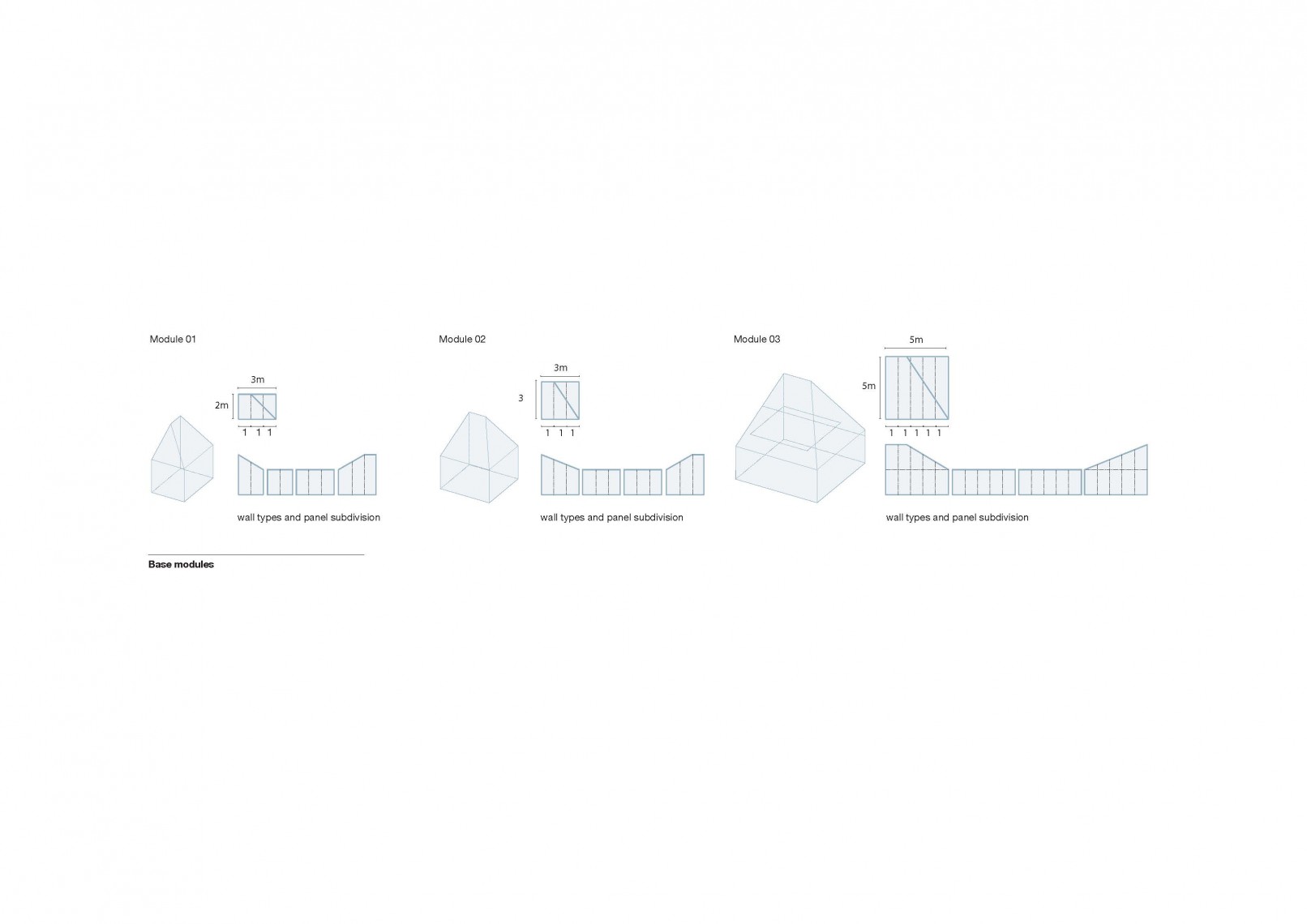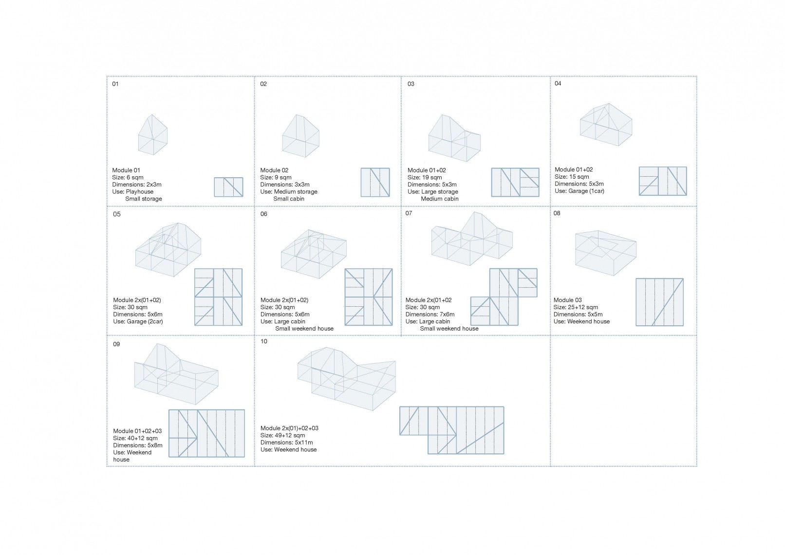 The competition brief asked for new designs using a prefabrication system able to produce from a play house or storage unit to a weekend home. The proposal presents a family of prefabricated elements, all created from the combination of three different modules, containing the same geometry.