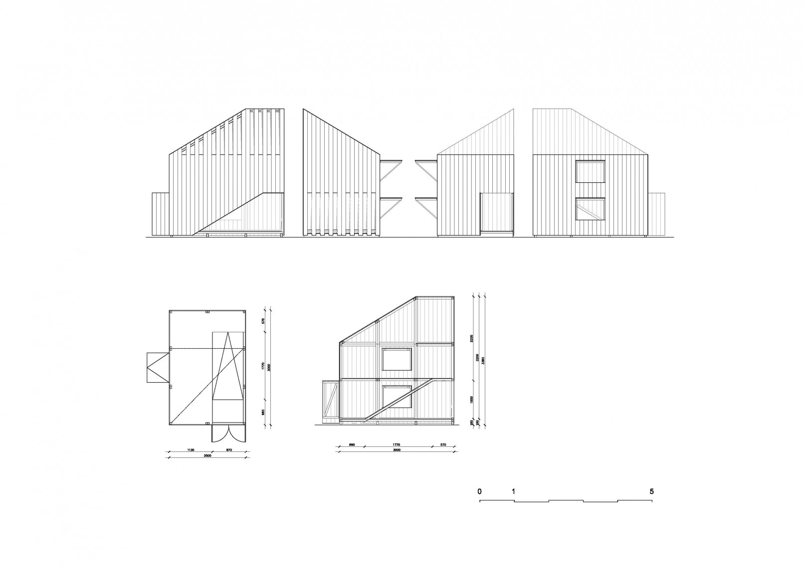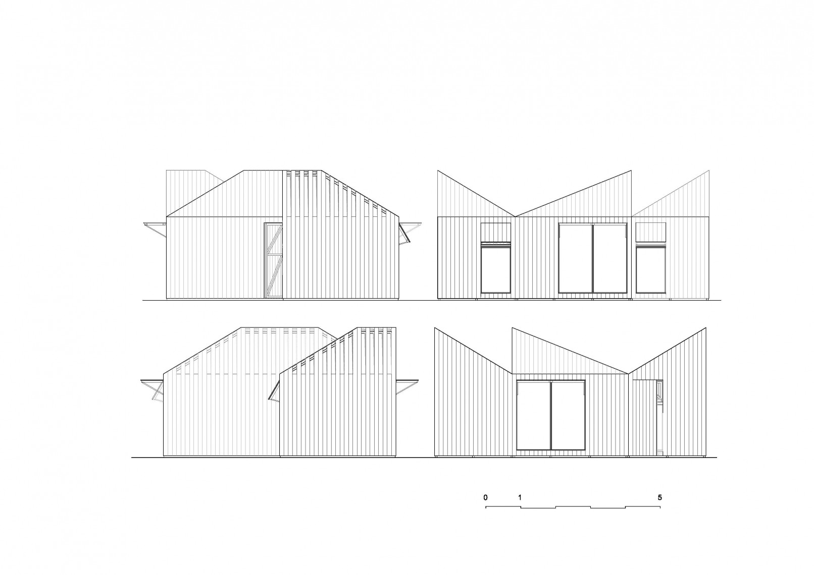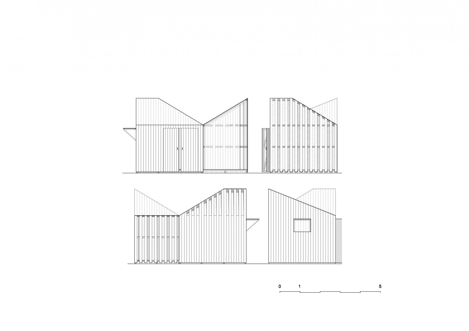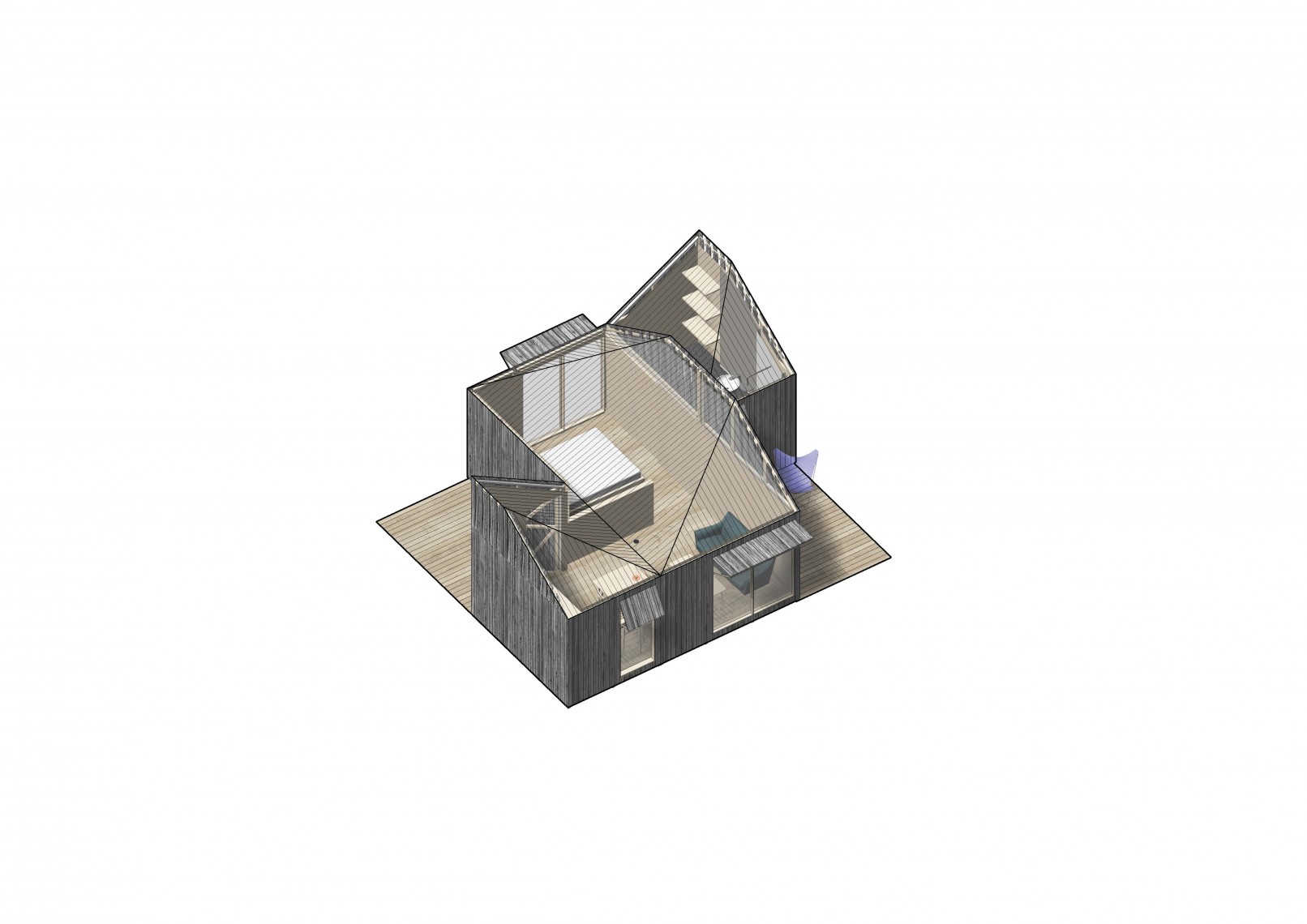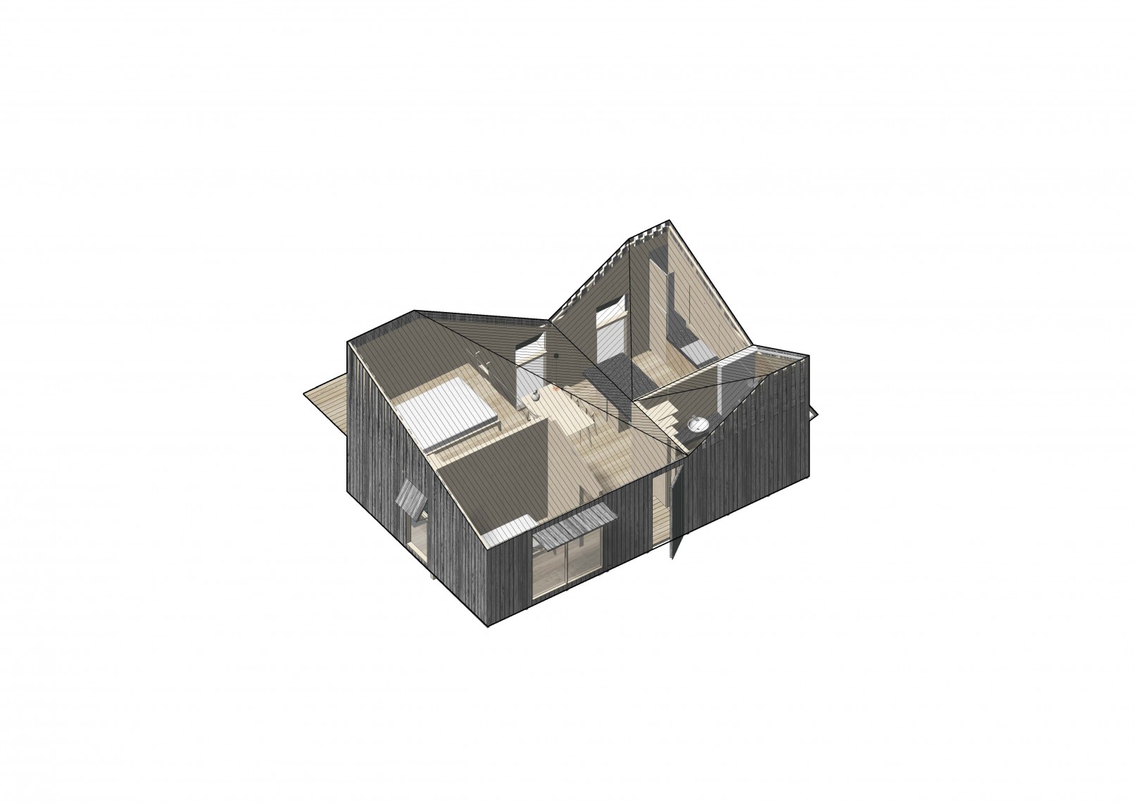 The competition brief asked for new designs using a prefabrication system able to produce from a play house or storage unit to a weekend home. The proposal presents a family of prefabricated elements, all created from the combination of three different modules, containing the same geometry.