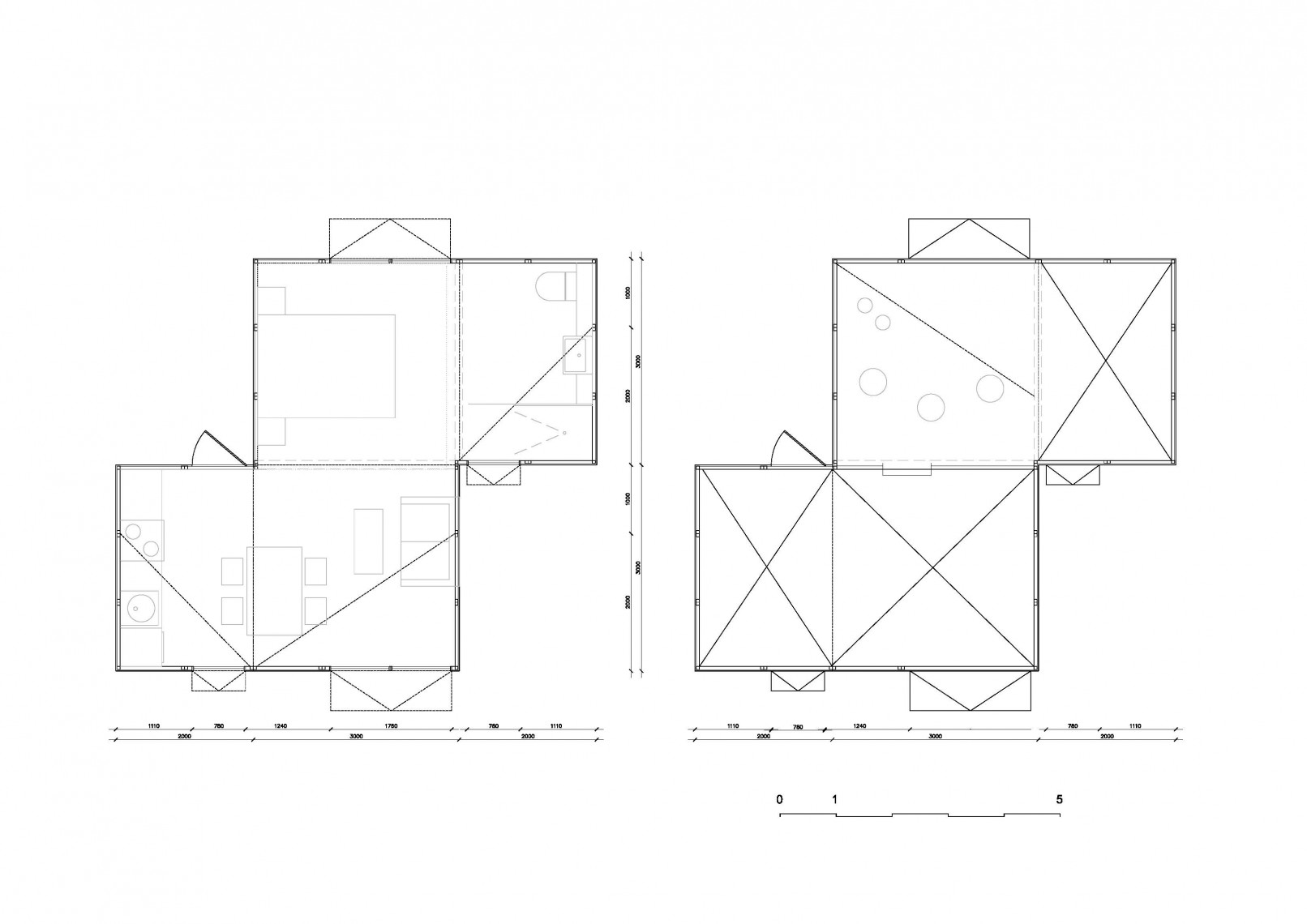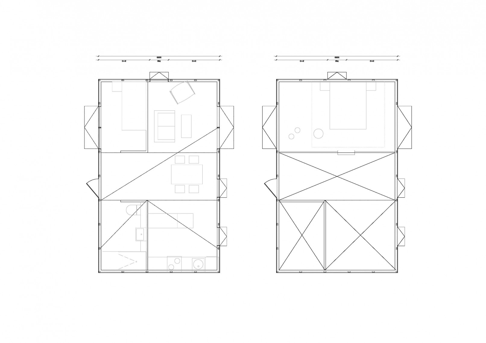 At the same time, the shape of the modules, with a roof tilted in one direction gives the possibility to create many different spatial situations, by mirroring or rotating the modules. As explained in the diagrams below, the same two elements combined can generate a typical pitch roof space or two different spaces in the same room, without the need of an internal partition.