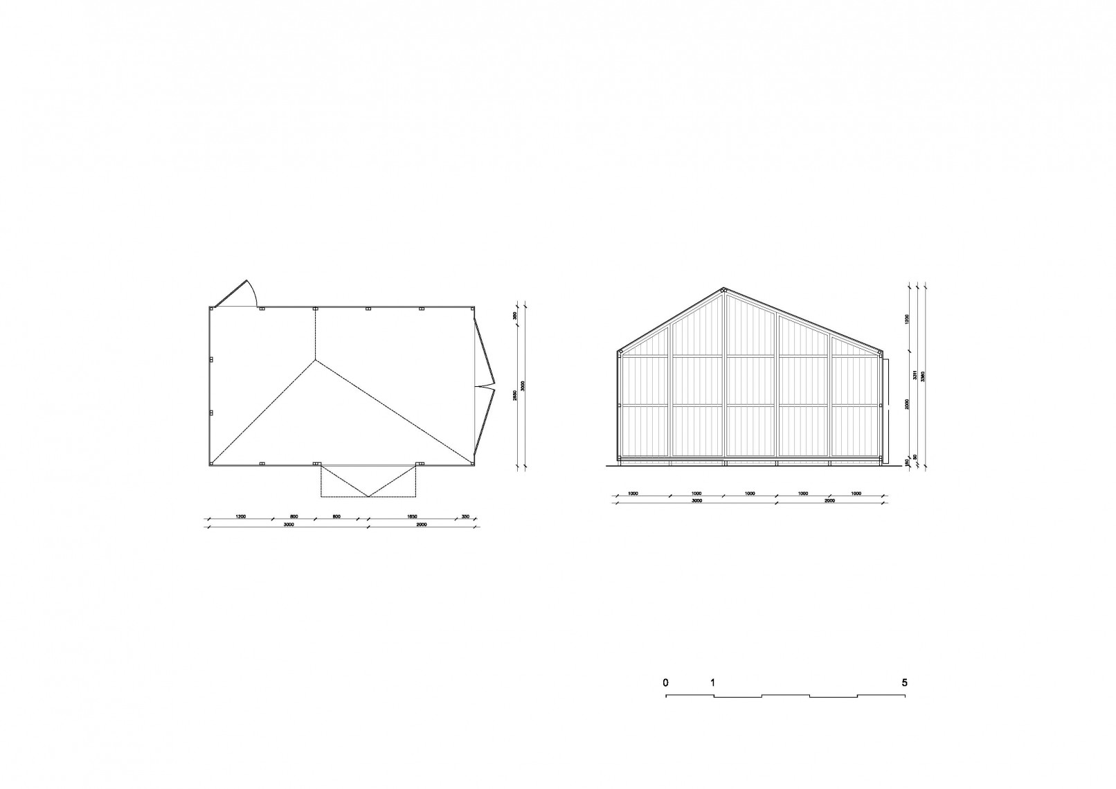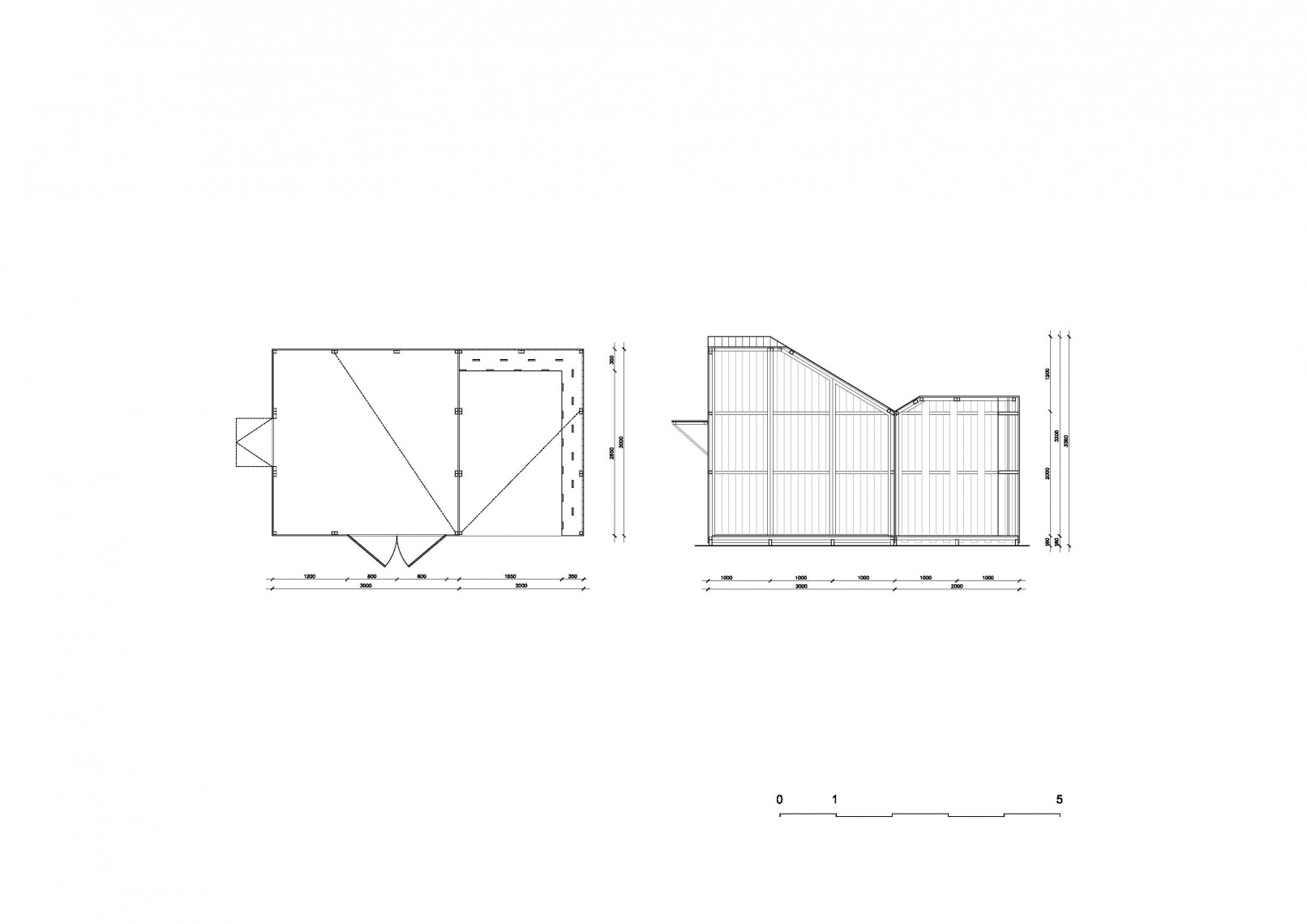 This geometry is replicated in three modules, each of them with different dimensions but same proportions and roof angles. The addition and combination of these basic pieces provides a range of volumetric solutions varying in size and spatial qualities. The general dimensions of the base panels and their roof slope are chosen to provide an adequate range of sizes and volumes so the system can provide an alternative for each family unit, from a 6 sqm playhouse to a 30 sqm cabin or 60 sqm weekend house, always using the same panelling.