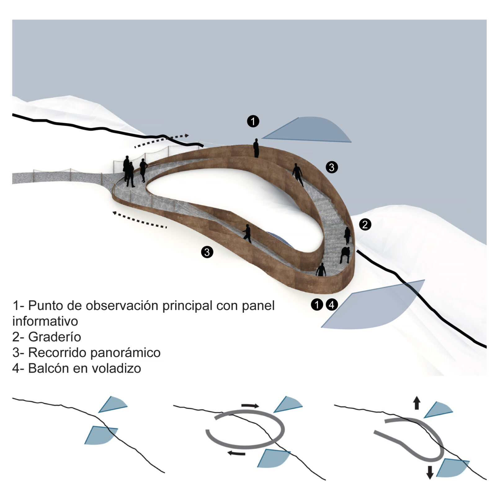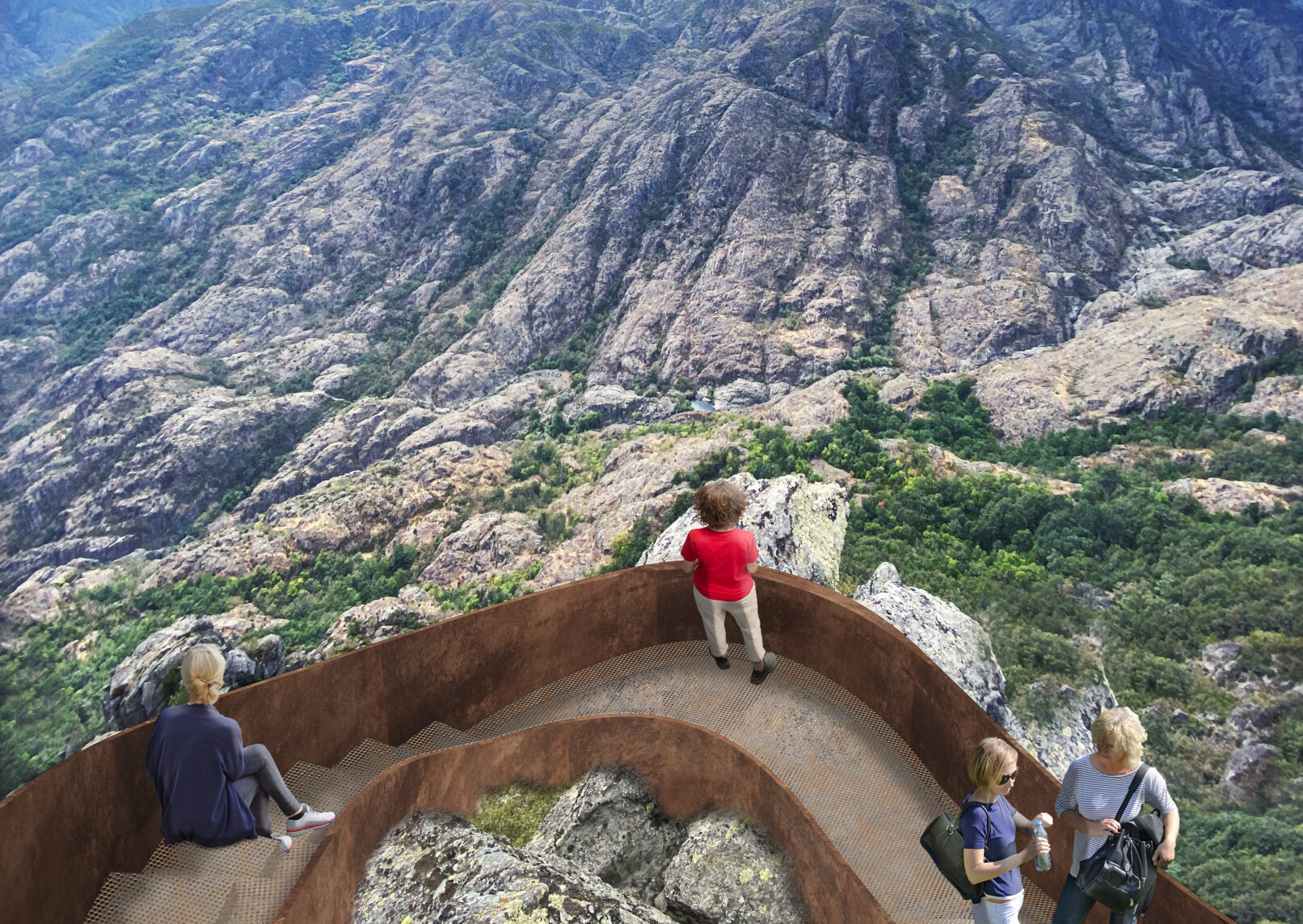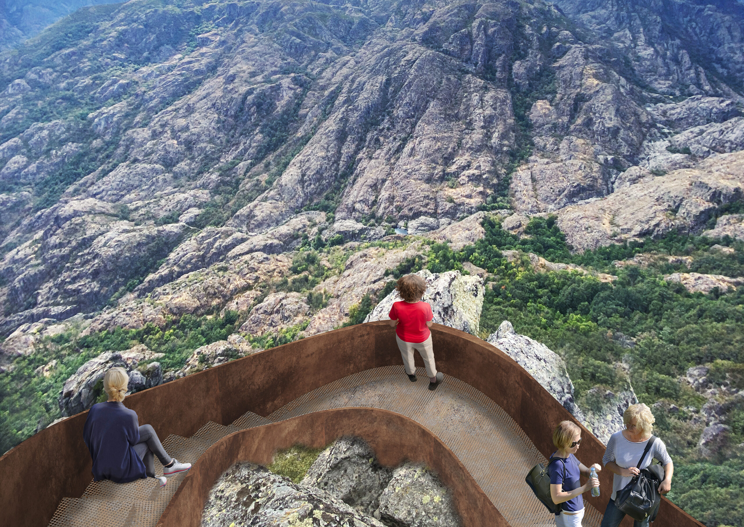 El nuevo mirador se sitúa sobre la montaña de roca formando un anillo. La amplitud de las vistas desde esta ubicación, que abarcan más de 180º desde el lago de Sanabria hasta el impresionante cañón del río Tera, nos lleva a proponer un mirador que funcione como un recorrido panorámico, adaptándose y apoyándose en la roca. Rodea la montaña existente para permitir que el visitante lo recorra y disfrute de las mejores vistas en cada punto. En su extremo norte, el mirador desciende para crear un balcón en voladizo donde el público puede asomarse o sentarse a contemplar las vistas del cañón al fondo. La diferencia de cota que salva el mirador en su recorrido se resuelve con una rampa y una escalera que se convierte en graderío orientado hacia el cañón, donde los visitantes pueden sentarse a disfrutar de las vistas de una manera más pausada.
