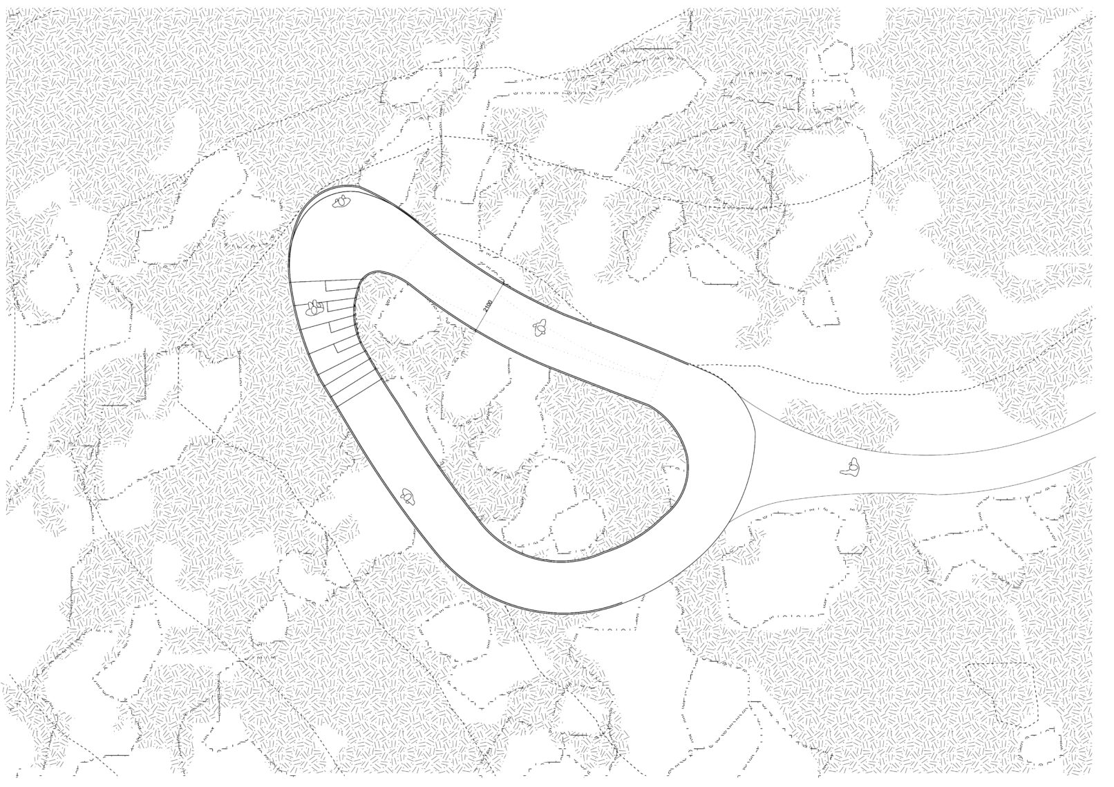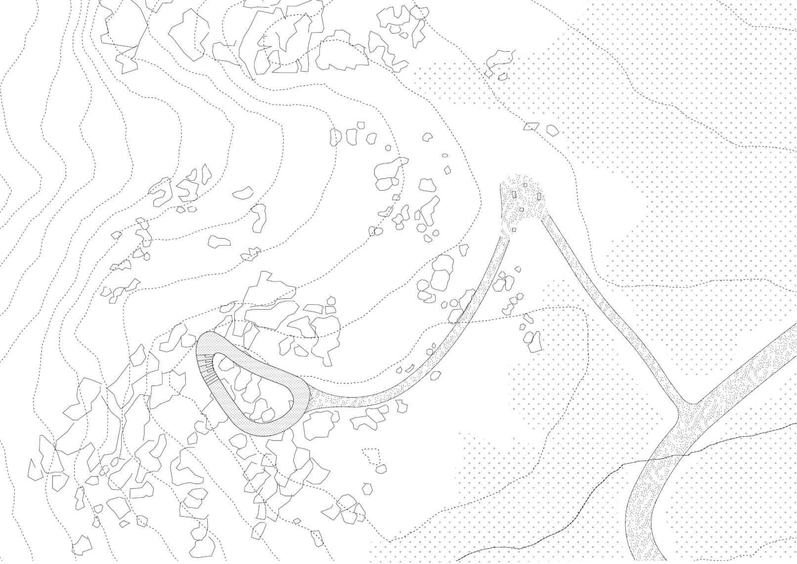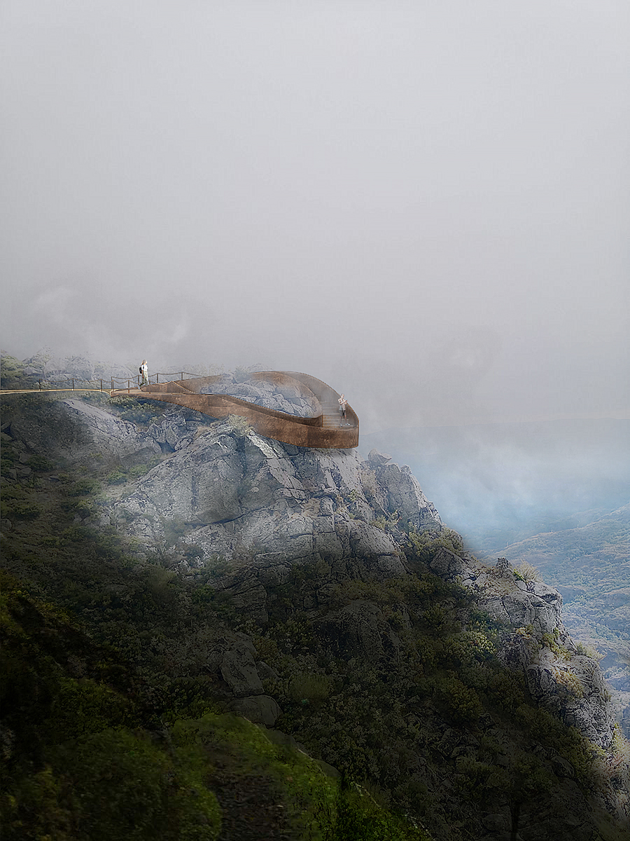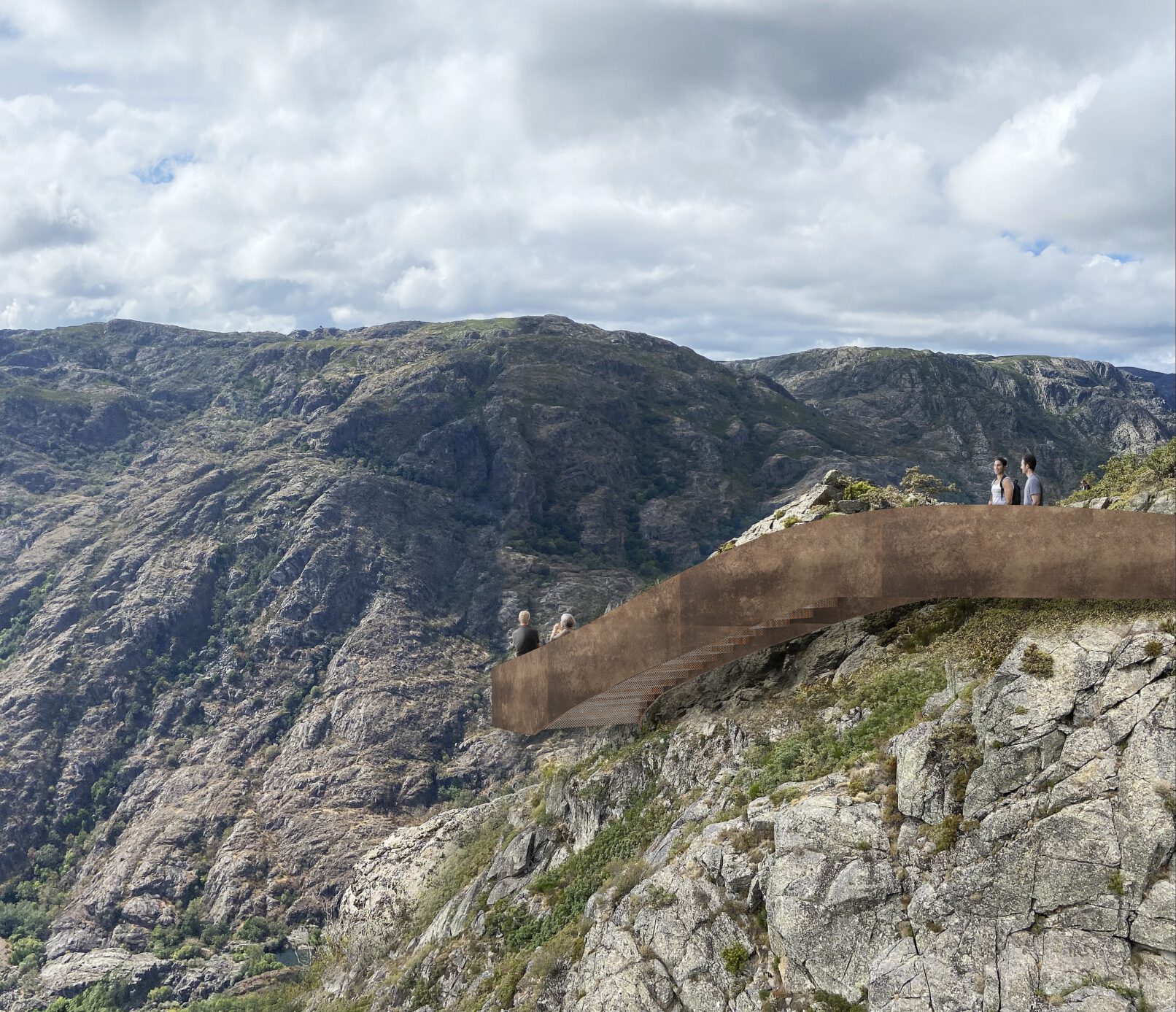 El nuevo mirador se sitúa sobre la montaña de roca formando un anillo. La amplitud de las vistas desde esta ubicación, que abarcan más de 180º desde el lago de Sanabria hasta el impresionante cañón del río Tera, nos lleva a proponer un mirador que funcione como un recorrido panorámico, adaptándose y apoyándose en la roca. Rodea la montaña existente para permitir que el visitante lo recorra y disfrute de las mejores vistas en cada punto. En su extremo norte, el mirador desciende para crear un balcón en voladizo donde el público puede asomarse o sentarse a contemplar las vistas del cañón al fondo. La diferencia de cota que salva el mirador en su recorrido se resuelve con una rampa y una escalera que se convierte en graderío orientado hacia el cañón, donde los visitantes pueden sentarse a disfrutar de las vistas de una manera más pausada.