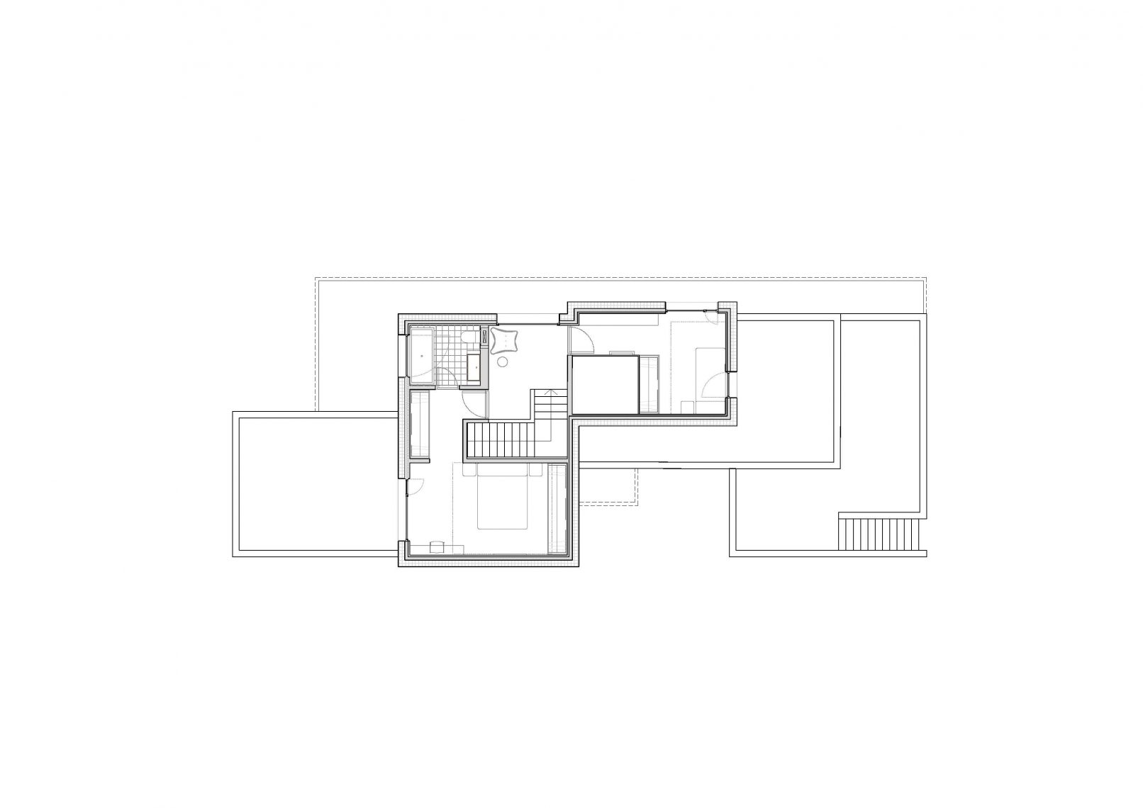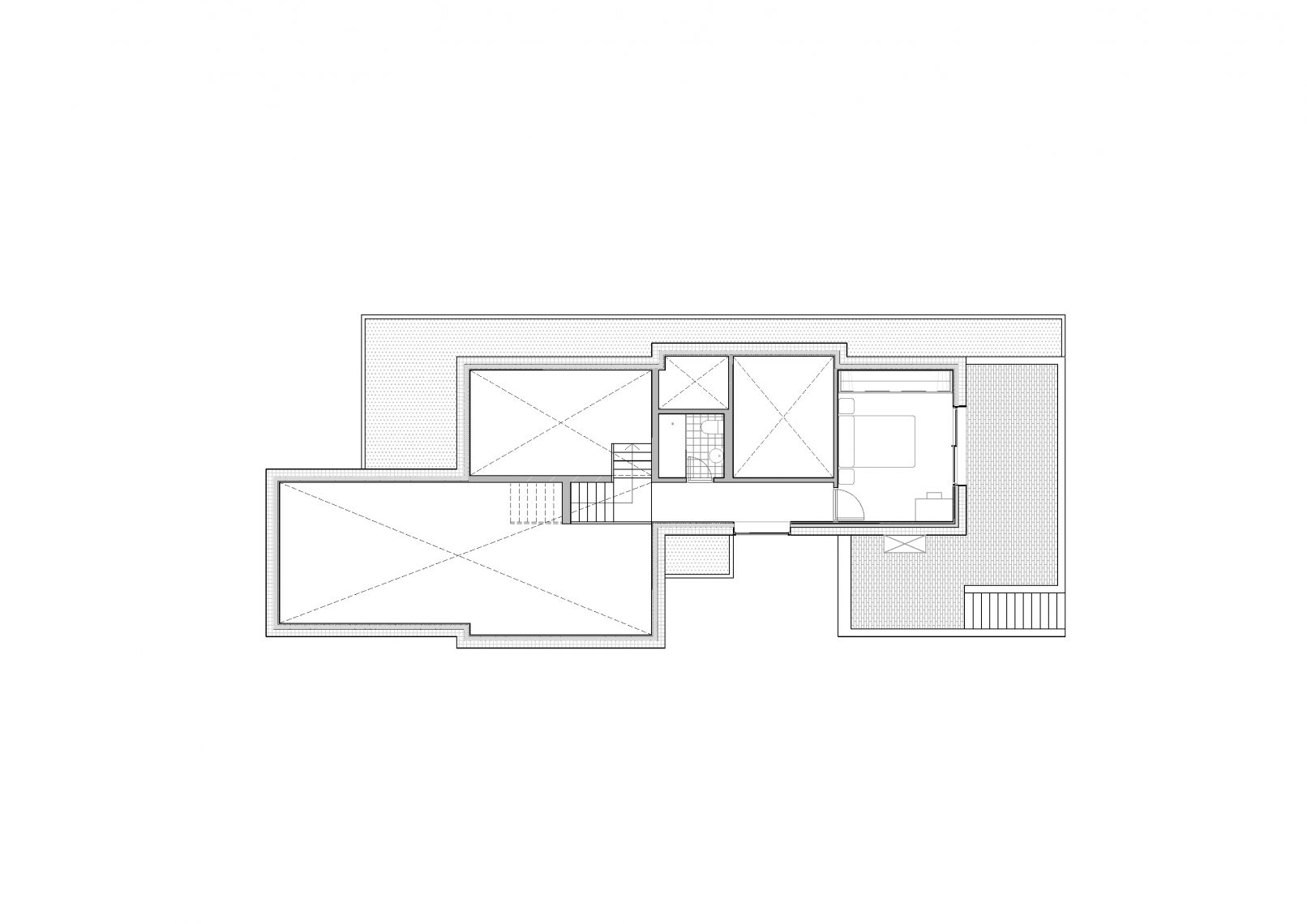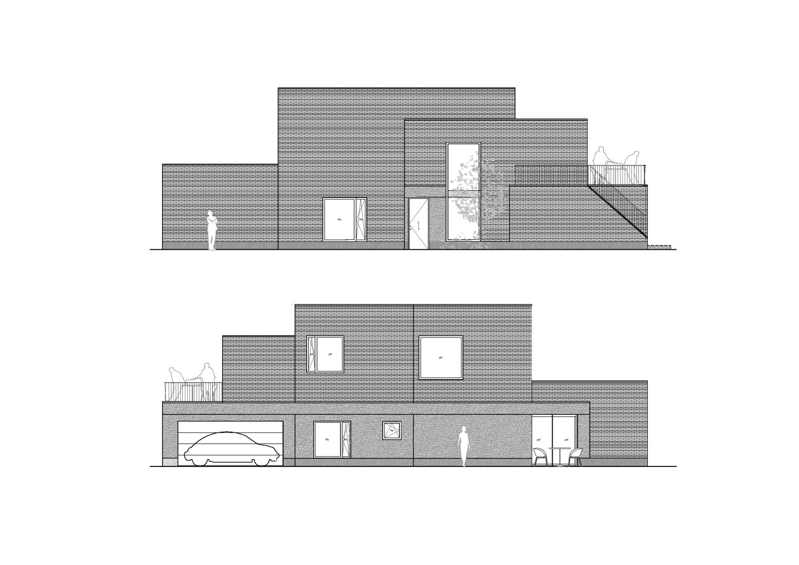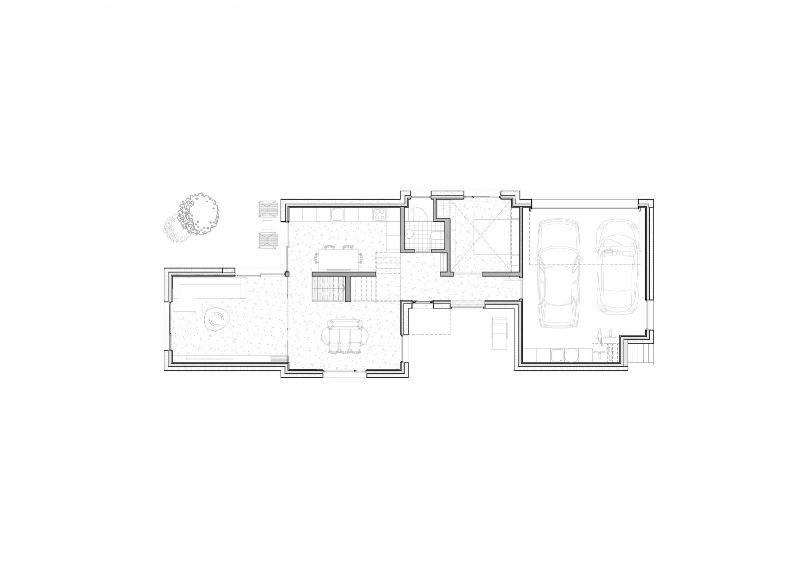 La superficie de la parcela exige una distribución en dos plantas, para poder cubrir las necesidades programáticas. Para reducir el impacto exterior del volumen, en lugar de recurrir a la habitual distribución en dos plantas, se crea un nivel intermedio, lo que permite escalonar los diferentes volúmenes y suavizar su impacto sobre la propia parcela y su entorno inmediato.