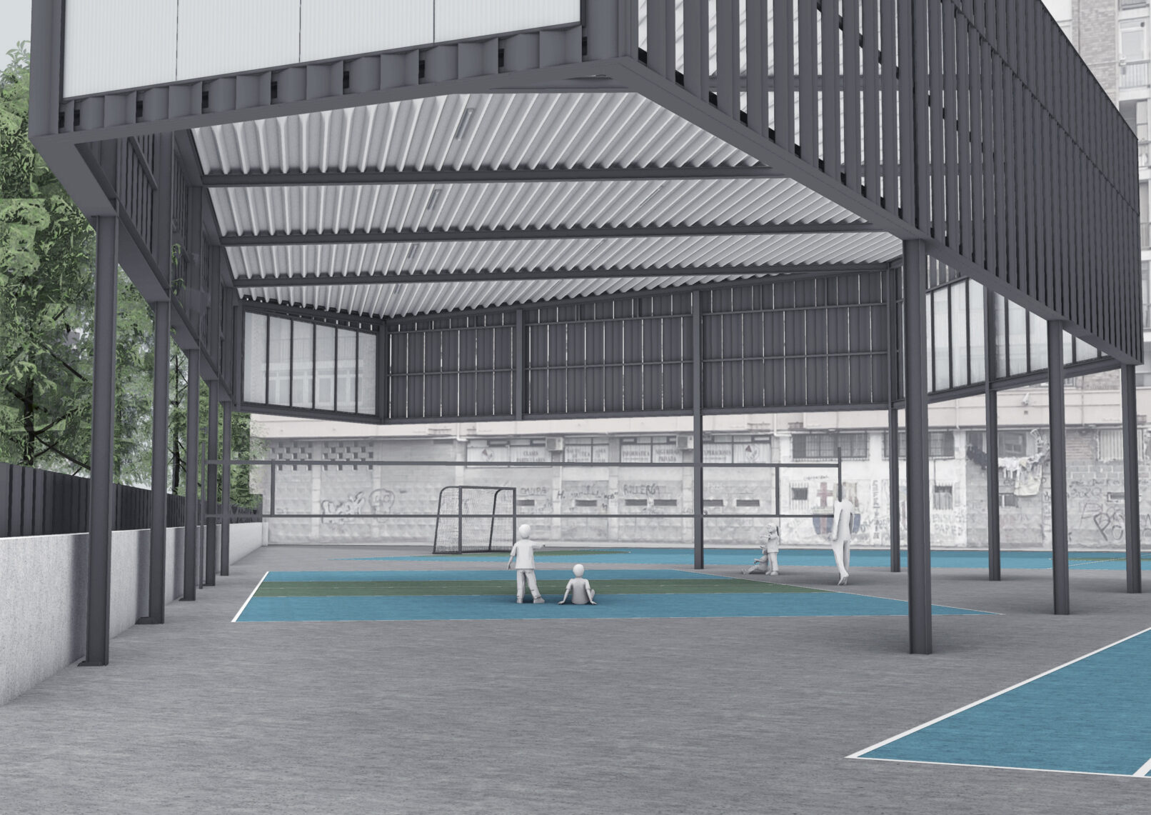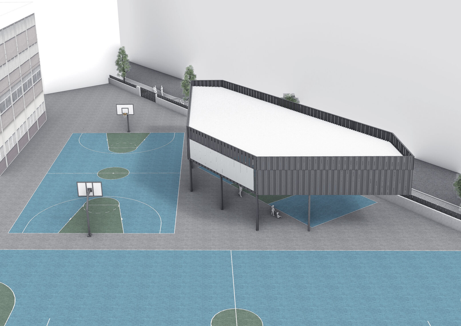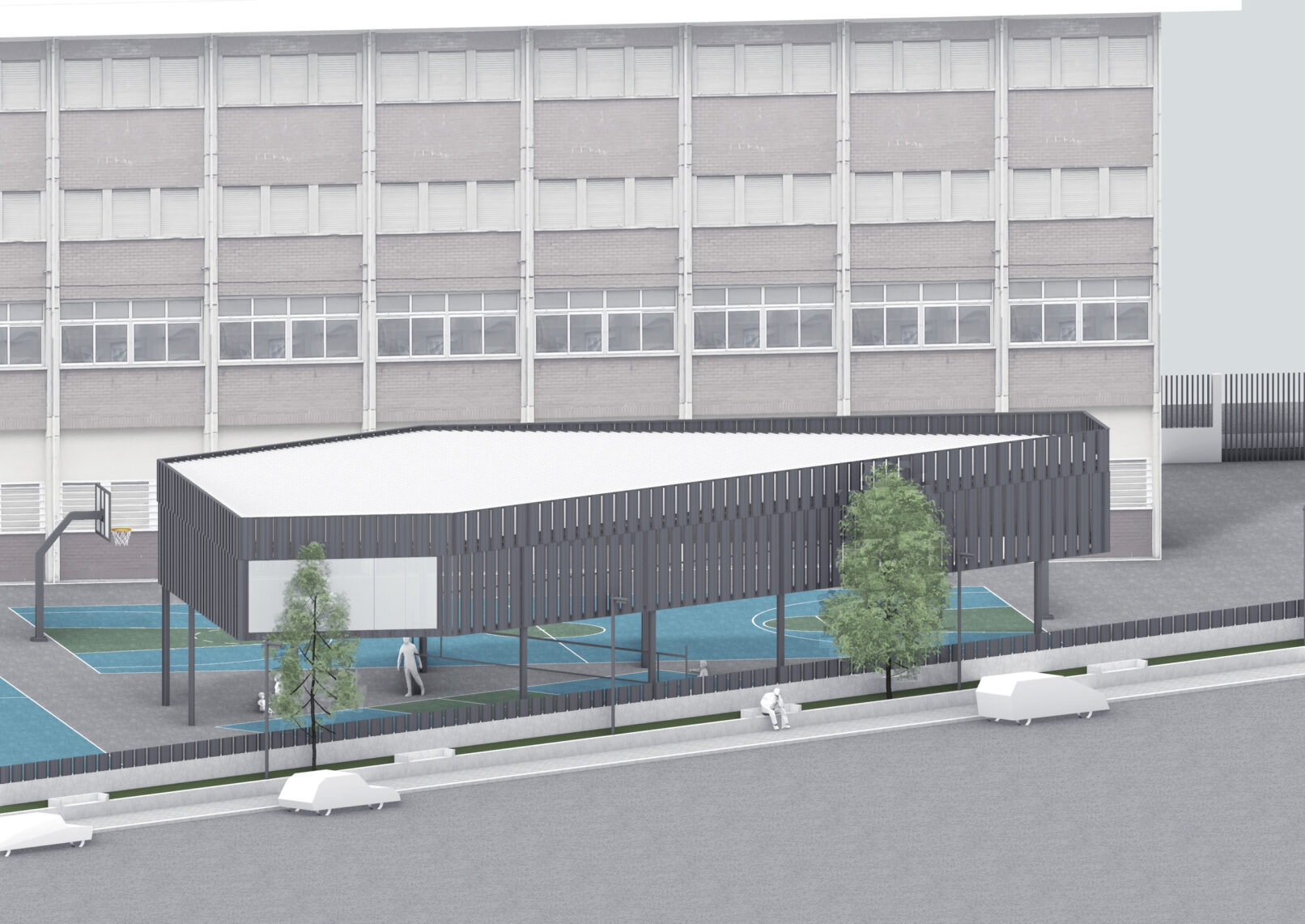 El patio actual dispone de 3 pistas deportivas de distintos tamaños y una zona de juego libre. La voluntad de la propuesta es mantener la versatilidad de usos actuales cubriendo una de las pistas existentes y reorganizando las restantes. La forma y localización del nuevo patio cubierto permite: