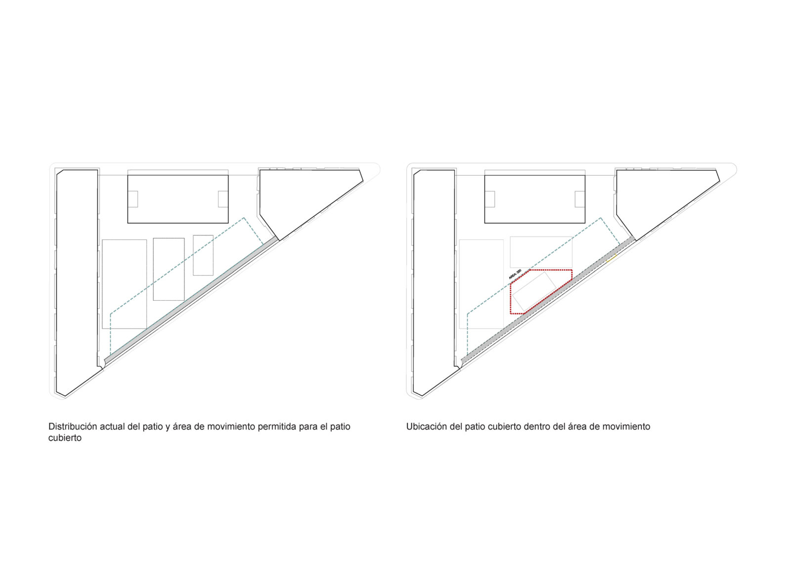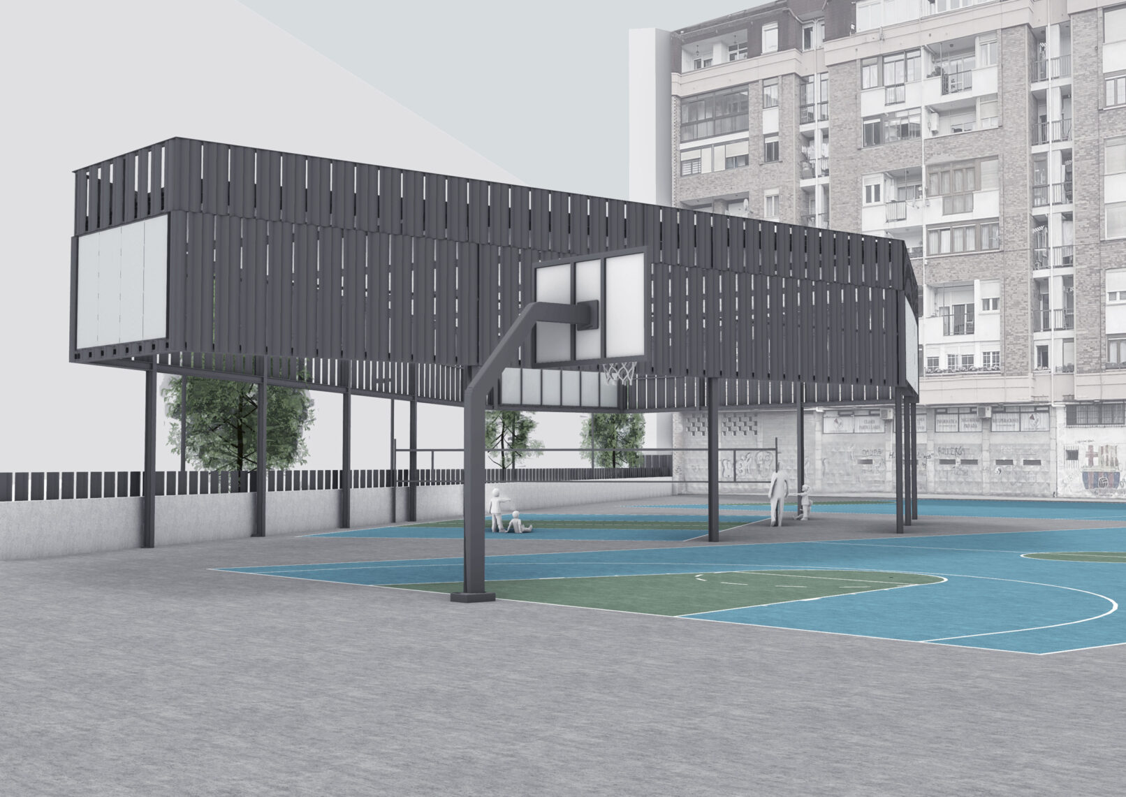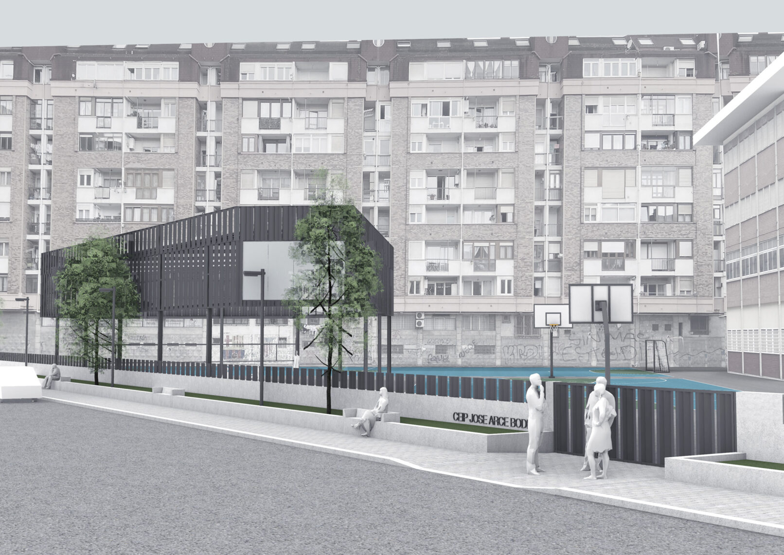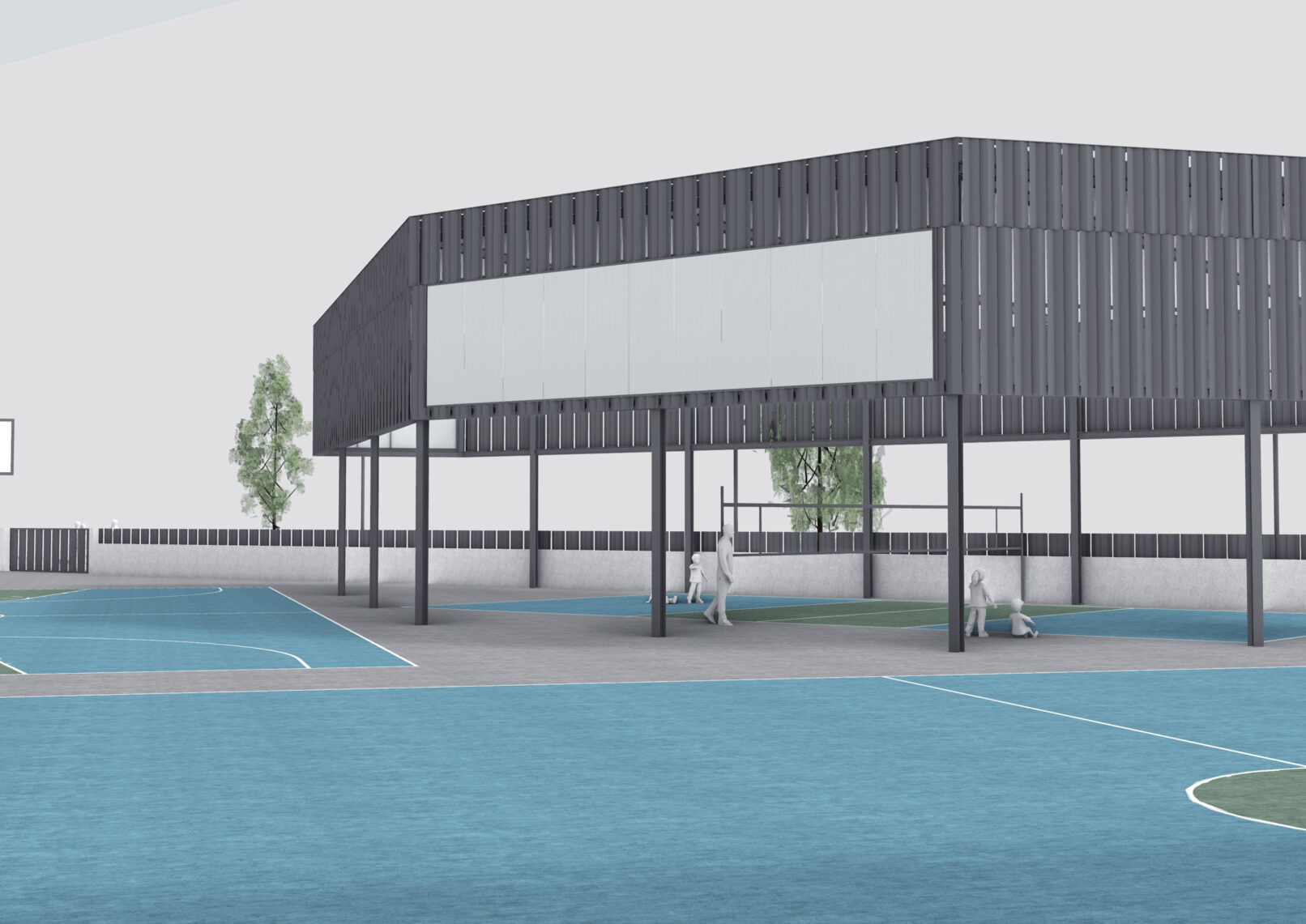 El patio actual dispone de 3 pistas deportivas de distintos tamaños y una zona de juego libre. La voluntad de la propuesta es mantener la versatilidad de usos actuales cubriendo una de las pistas existentes y reorganizando las restantes. La forma y localización del nuevo patio cubierto permite: