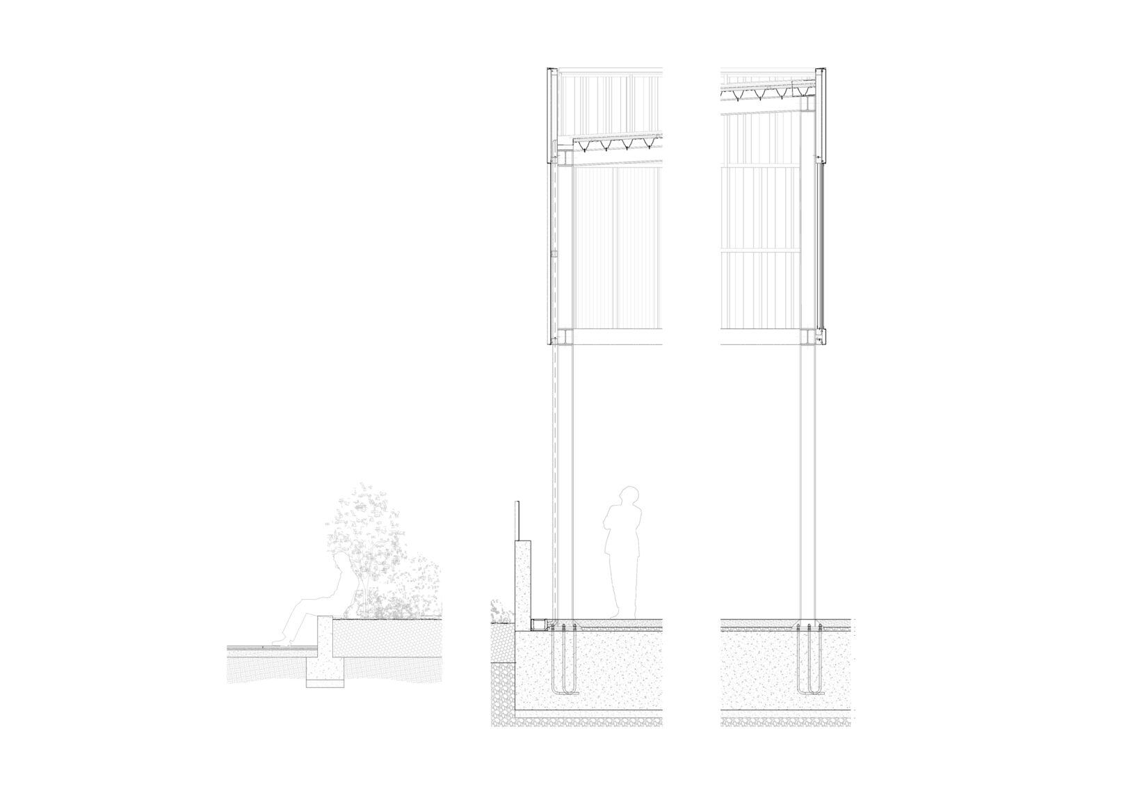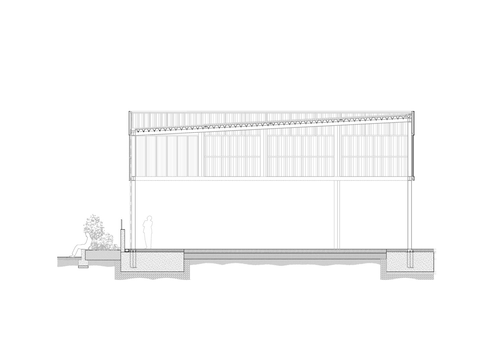 La nueva estructura se ejecuta mediante pórticos metálicos y una cubrición de chapa grecada. El perímetro se cubre en la zona superior para evitar que el viento pueda mojar la pista en días de climatología adversa. Para optimizar la iluminación natural, esta zona de paravientos se ejecuta mediante lamas metálicas en forma de V separadas entre sí, de tal manera que se permita el paso de la luz natural pero se proteja del viento y la lluvia. La iluminación natural se incrementa sustituyendo este cierre de lamas por policarbonato traslucido en los chaflanes, que actúan así como “ventanas” del cerramiento.