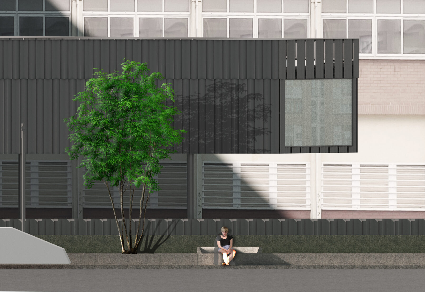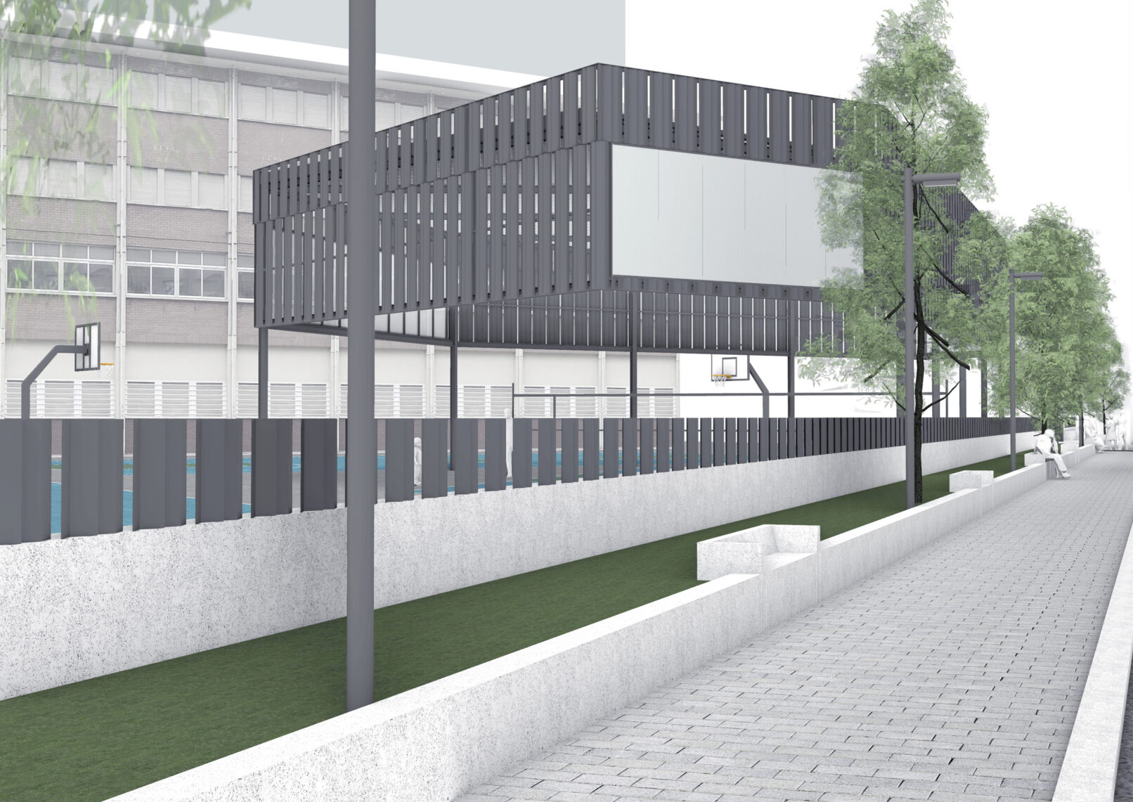 El encuentro entre la nueva forma trapezoidal generada, y el vial público, se resuelve creando dos chaflanes en ambos extremos, con el fin de suavizar el impacto visual desde el exterior del conjunto escolar.