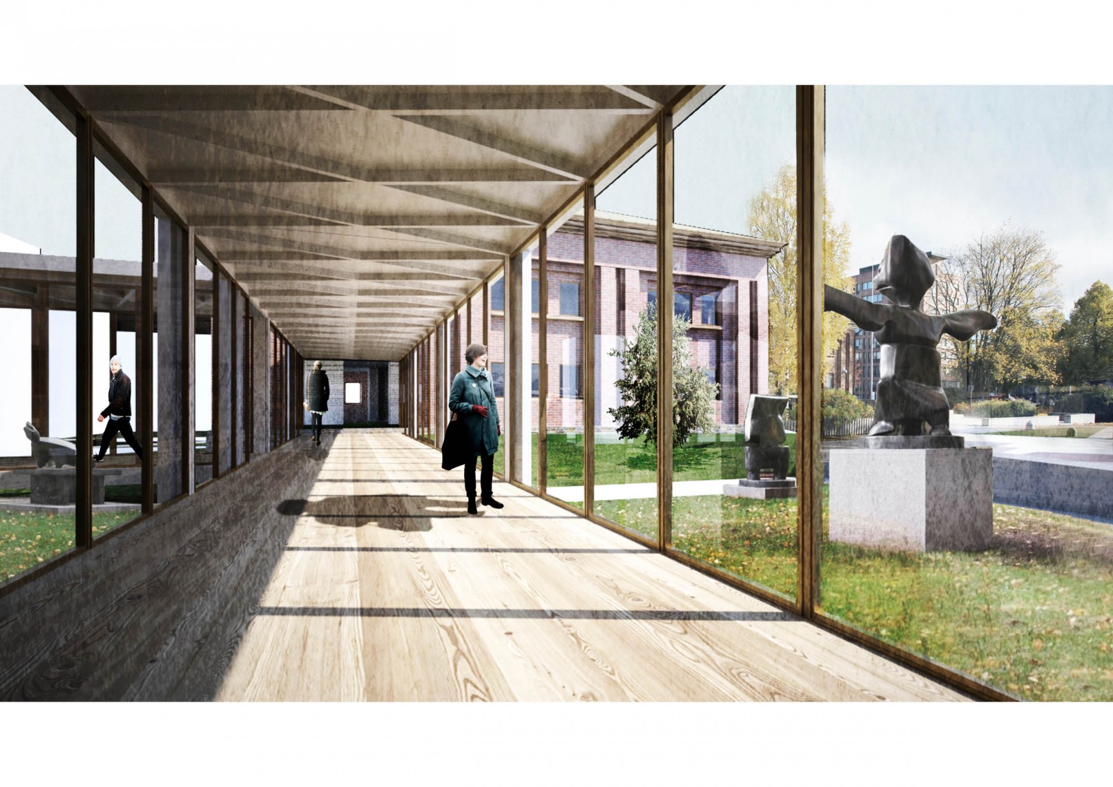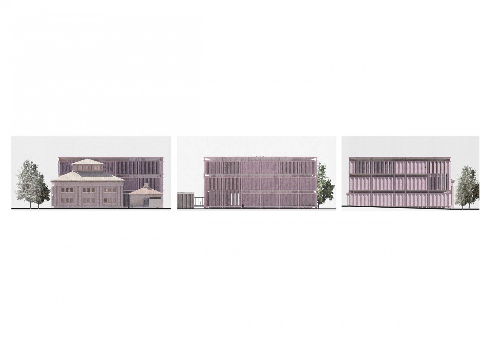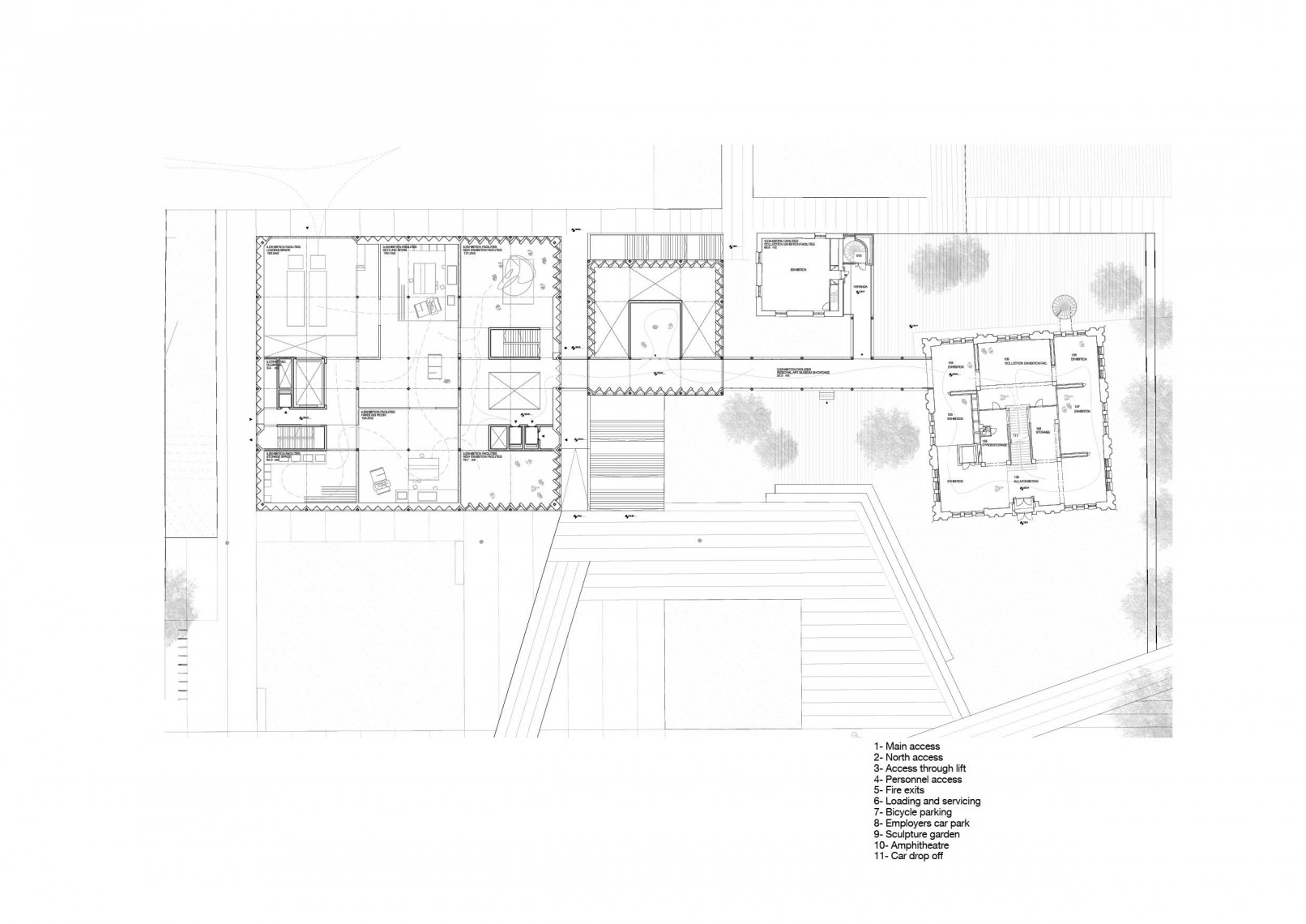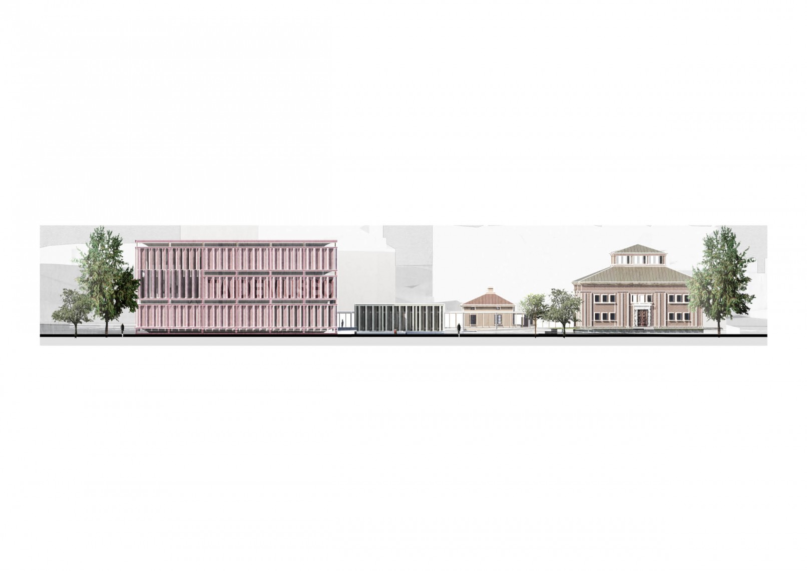 The proposal for the new museum suggests treating the current building and the extension as two equal entities, moving the new access to an independent volume between them. A neutral volume acting as entrance, connection and articulation between old and new volumes.