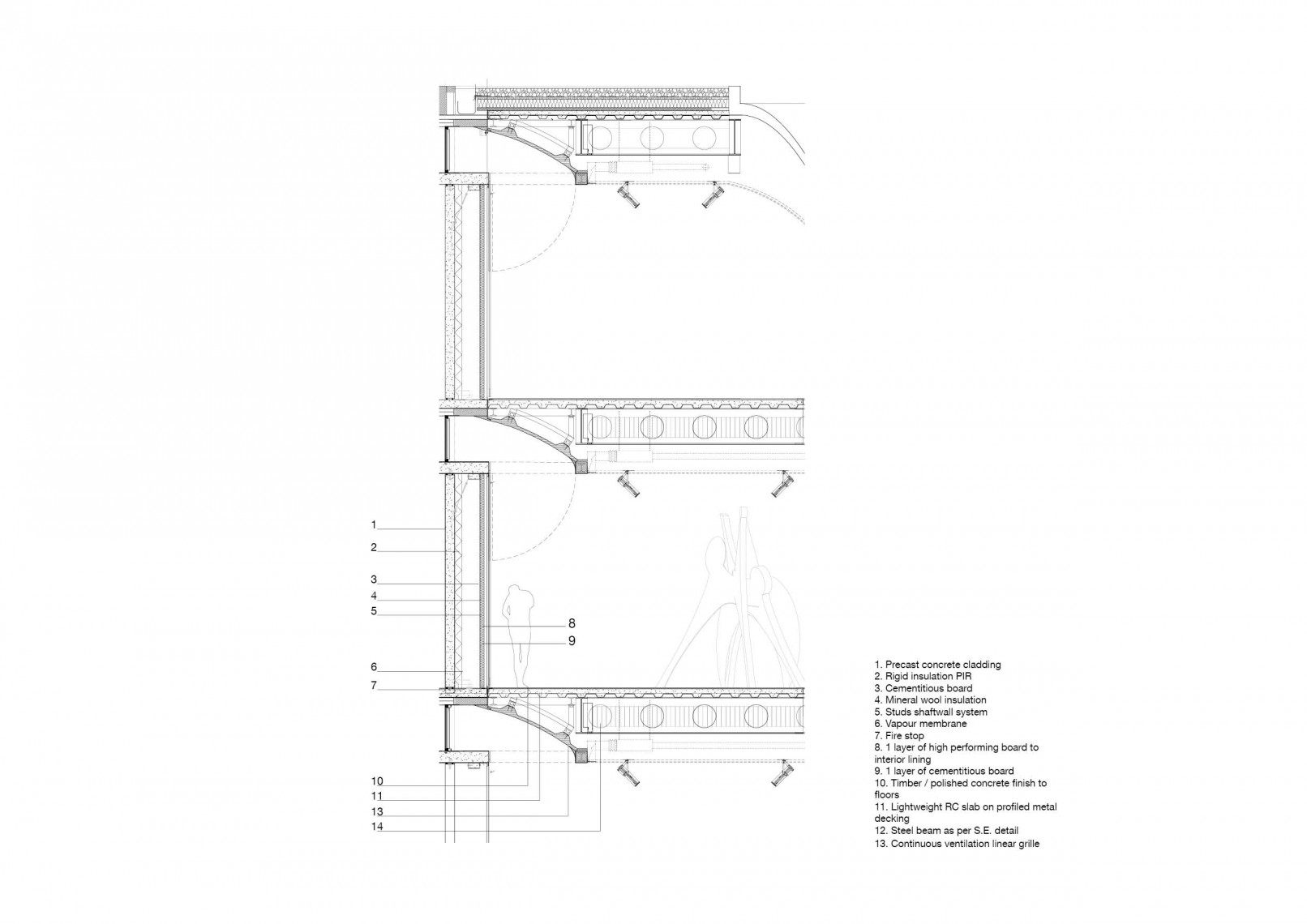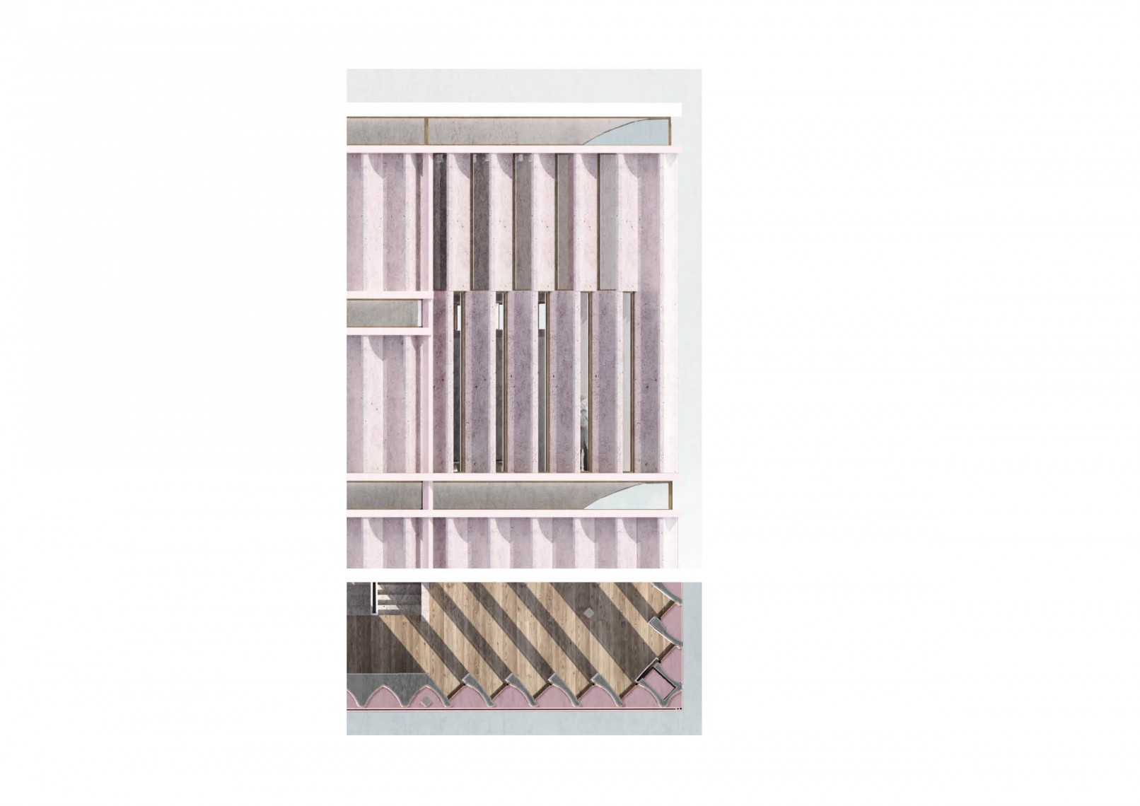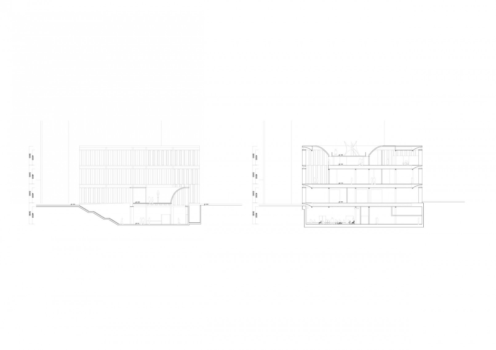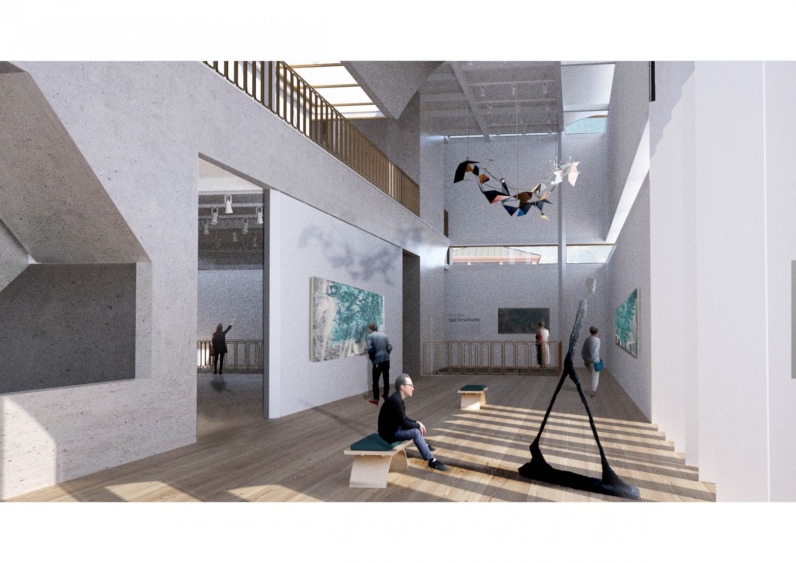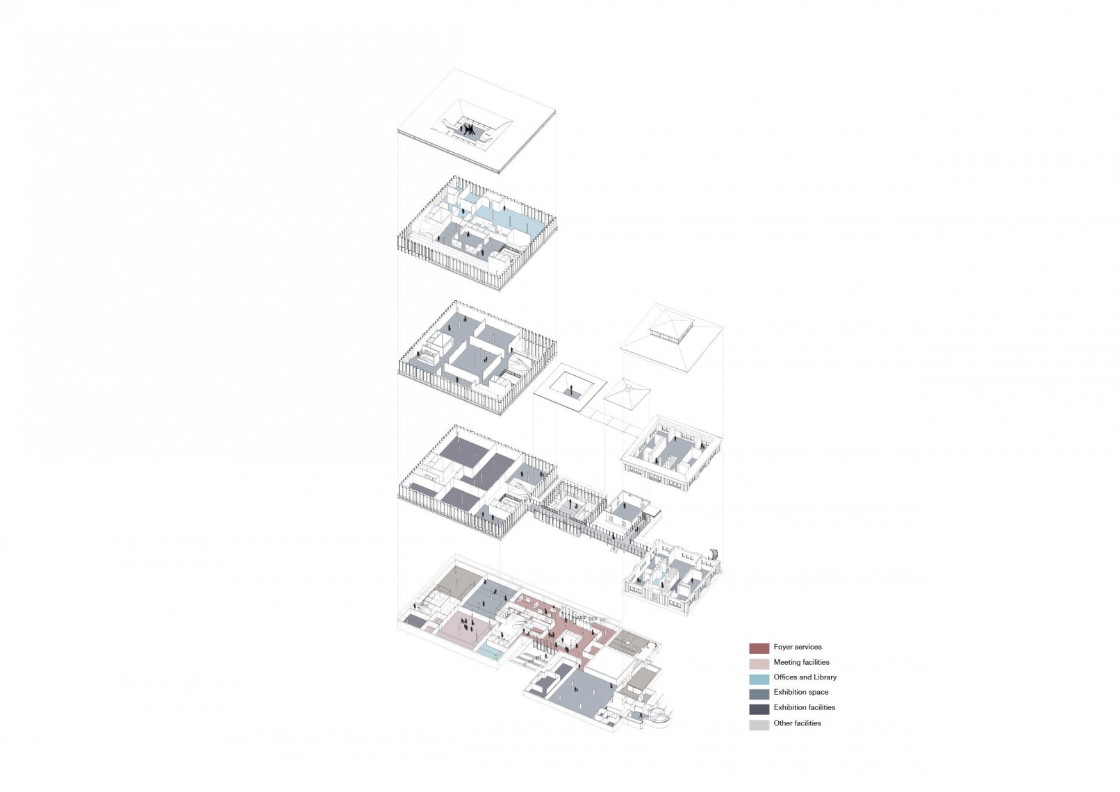 On the outside a generous staircase leads visitors towards the foyer, a double height space with zenith lighting coming from the perimeter. From this central space, directly connected to all public and social programs, visitors can access both the permanent exhibitions in the existing building or the temporary ones on the extension.