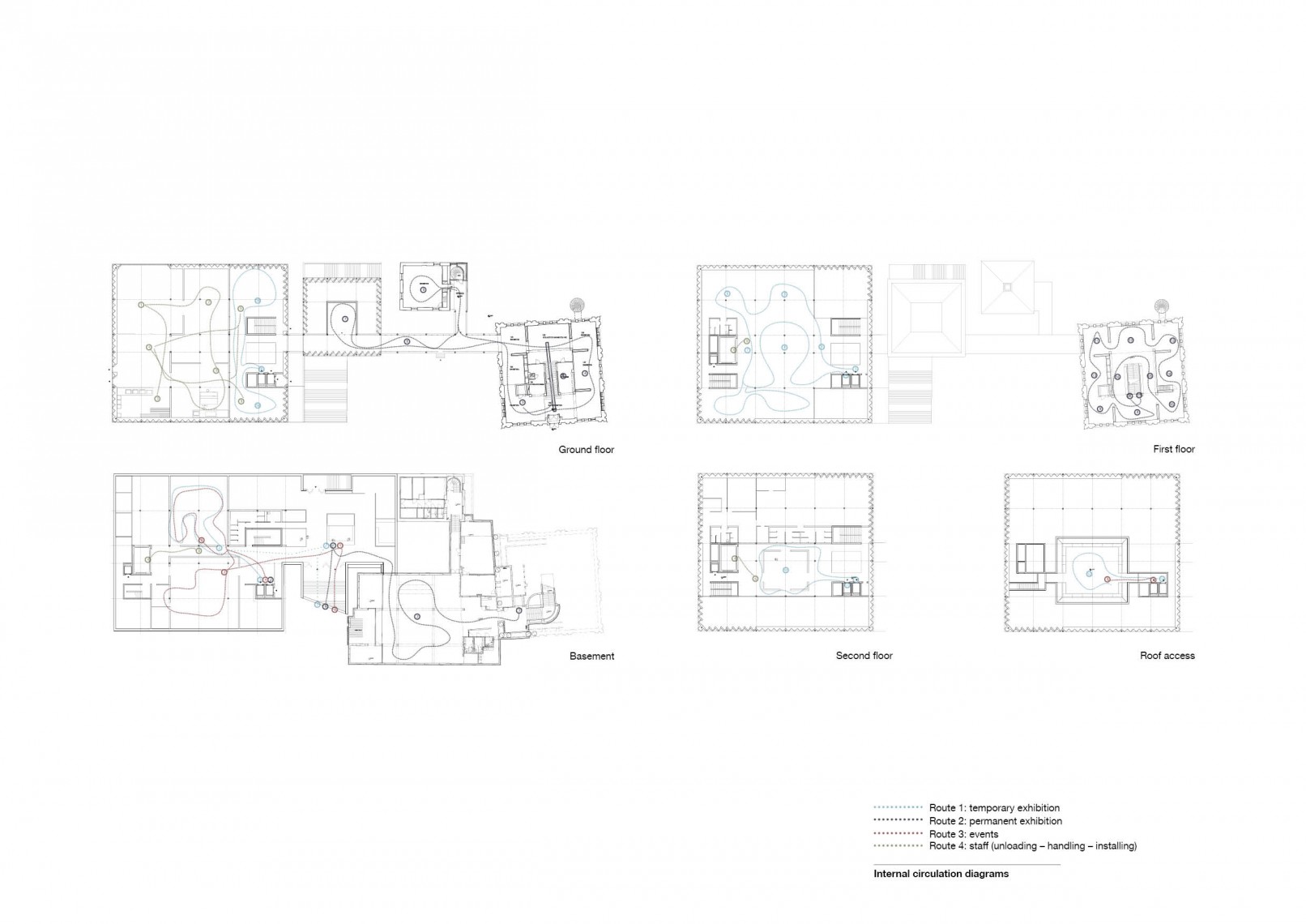 On the upper floor a bridge above the foyer connects again both buildings, creating a loop in the exhibition tour. This link becomes not only a circulation space but also part of the exhibition experience.