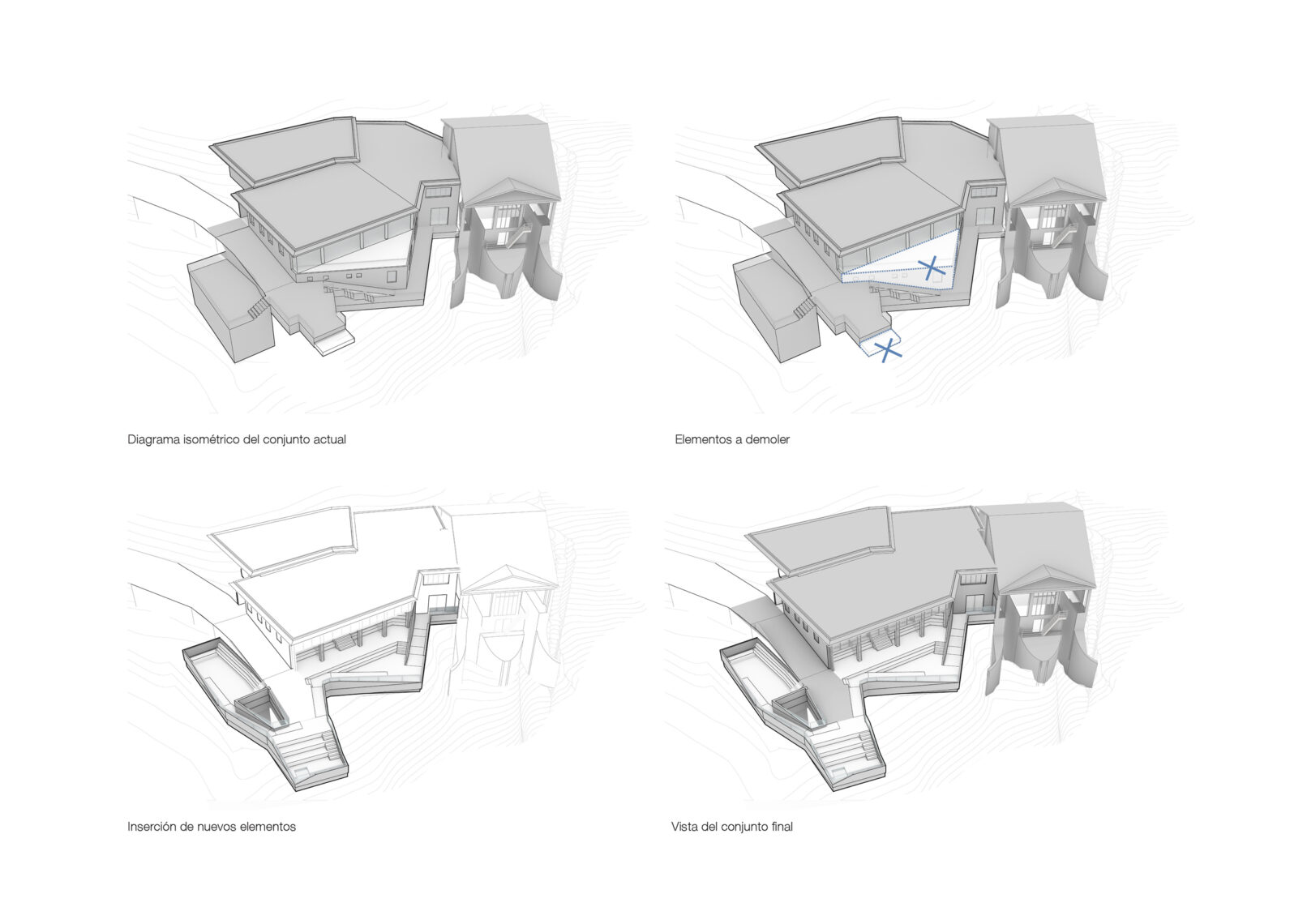 La solución propuesta plantea la sustitución de la plataforma sobre la que actualmente se sitúa la terraza para convertirlo en un graderío. Un escalonamiento gradual conecta el nivel de la cafetería con el itinerario exterior de acceso al conjunto y sirve de plataforma intermedia de contemplación asociada al establecimiento hostelero.