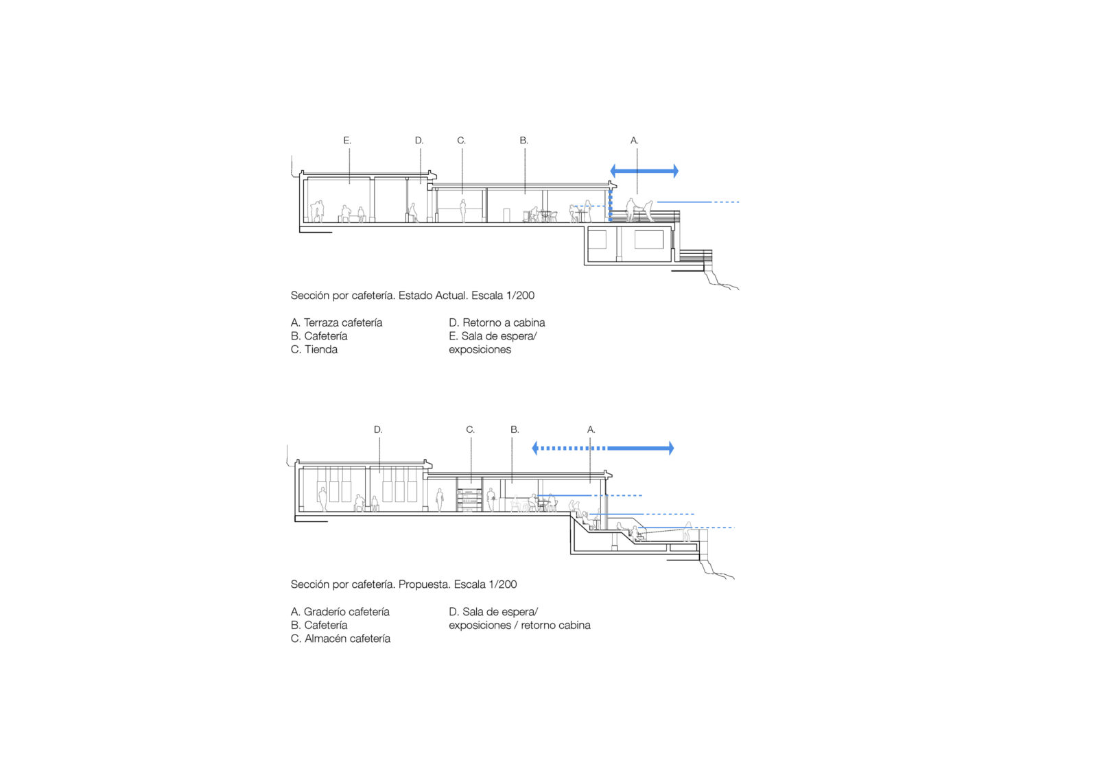 intervención que engloba ambas áreas en una única actuación. El conjunto resultante se podría leer como un itinerario paisajístico, que conduce al visitante desde la llegada en cabina hasta su retorno, a través de una serie de miradores, rampas y graderíos que enmarcan el paisaje e invitan a su contemplación de una manera dinámica, más pausada, o incluso estática; en el exterior, a cubierto o desde el interior.