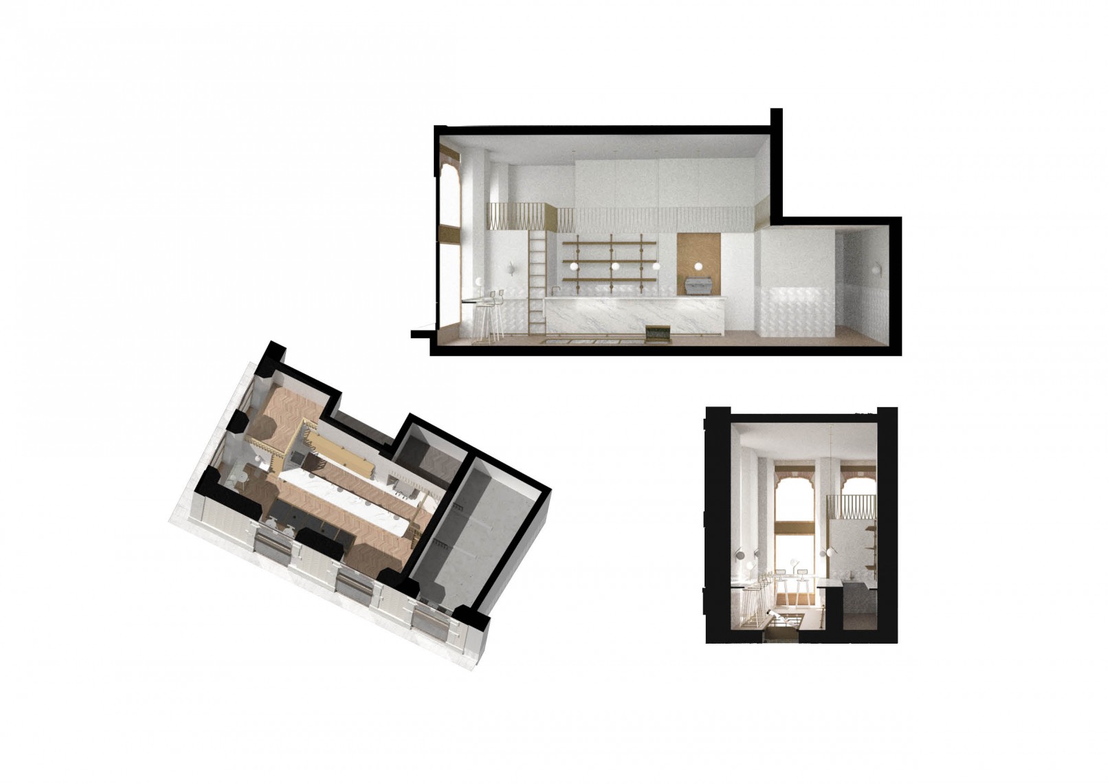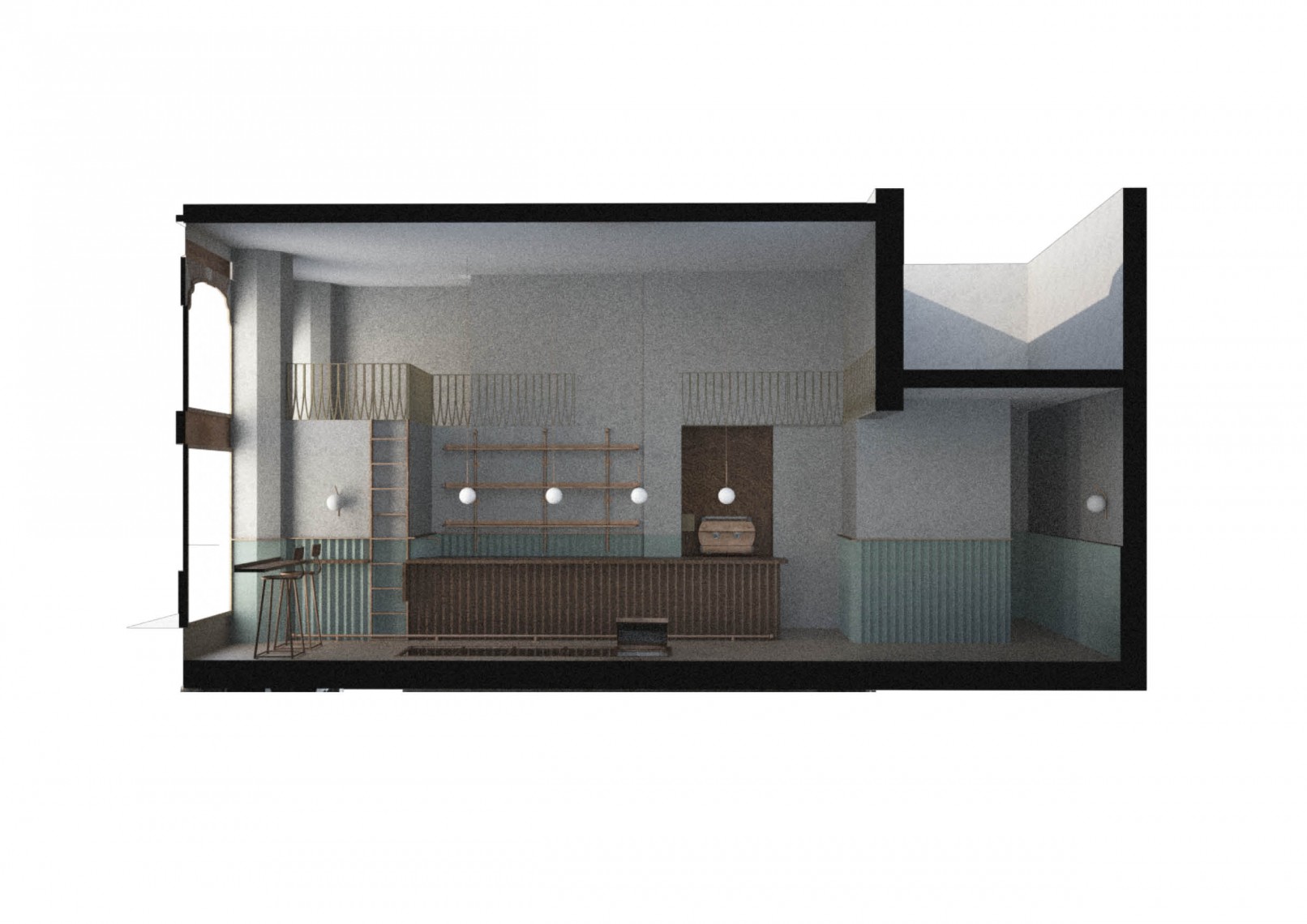 Esta distribución perimetral se enfatiza con un zócalo a gran altura, rematado por un estante continuo que servira como mesa elevada para el publico del local. De esta forma la propia arquitectura y acabados funcionan como mobiliario, evitando el uso de elementos adicionales que reducirían el espacio ya de por si limitado.