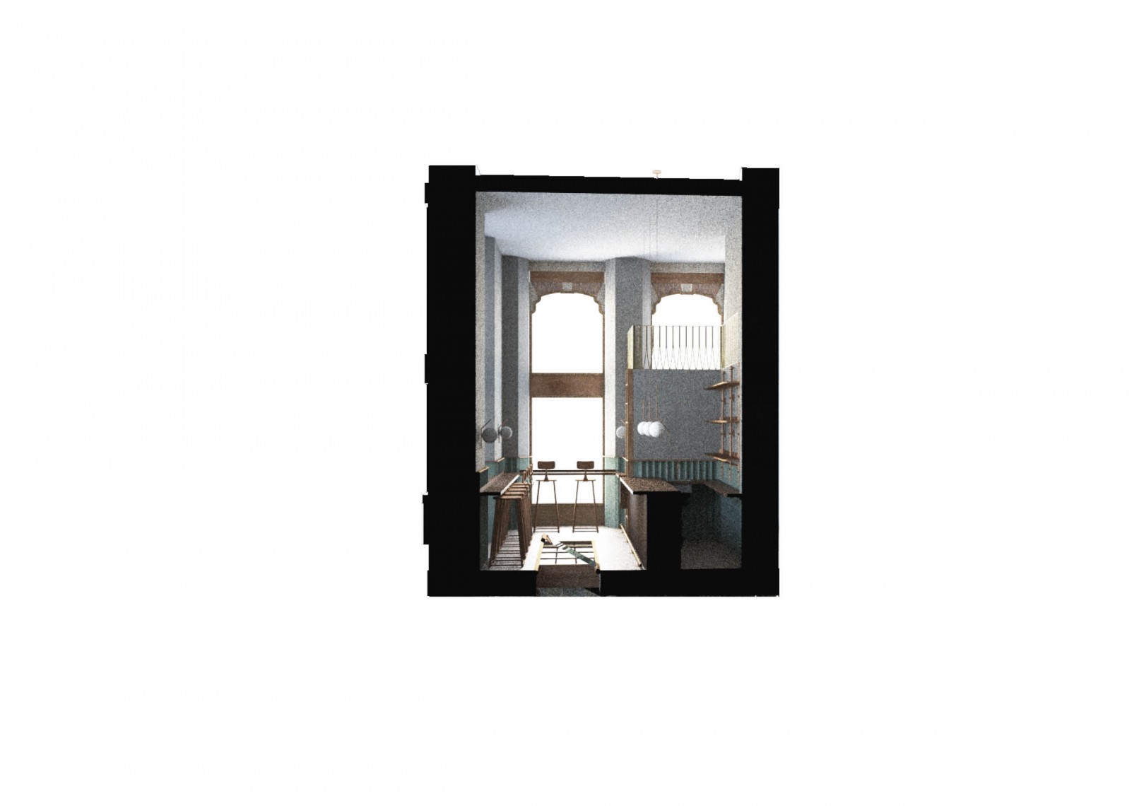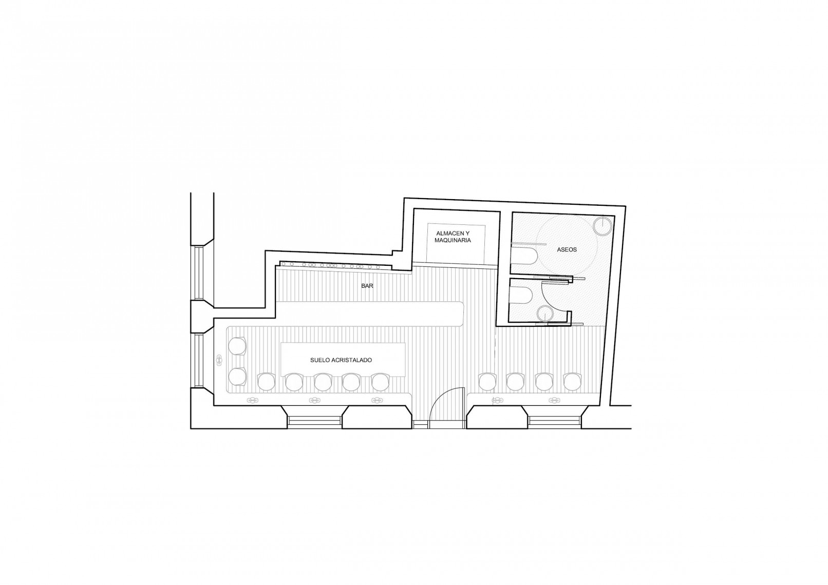 Partiendo de la distribución interior ya planteada se propone un tratamiento de acabados y mobiliario que ayude a potenciar el espacio. La proporción y dimensiones del local nos llevan a centrar la atención en el mostrador del bar y su muro posterior, convirtiendolos en los elementos centrales, mientras que la zona de estar para el publico se distribuye a lo largo del perímetro del local.