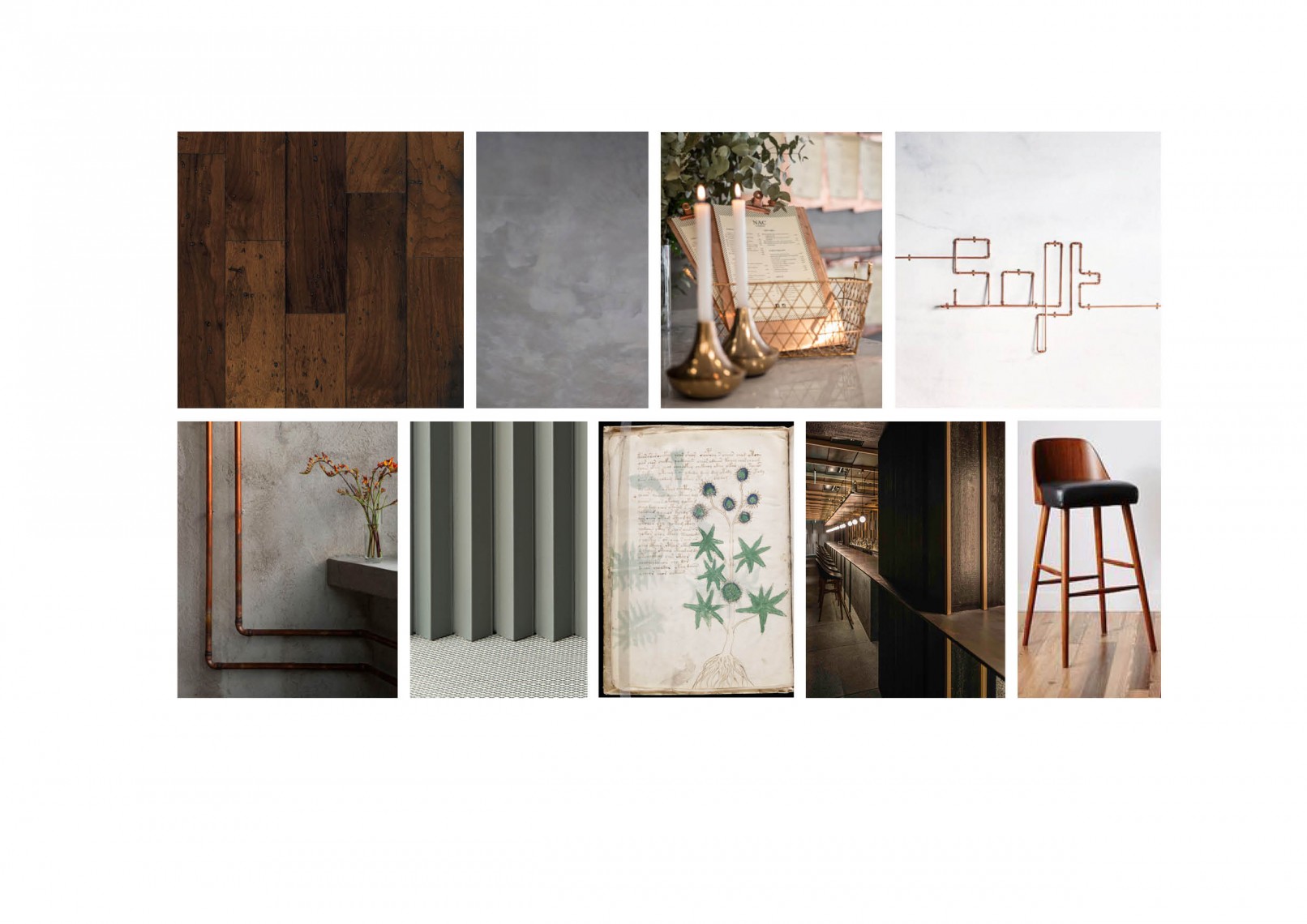 This first option approaches the design from its relation with the Voynich Manuscript (an illustrated codex hand-written in an unknown writing system from 1666), proposing a palette of materials with warm and dark tones, wooden and antique atmosphere.