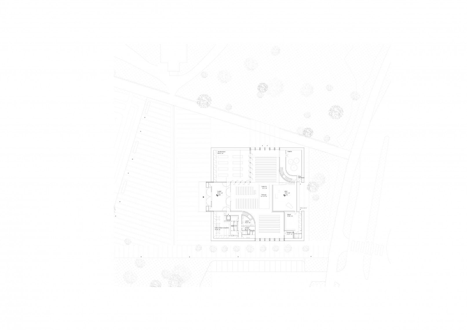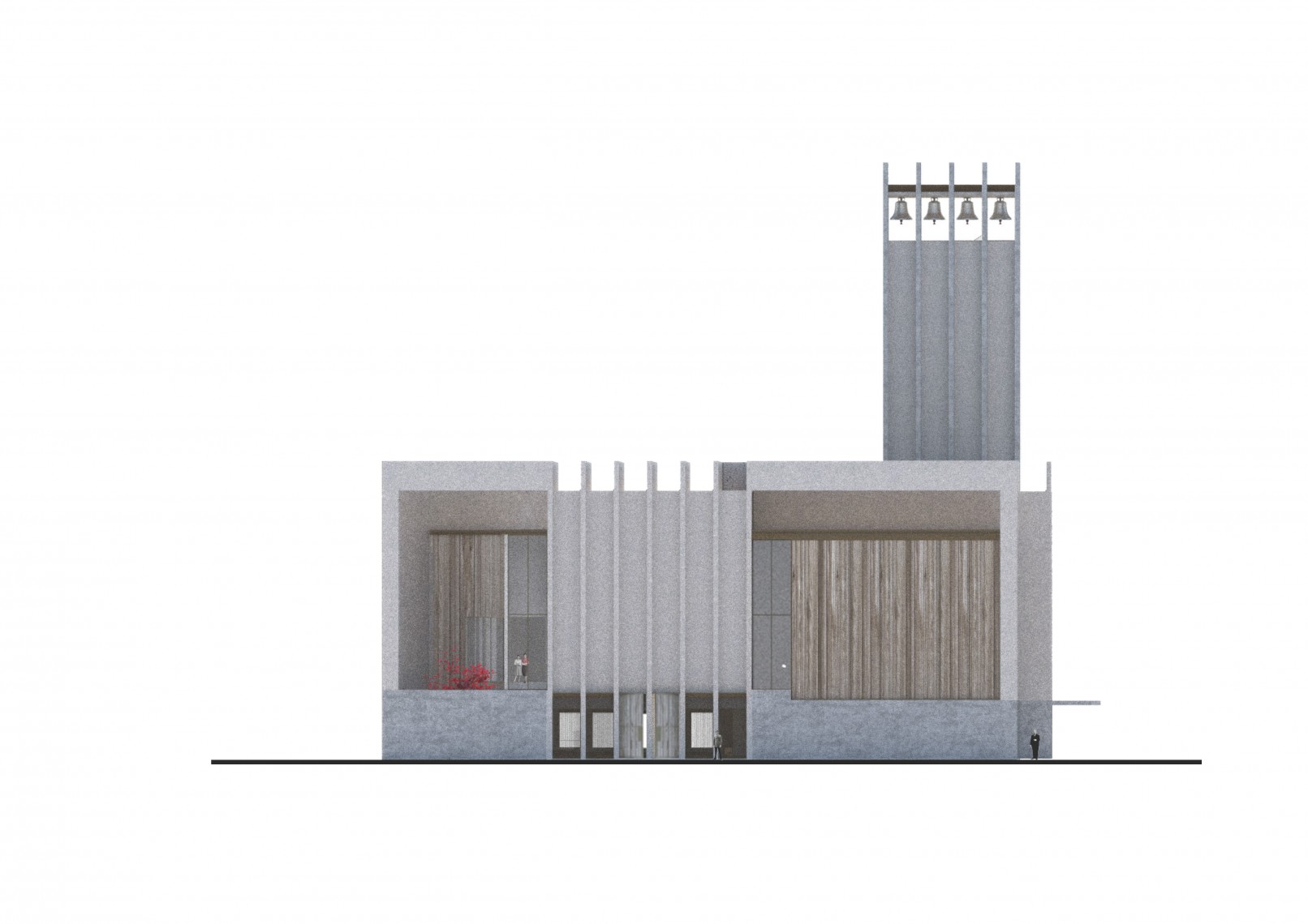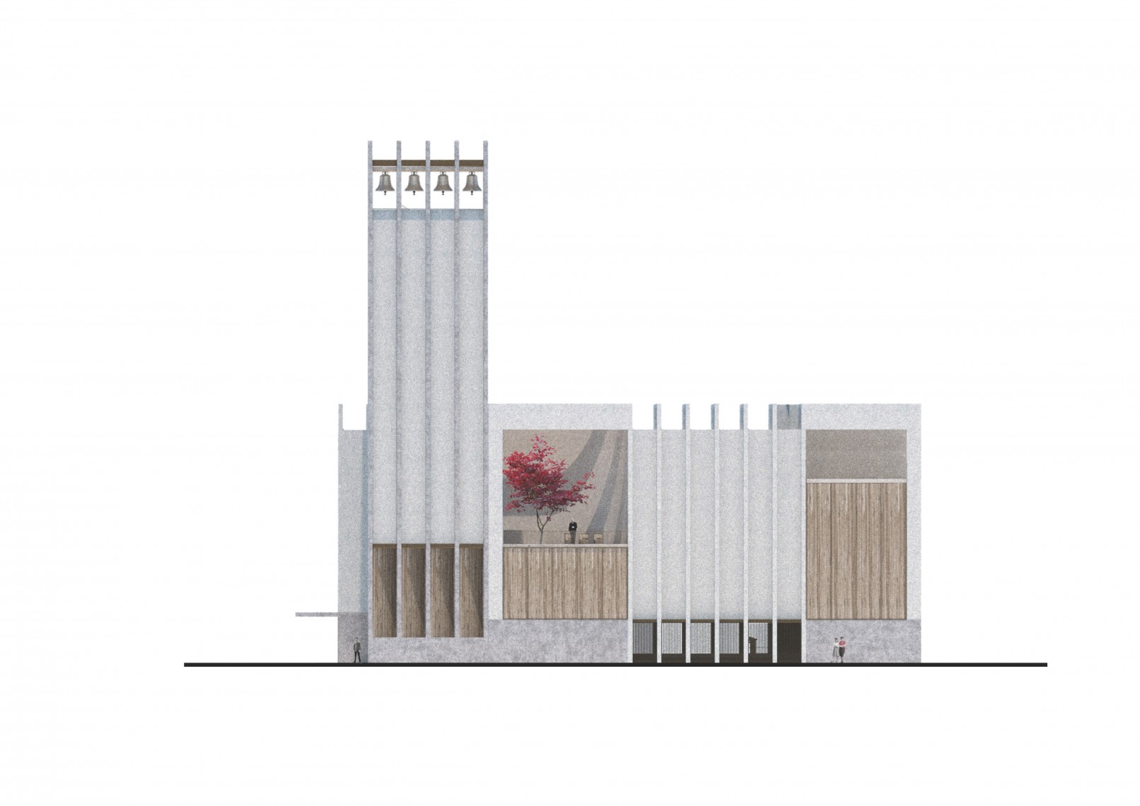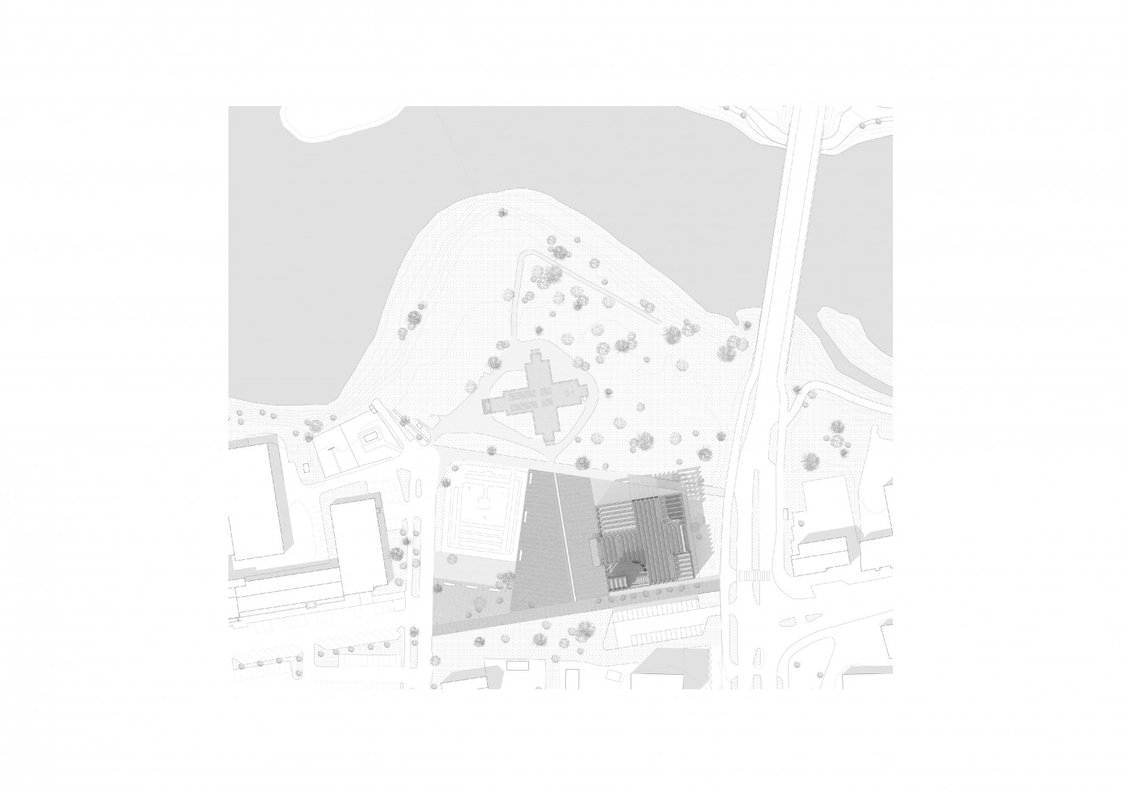 The competition brief asked for a new parish church to replace the former construction burned a few years ago. Based on these sensitive premises the new proposal maintains a continue dialogue with the remains, its location, dimensions and shape are influenced by the pre-existing construction.
