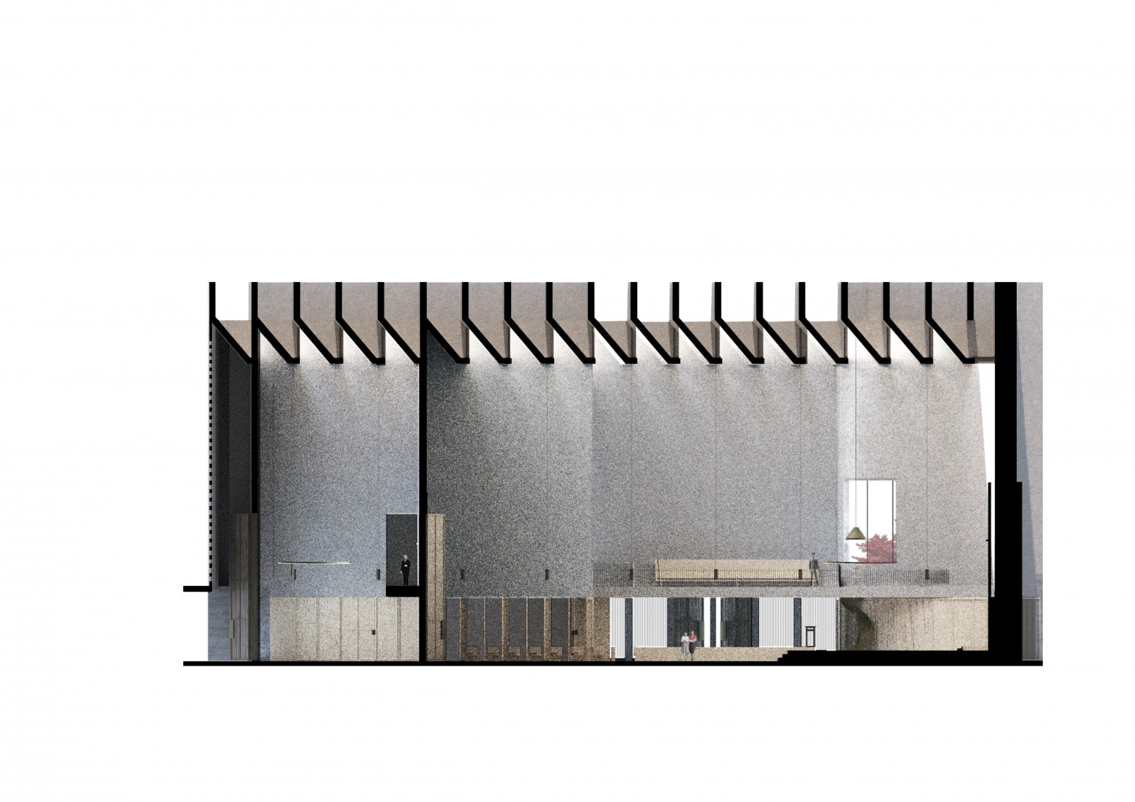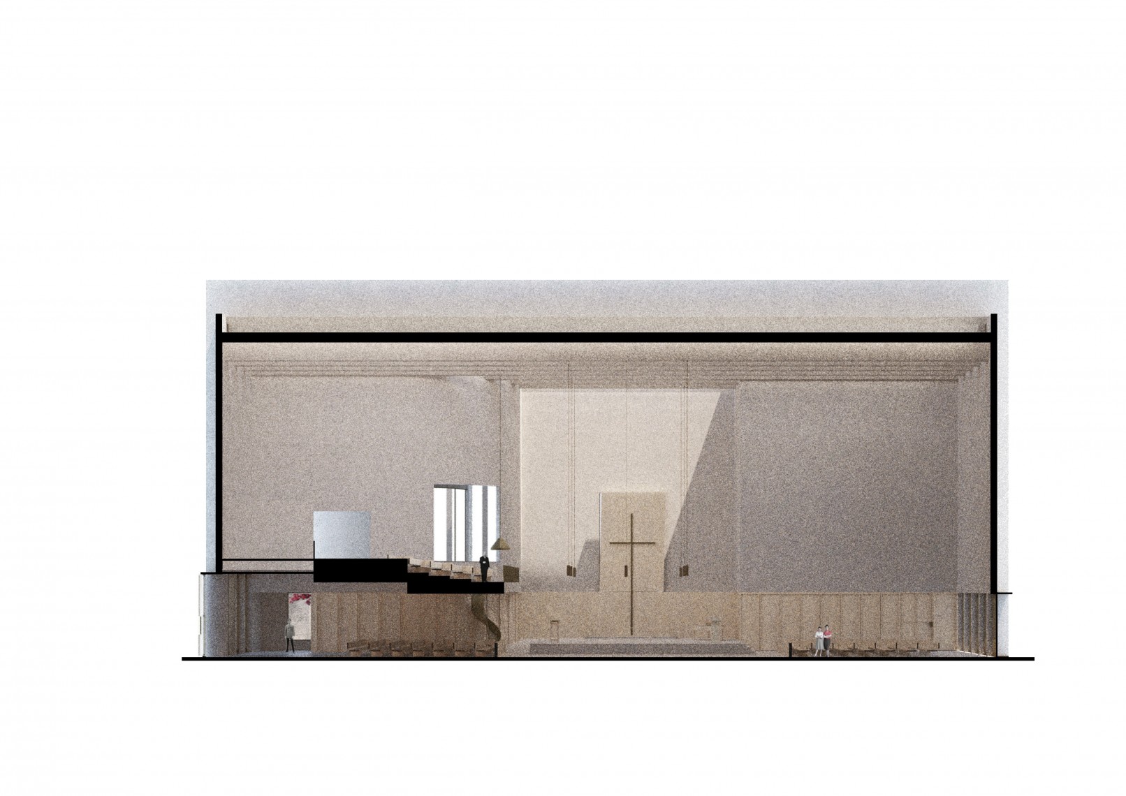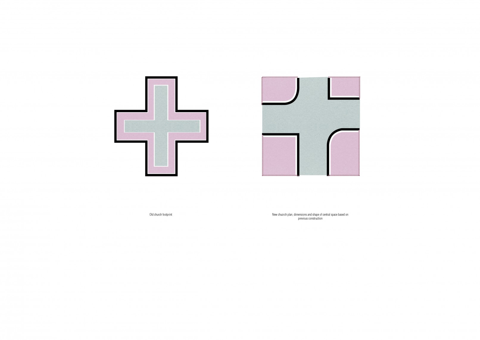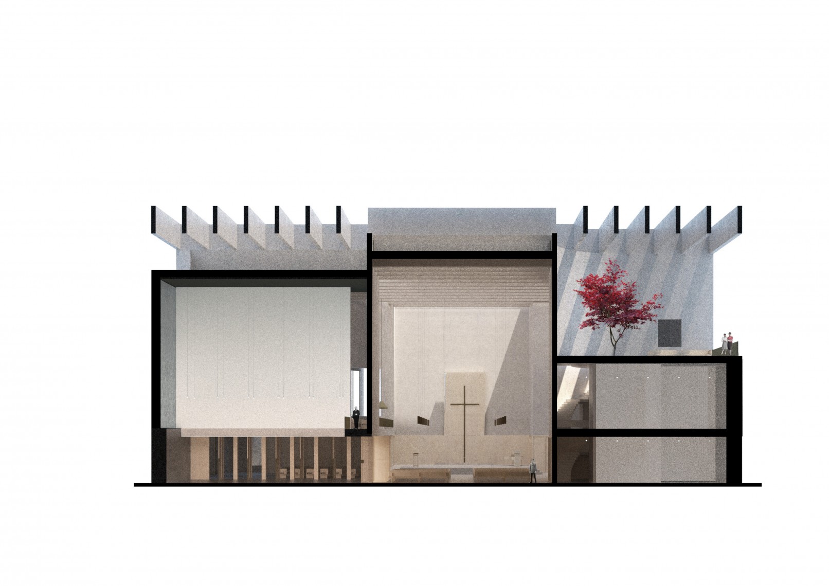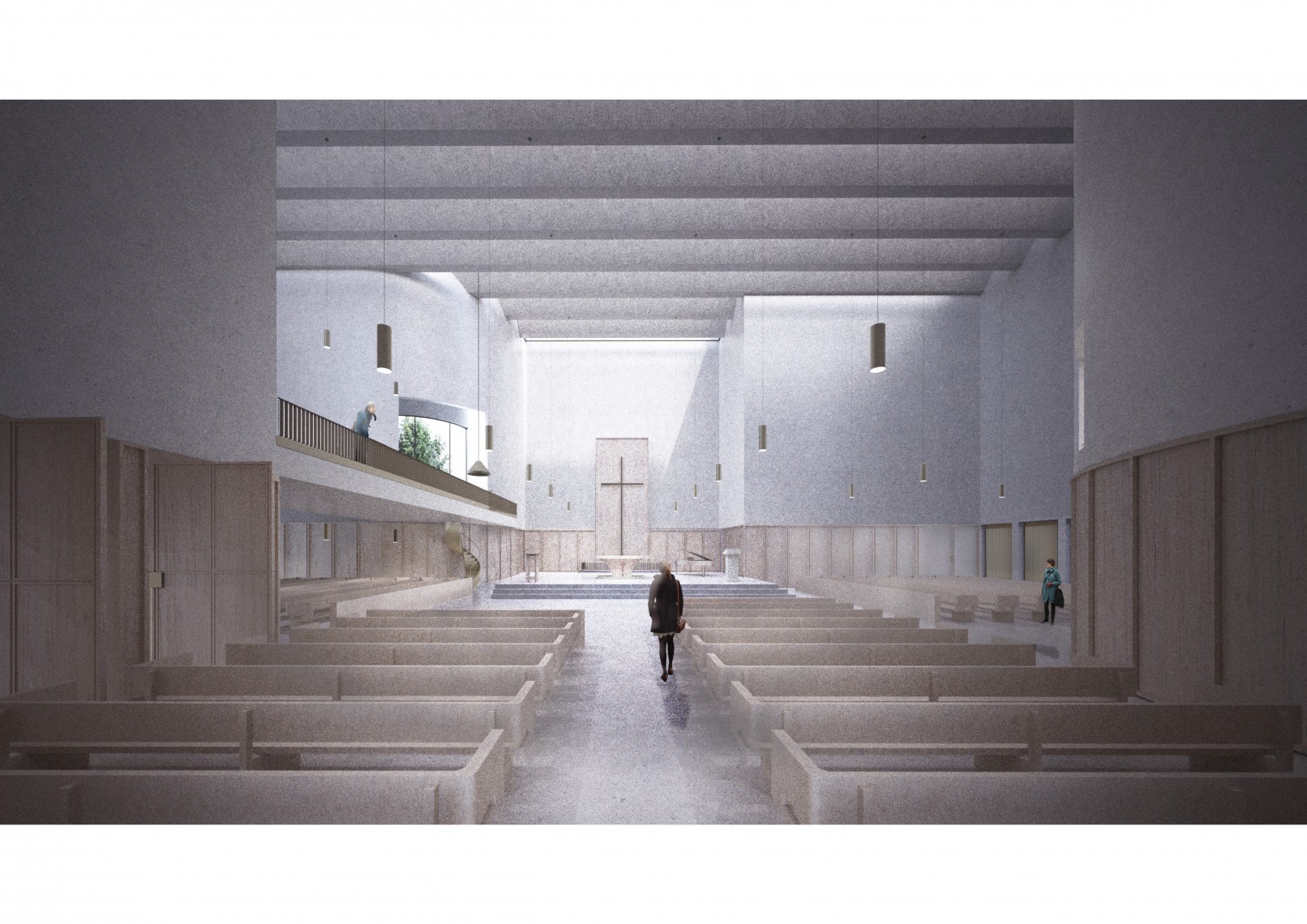 The new plan replicates the form of a cross from the old church and keeps its dimensions and orientation, following the Christian tradition. The pitched roof is replaced with a flat ceiling, a series of concrete ribs and skylights, to introduce natural zenith lighting into the altar and pray room.