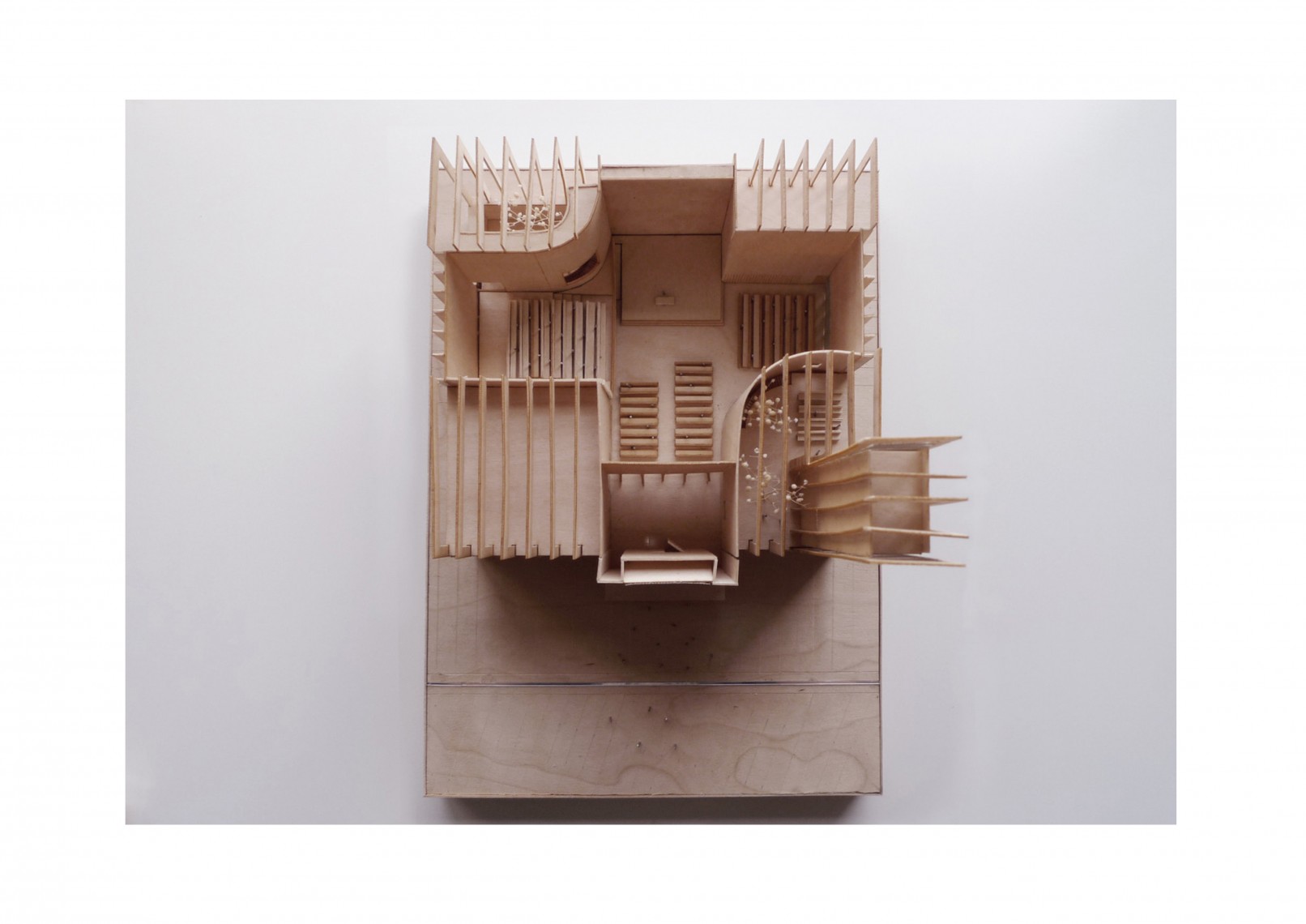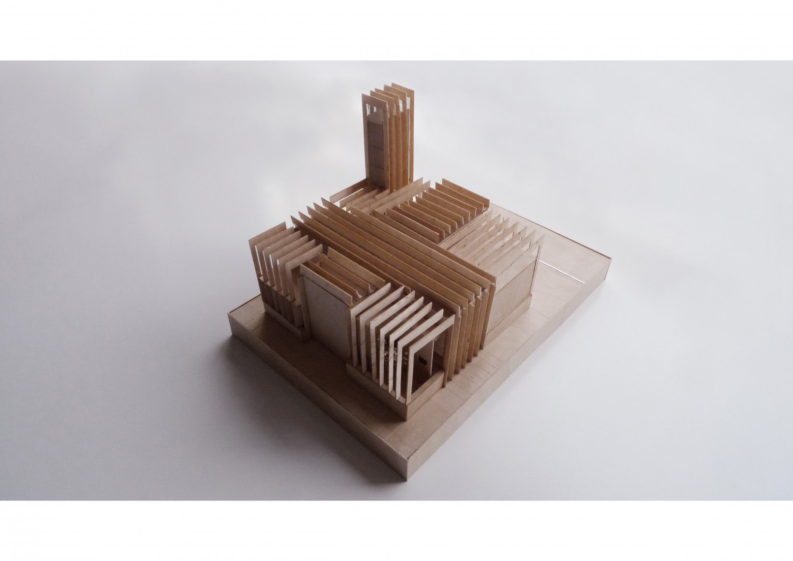 The structural elements are made in concrete, present in the party walls defining the internal cross and ceiling ribs, while cladding and internal finishes are made in timber with metal fittings.